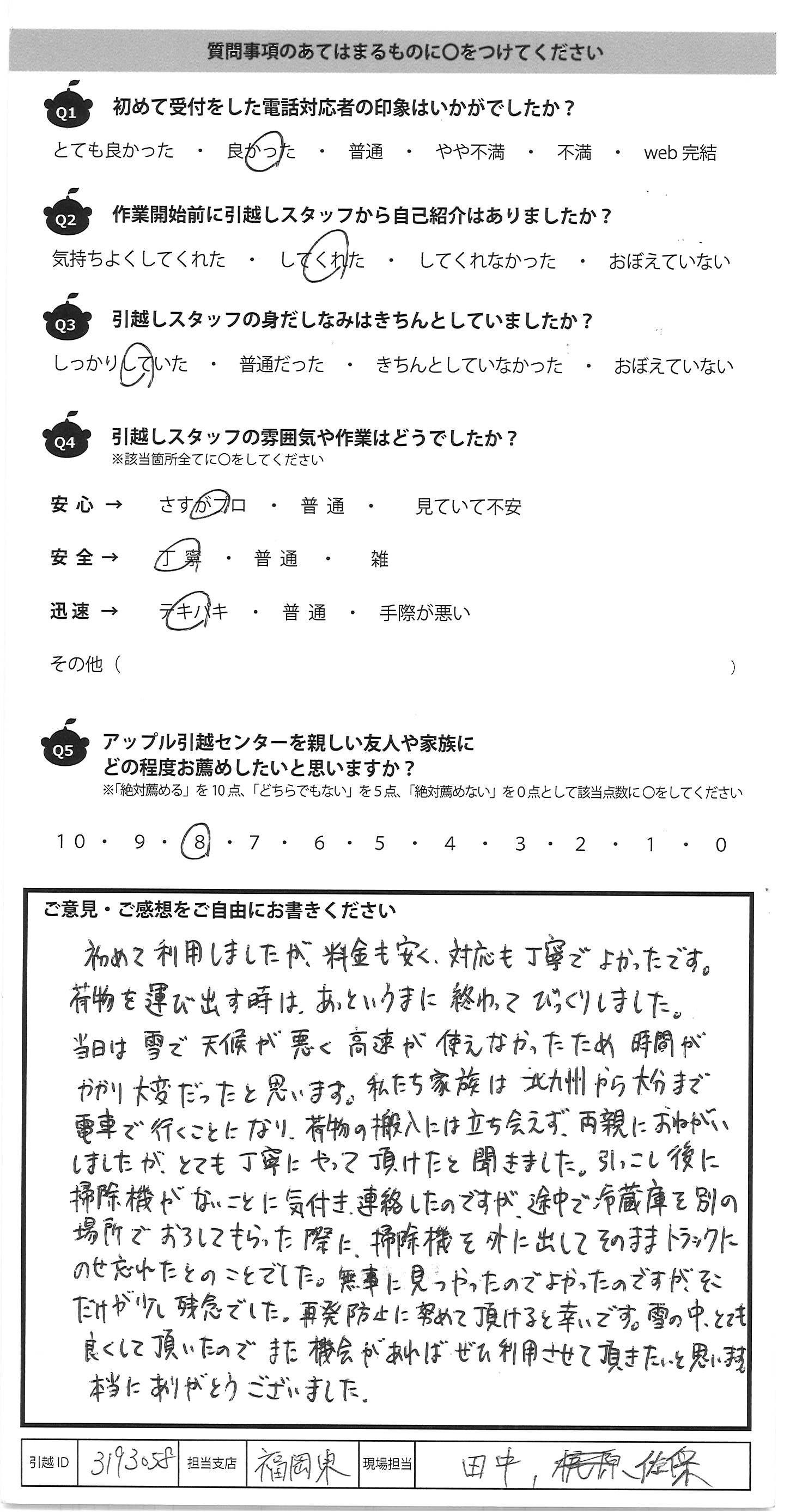 A.初めて利用しましたが、料金も安く、対応も丁寧でよかったです。 荷物を運び出す時は、あっというまに終わってびっくりしました。 当日は雪で天候が悪く高速が使えなかったため時間が かかり大変だったと思います。私たち家族は北九州から大分まで 電車で行くことになり、荷物の搬入には立ち会えず、両親におねがい しましたが、とても丁寧にやって頂けたと聞きました。引っこし後に 掃除機がないことに気付き、連絡したのですが、途中で冷蔵庫を別の 場所でおろしてもらった際に、掃除機を外に出してそのままトラックに のせ忘れたとのことでした。無事に見つかってよかったのですが、そこ だけが少し残念でした。再発防止に努めて頂けると幸いです。雪の中、とても 良くして頂いたのでまた機会があればぜひ利用させて頂きたいと思います。 本当にありがとうございました。
