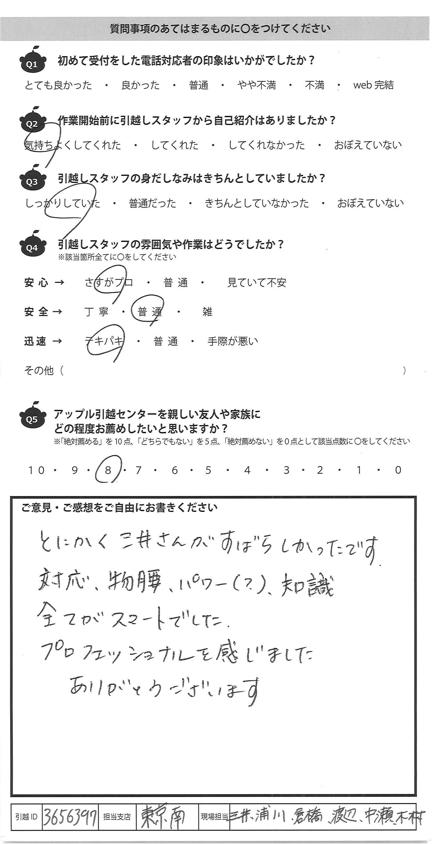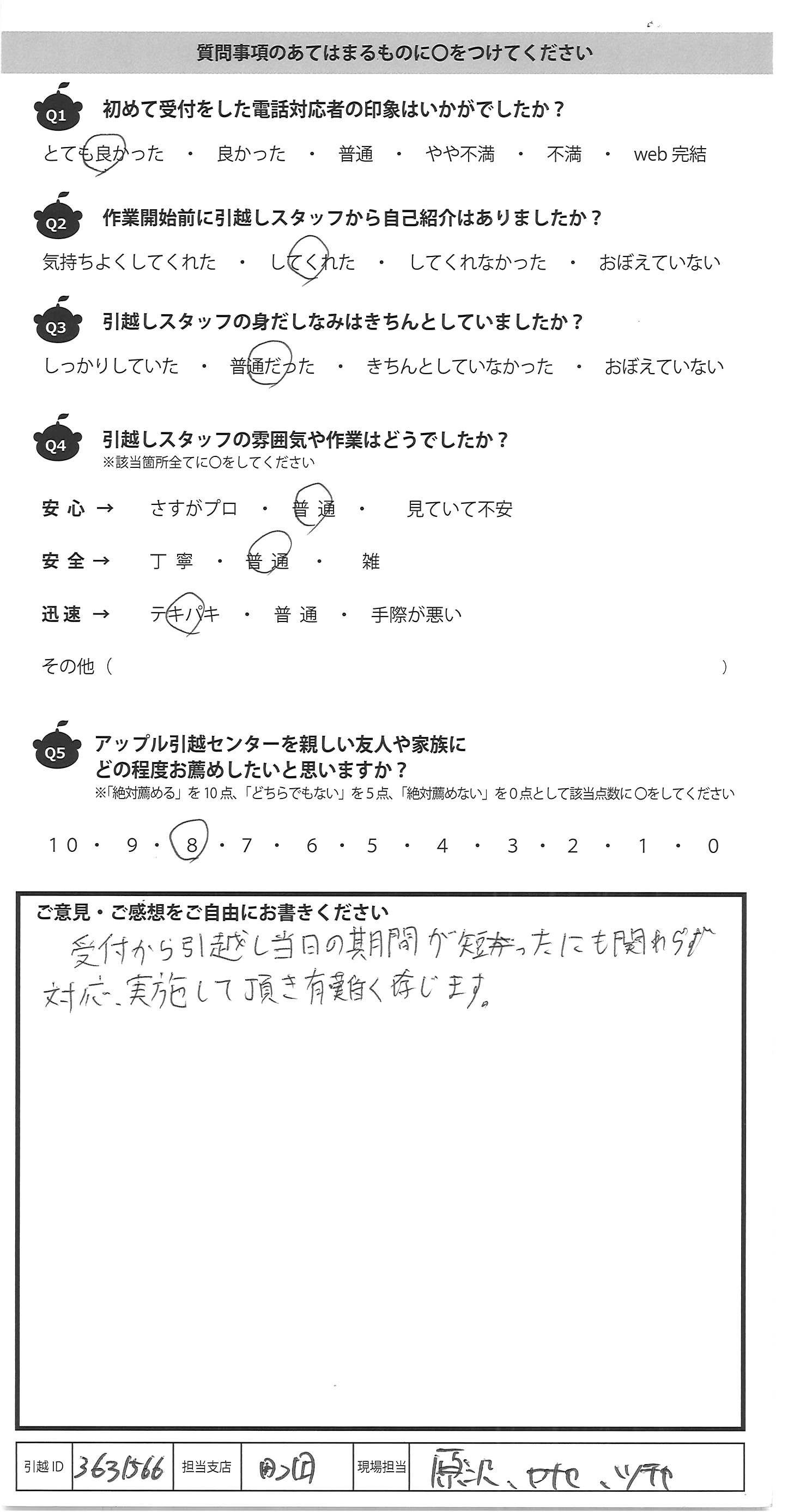 A.受付から引越し当日の期間が短ったにも関わらず 対応、実施して頂き有難く存じます。