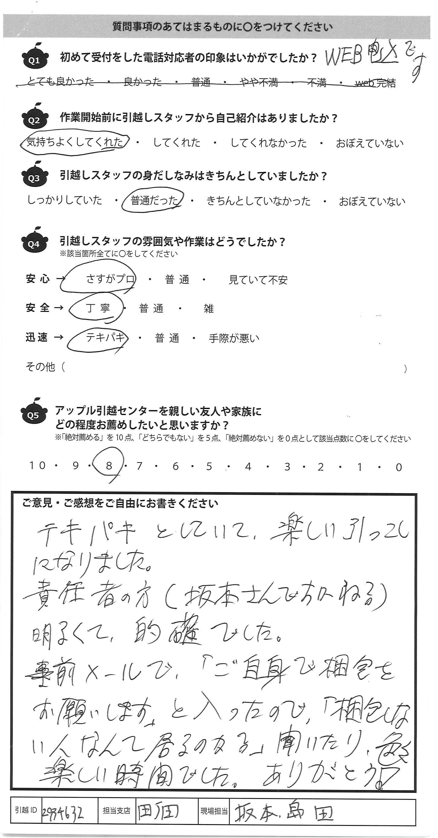 A.テキパキとしていて、楽しい引っこし になりました。 責任者の方(坂本さんですかね?) 明るくて、的確でした。 事前メールで、「ご自身で梱包を お願いします」と入ったので、「梱包しな い人なんて居るのか?」聞いたり、色々 楽しい時間でした。ありがとう!