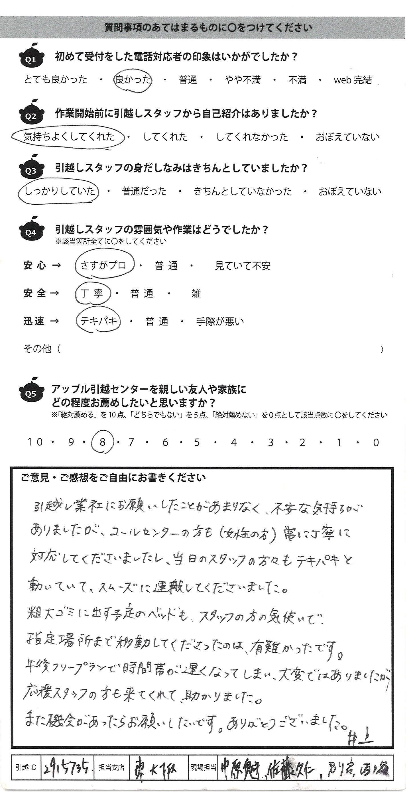 A.引越し業社にお願いしたことがあまりなく、不安な気持ちが ありましたが、コールセンターの方も(女性の方)常に丁寧に 対応してくださいましたし、当日のスタッフの方々もテキパキと 動いていて、スムーズに運搬してくださいました。 粗大ゴミに出す予定のベッドも、スタッフの方の気使いで、 指定場所まで移動してくださったのは、有難かったです。 午後フリープランで時間帯が遅くなってしまい、大変ではありましたが 応援スタッフの方も来てくれて、助かりました。 また機会があったらお願いしたいです。ありがとうございました。