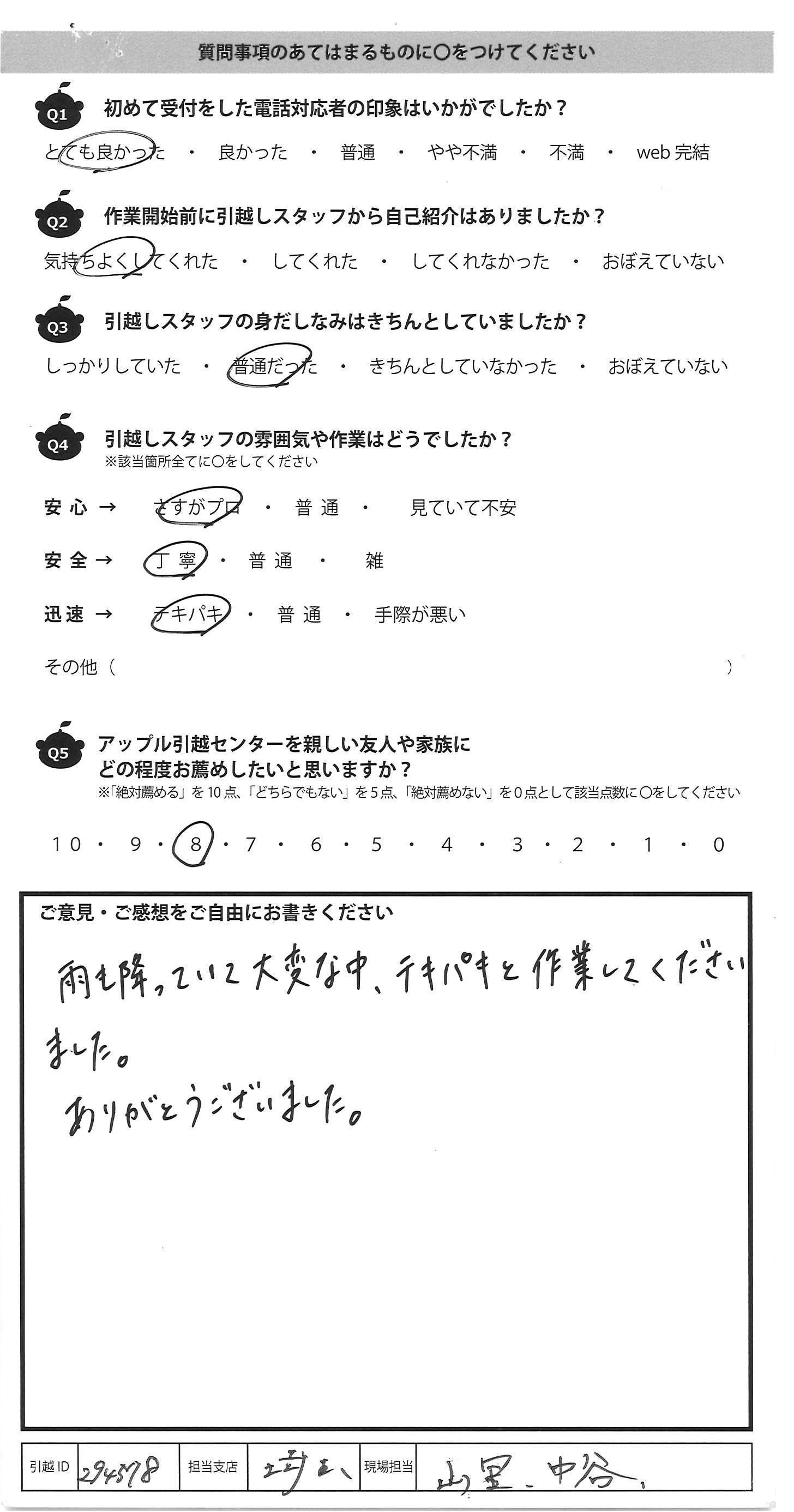A.天候の悪い中、快く引き受けていただきテキパキ作業をしていただきました。 当日、台風もあってか少し遅延してのスタートとなりましたが、本部の方から事前にご連絡頂け助かりました。電話やメールでご対応いただいた方も皆様丁寧にご対応いただきました。 迅速に作業いただき、悪天候の中でも無事に引っ越しを終えることができました。 今回の引越しまで、失礼ながら存じ上げなかったのですが、不用品引き取りも同時にお願いできる効率性と費用面、ご対応クオリティすべて感動的で、また引越しする際にはぜひご相談させていただきたいと思いました。 今回は本当にありがとうございました。