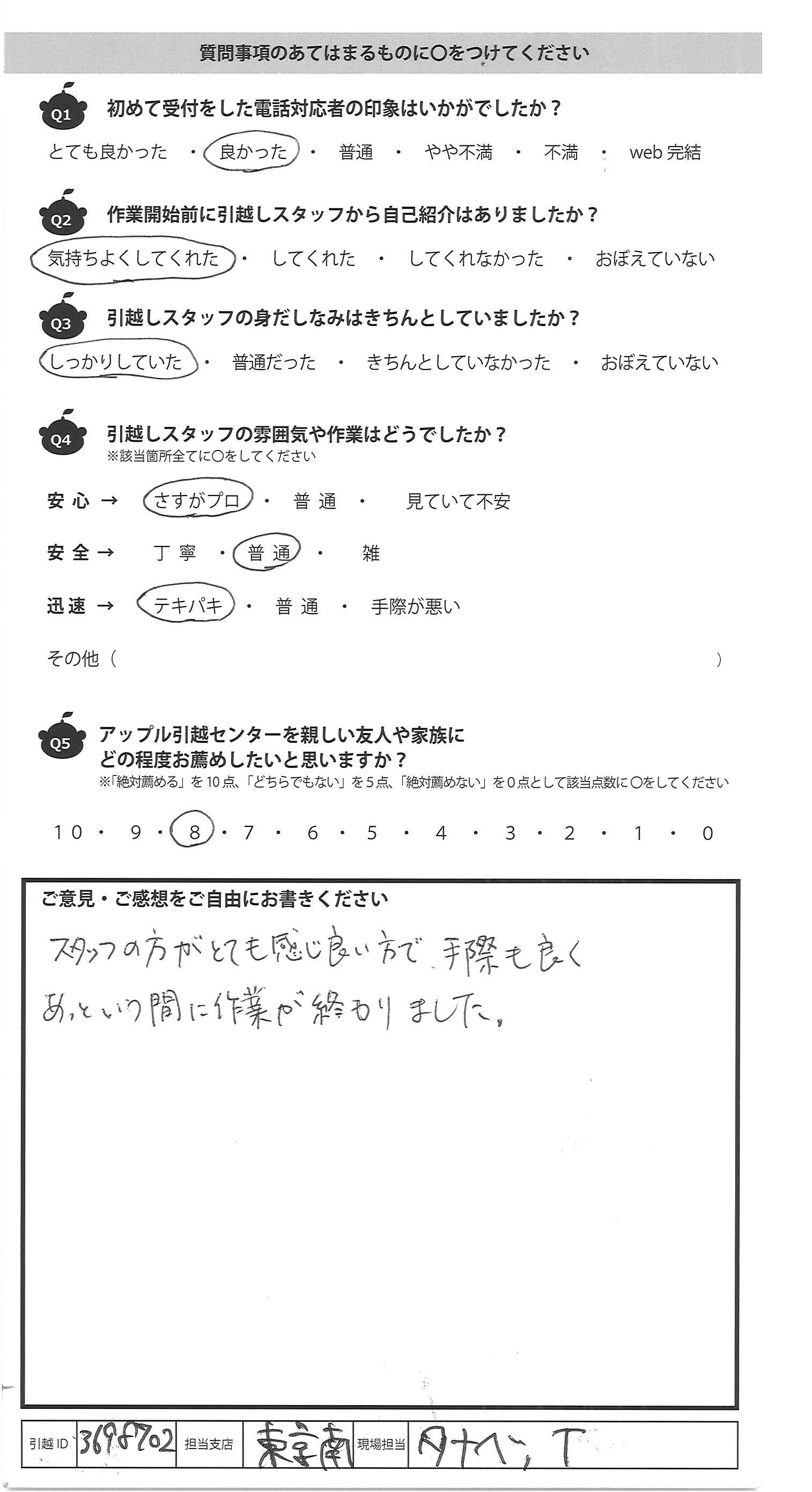 A.迅速かつ丁寧にお引っ越しいただきました。ありがとうございました。