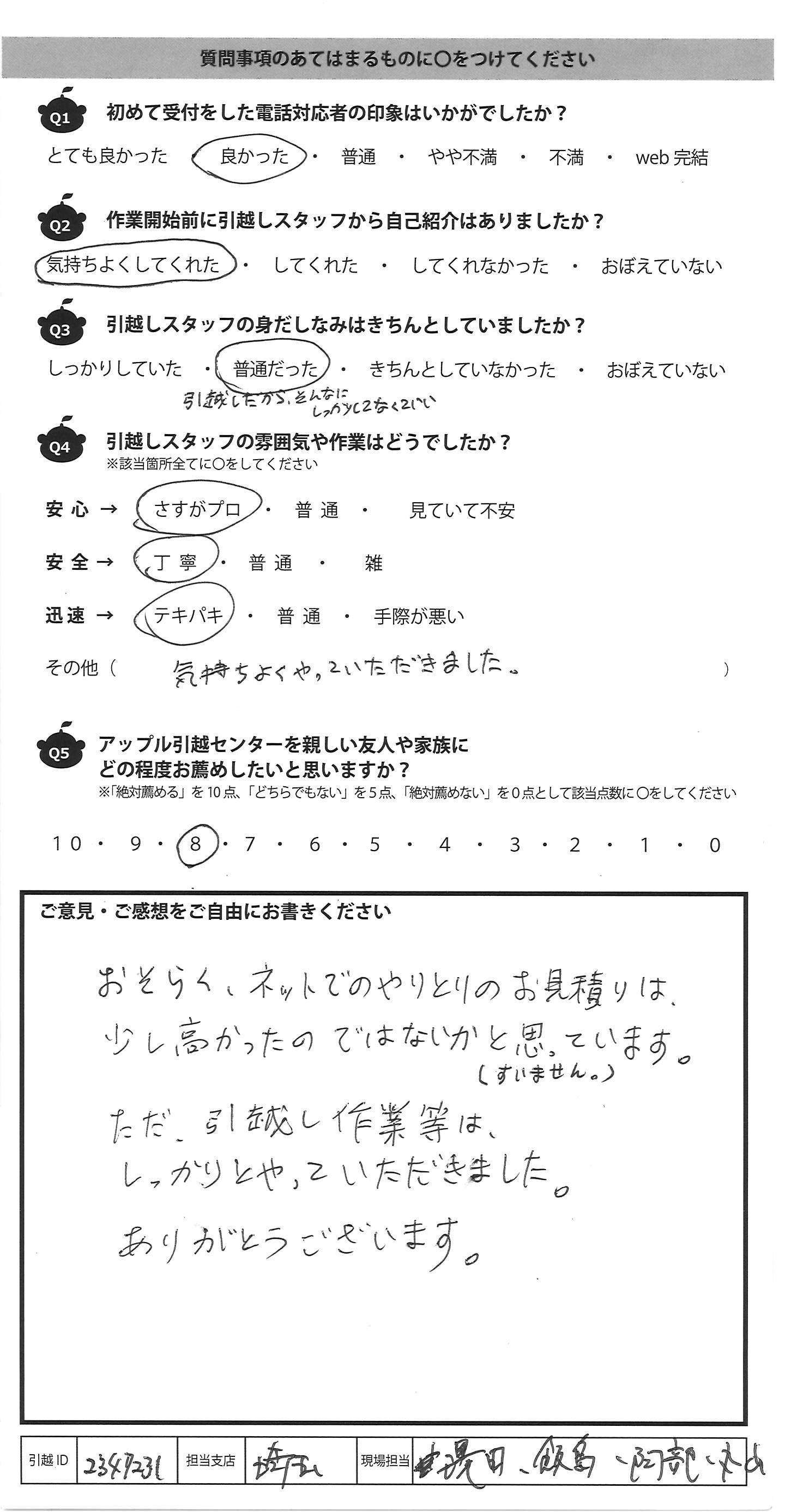 A.おそらく、ネットでのやりとりのお見積りは 少し高かったのではないかと思っています。(すみません。) ただ、引越し作業等は、 しっかりとやっていただきました。 ありがとうございます。
