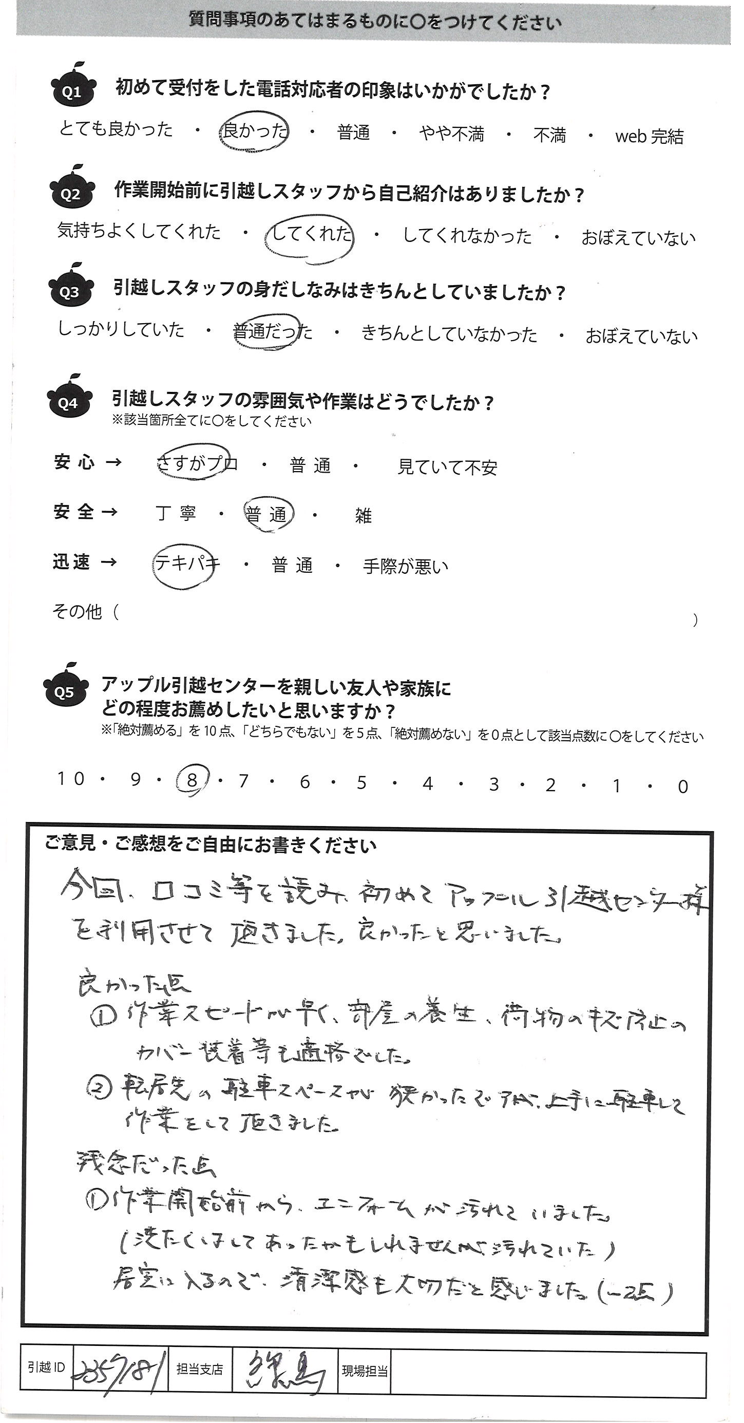 A.今回、口コミ等を読み初めてアップル引越センター様 を利用させて頂きました。良かったと思いました。 良かった点 ①作業スピードが早く、部屋の養生、荷物のキズ防止の カバー塗着等も適格でした。 ②転居先の駐車スペースが狭かった 作業をして頂きました。 残念だった点 ①作業開始前からユニフォームが汚れていました。 (洗たくはしてあったかもしれませんが汚れていた) 居室に入るので、清潔感も大切だと感じました(-2点)
