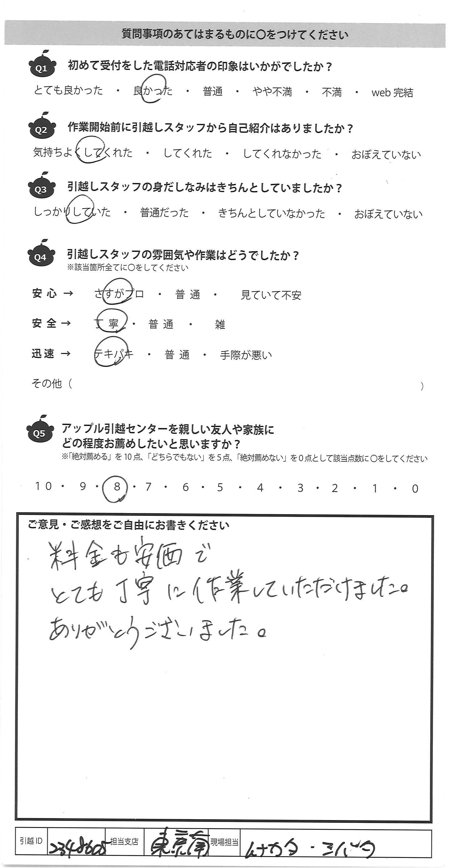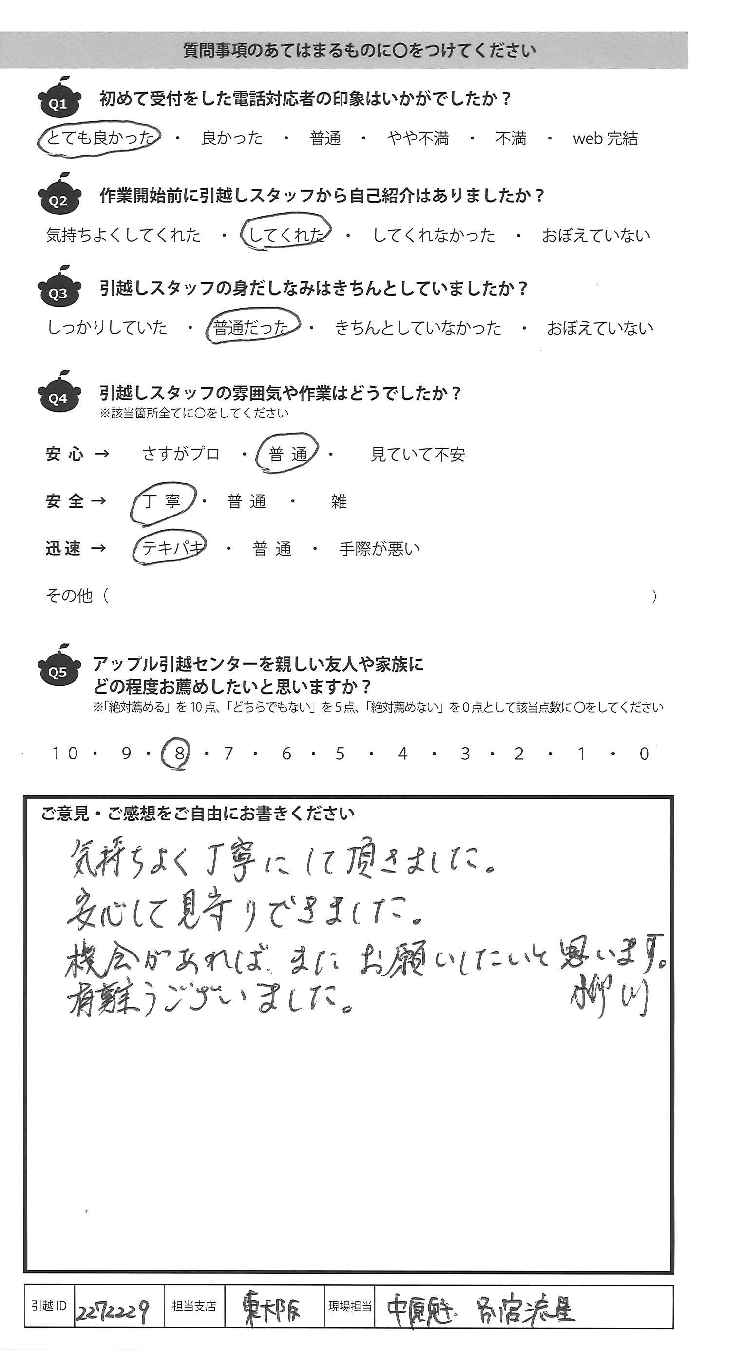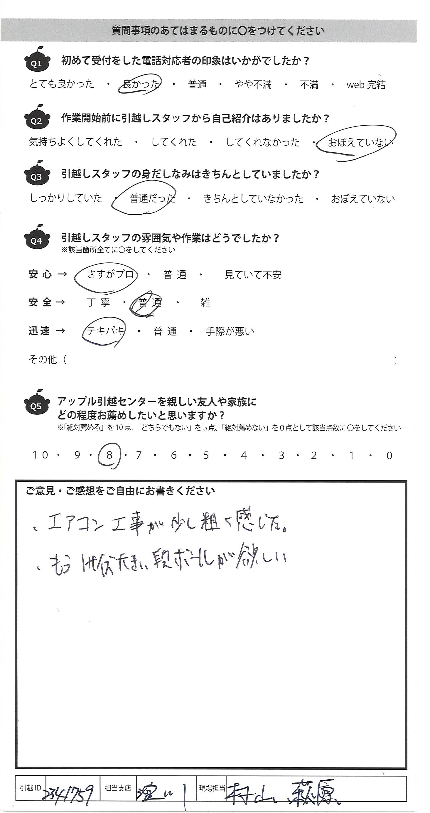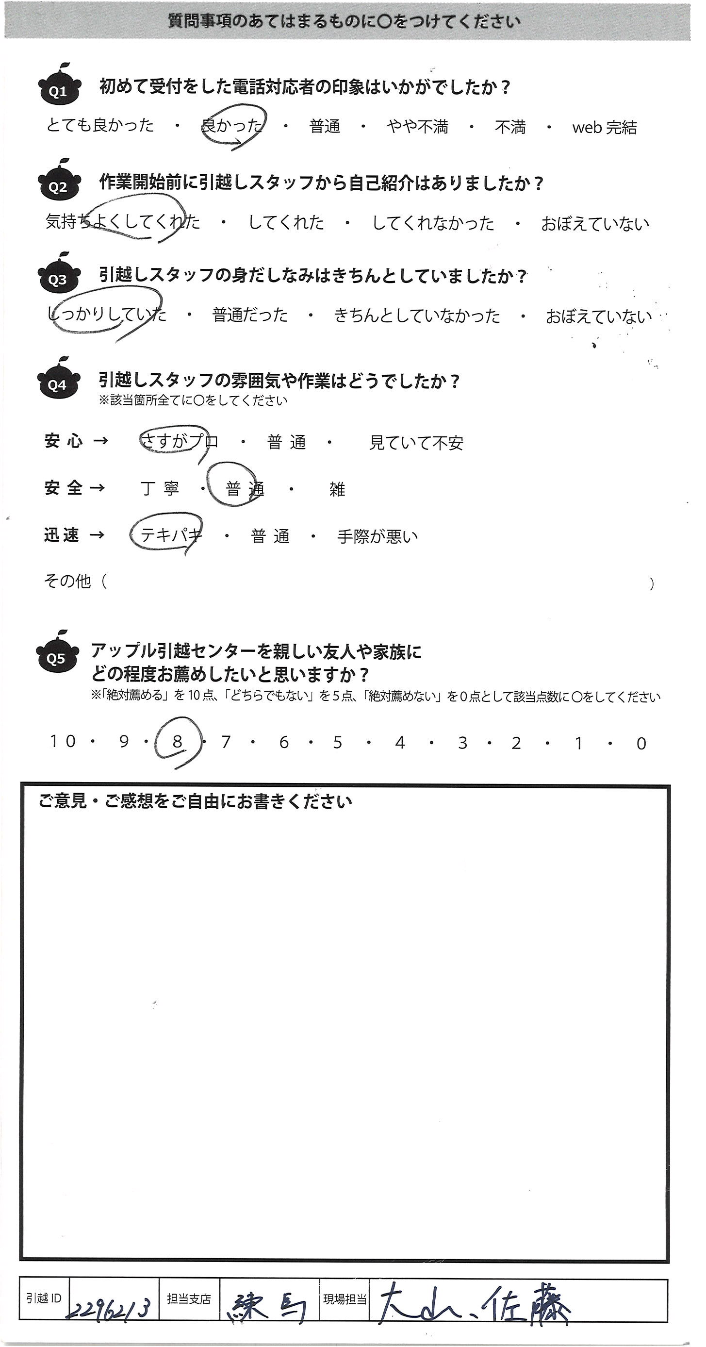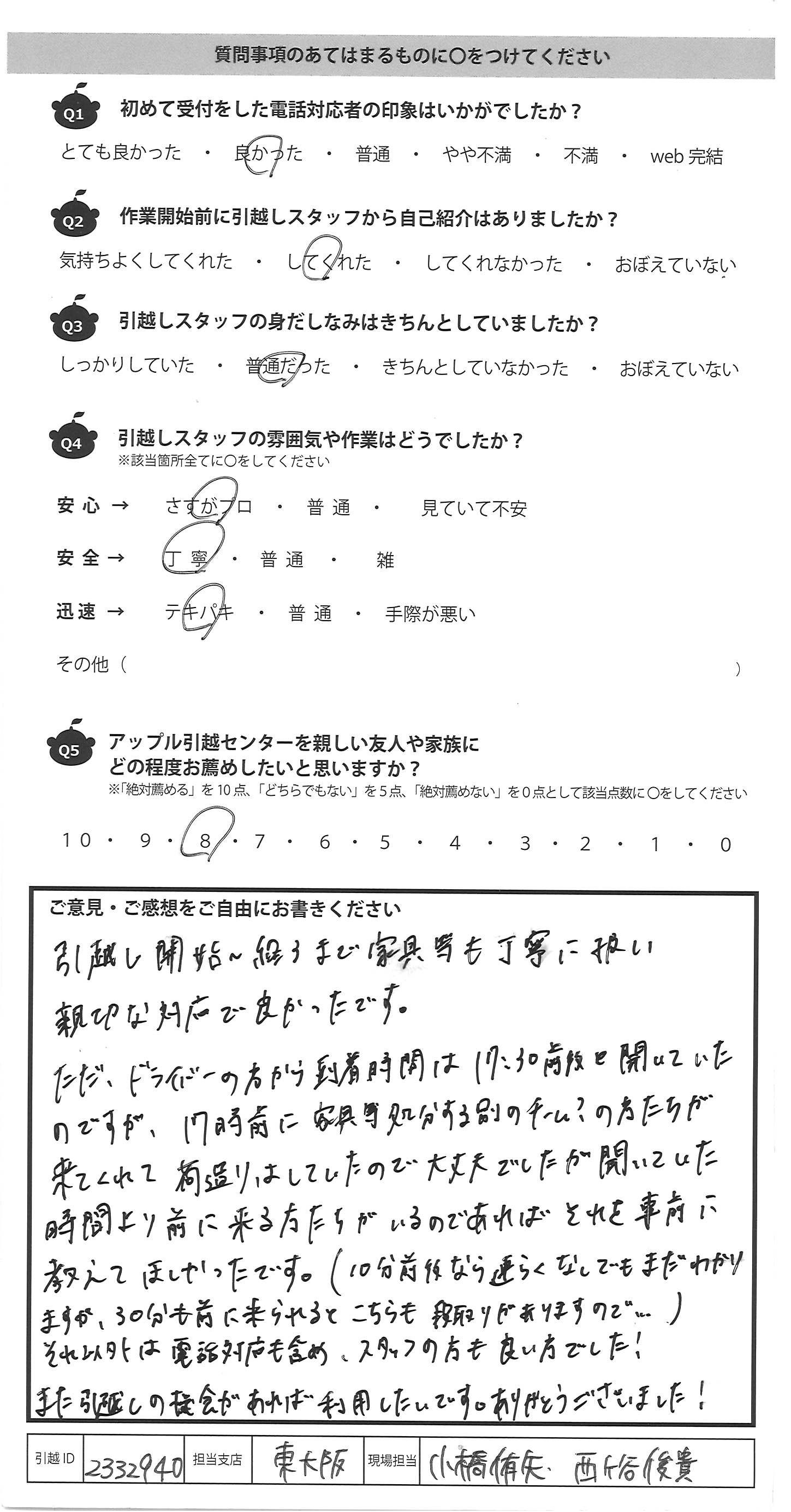 A.引越し開始~終了まで家具等も丁寧に扱い 親切な対応で良かったです。 ただ、ドライバーの方から到着時間は17:30前後と聞いていた のですが、17時前に家具等処分する別のチーム?の方たちが 来てくれて荷造りはしていたので大丈夫でしたが聞いていた 時間より前に来る方たちがいるのであればそれを事前に 教えてほしかったです。(10分前後なら連絡なしでもまだわかり ますが、30分も前に来られるとこちらも段取りがありますので・・・) それ以外は電話対応も含め、スタッフの方も良い方でした! また引越しの機会があれば利用したいです。ありがとうございました!