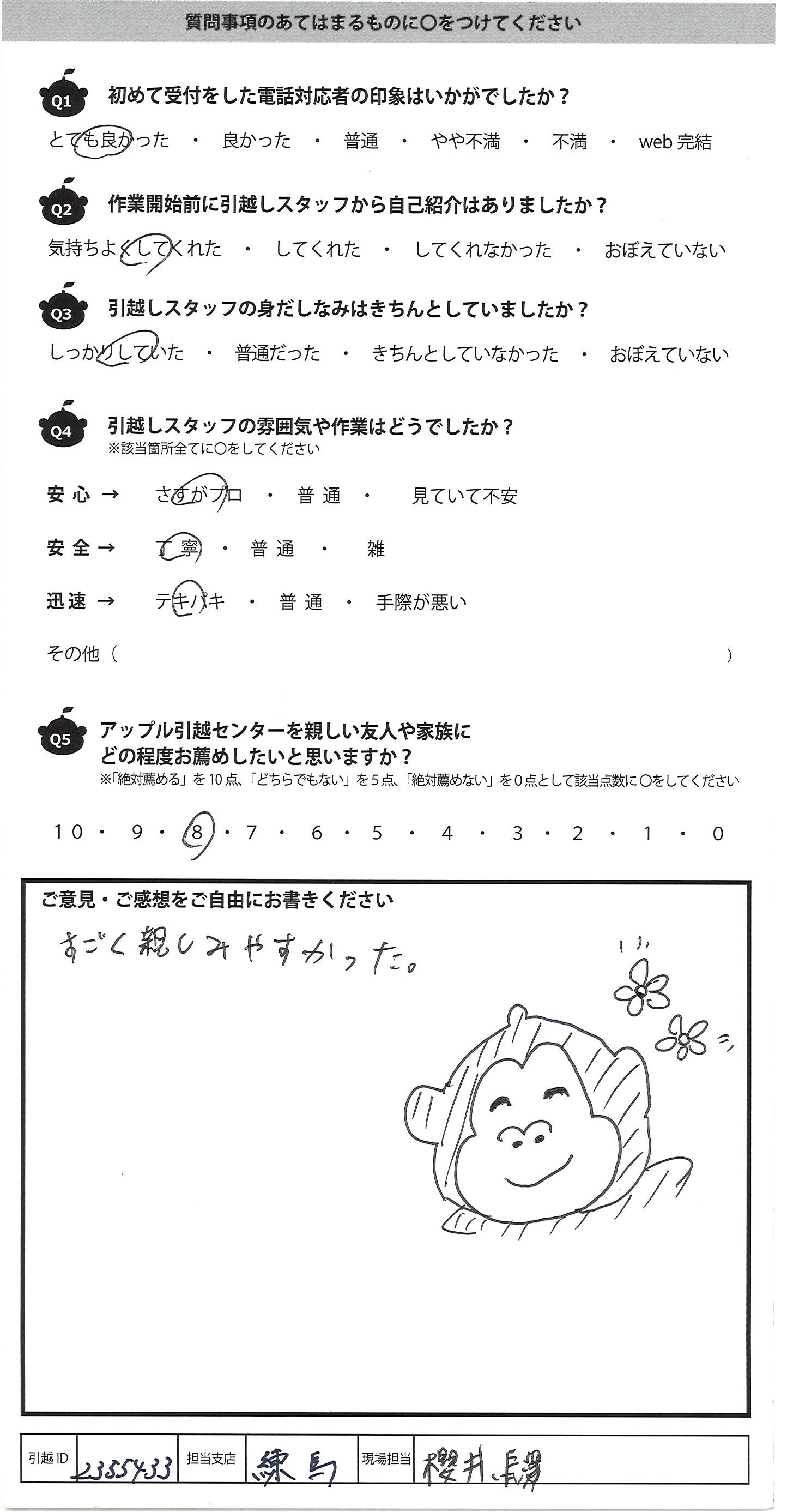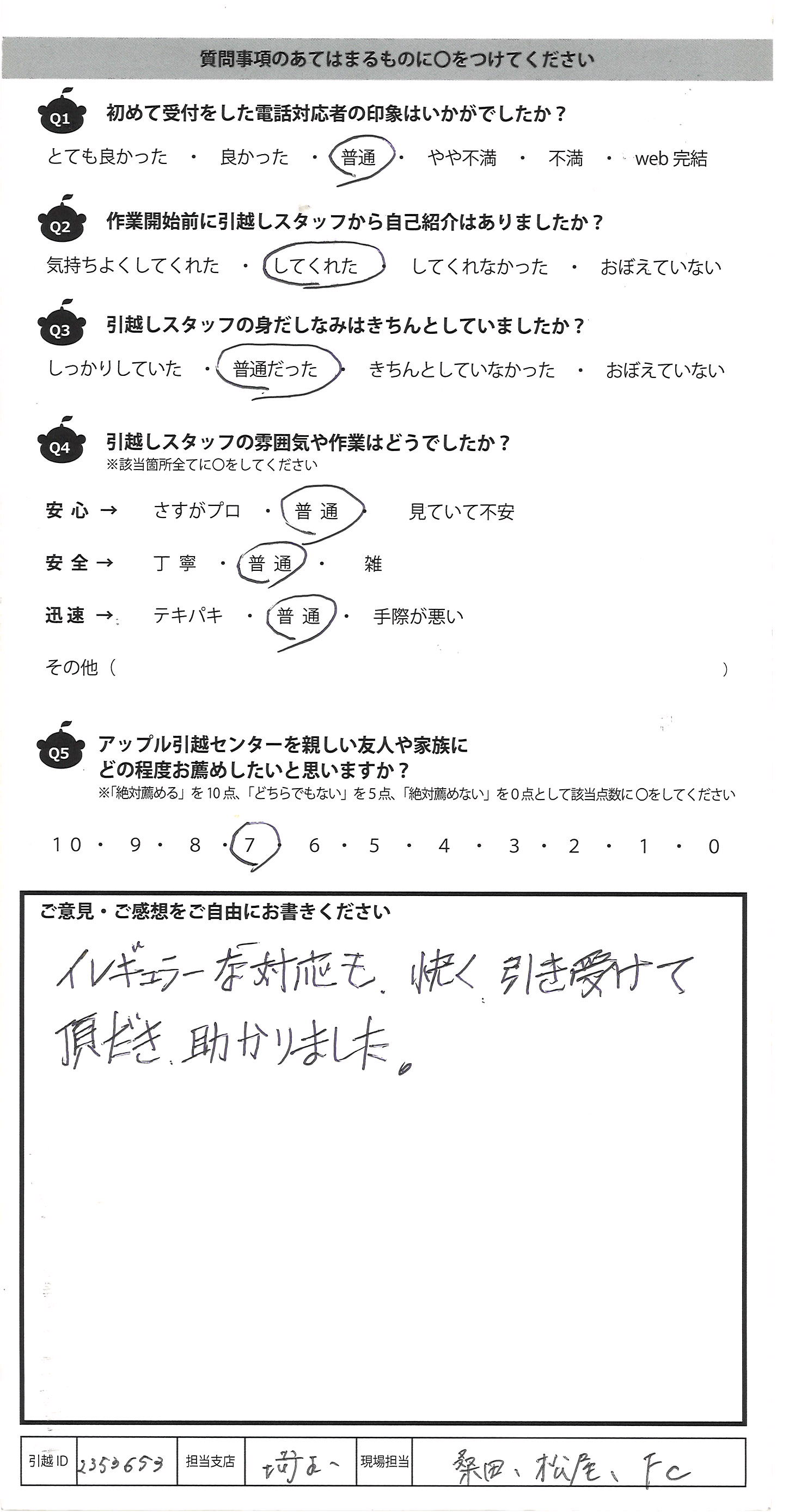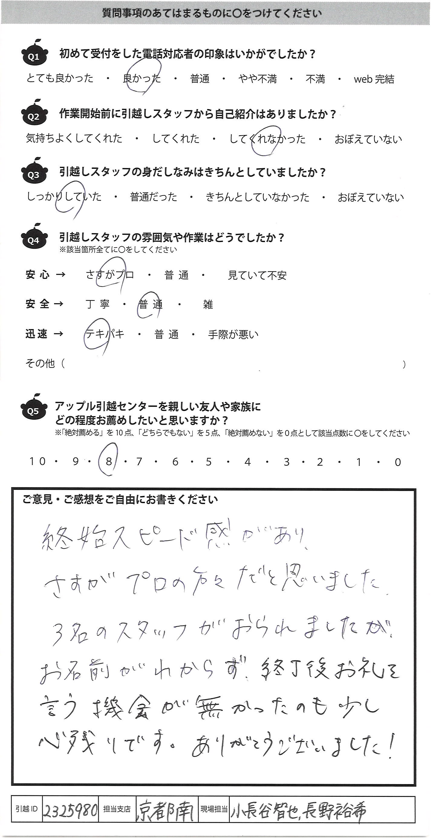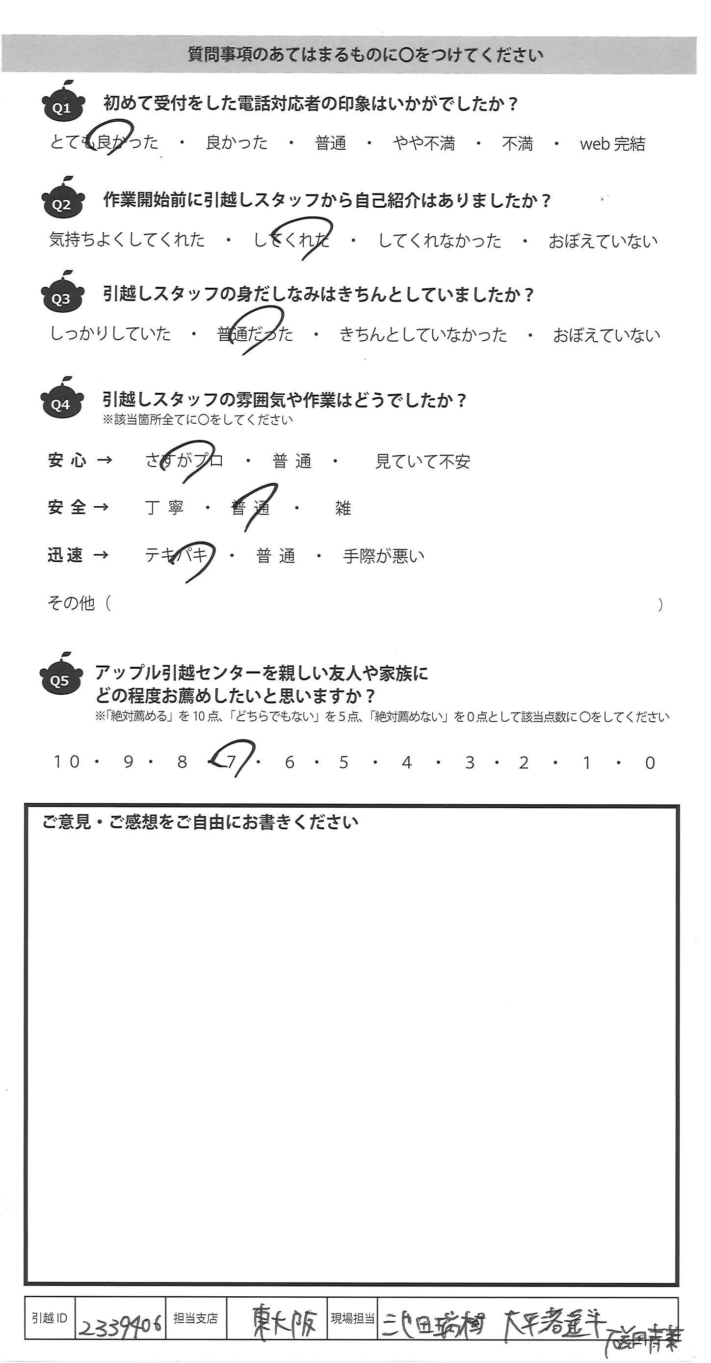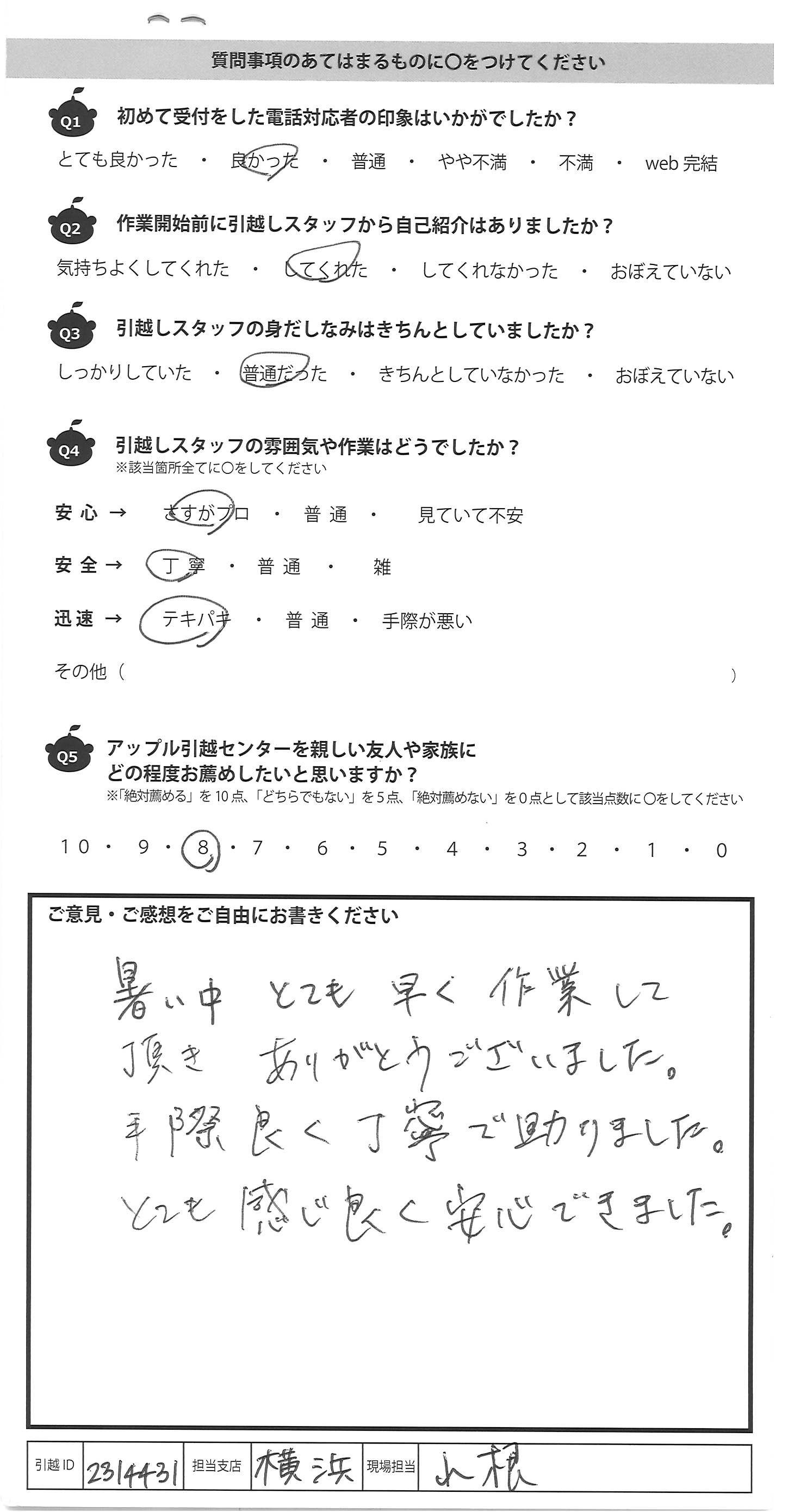 A.引越し開始~終了まで家具等も丁寧に扱い 親切な対応で良かったです。 ただ、ドライバーの方から到着時間は17:30前後と聞いていた のですが、17時前に家具等処分する別のチーム?の方たちが 来てくれて荷造りはしていたので大丈夫でしたが聞いていた 時間より前に来る方たちがいるのであればそれを事前に 教えてほしかったです。(10分前後なら連絡なしでもまだわかり ますが、30分も前に来られるとこちらも段取りがありますので・・・) それ以外は電話対応も含め、スタッフの方も良い方でした! また引越しの機会があれば利用したいです。ありがとうございました!