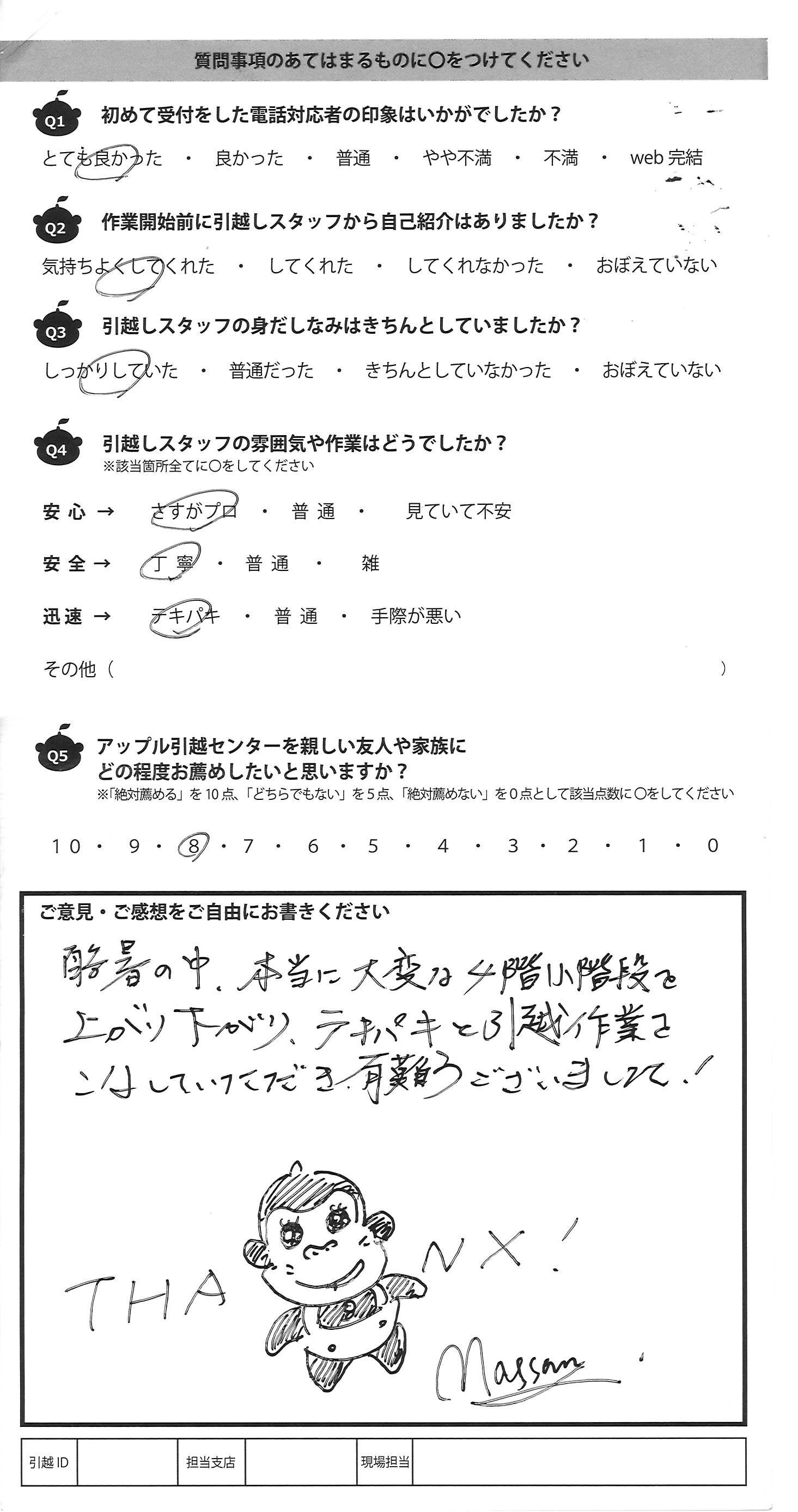 A.猛暑の中、本当に大変な4階 階段を 上がり下がり、テキパキと引越作業を こなしていただき、有難うございました!