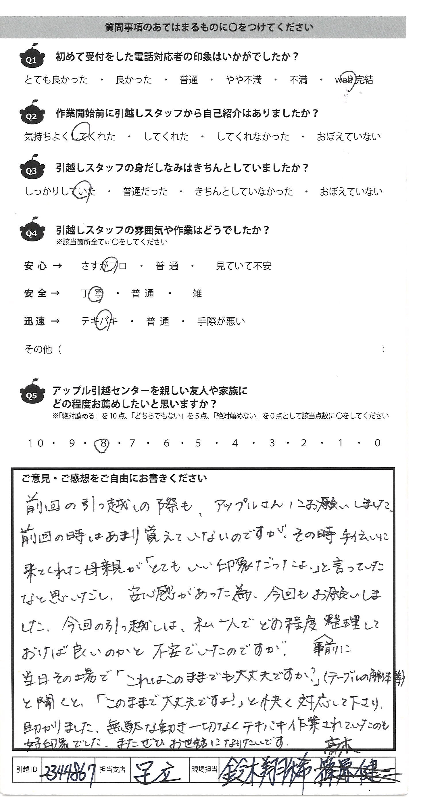 A.前回の引っ越しの際も、アップルさんにお願いしました。 前回の時はあまり覚えていないのですが、その時手伝いに 来てくれた母親が「とてもいい印象だったよ」と言っていた なと思いだし、安心感があった為、今回もお願いしま した。今回の引っ越しは、私一人でどの程度事前に整理して おけば良いのかと不安でいたのですが、 当日その場で「これはこのままでも大丈夫ですか?」(テーブルの解体等) と聞くと、「このままで大丈夫ですよ!」と快く対応して下さり、 助かりました。無駄な動き一切なくテキパキ作業されていたのも 好印象でした。またぜひお世話になりたいです。