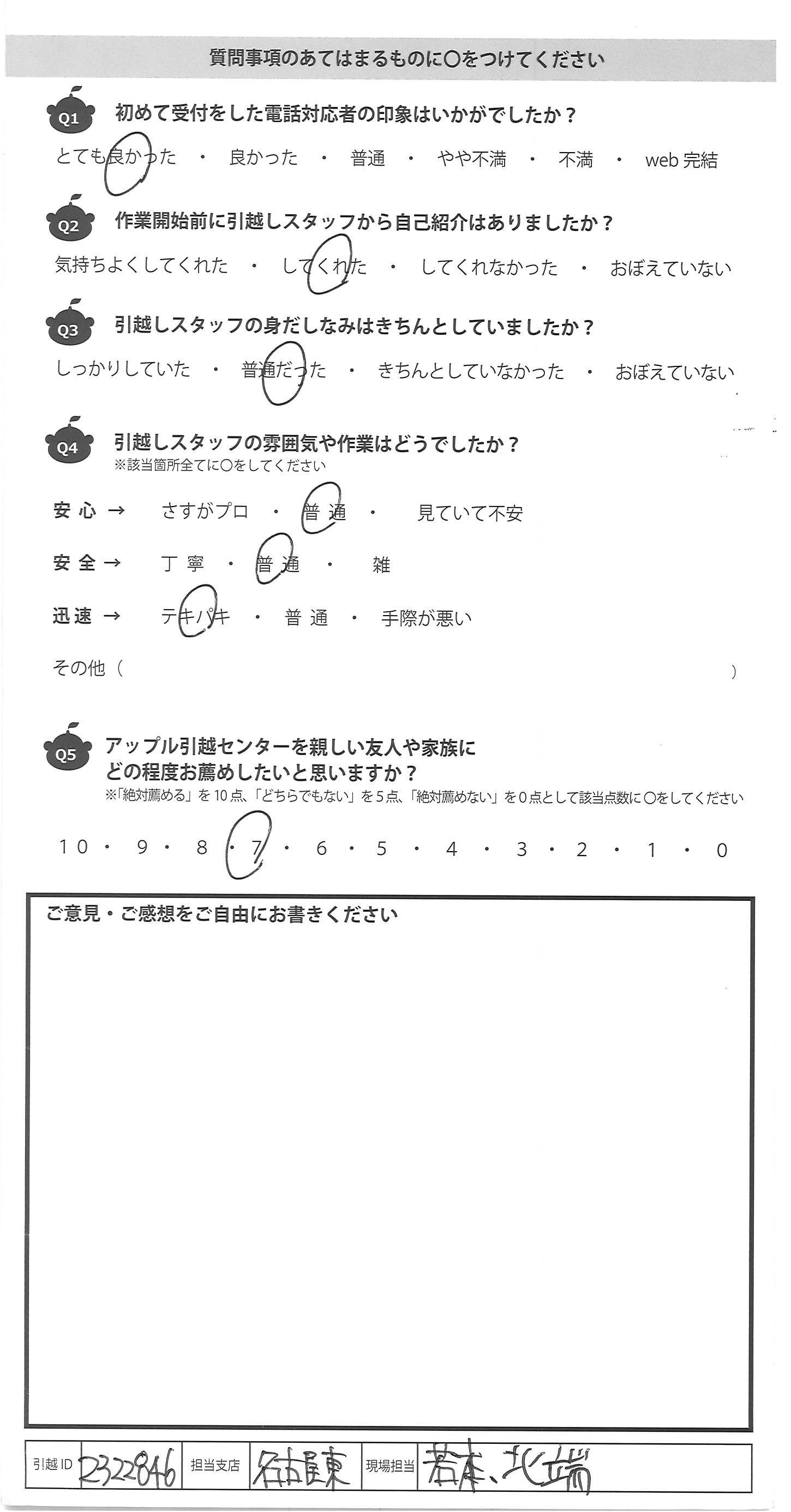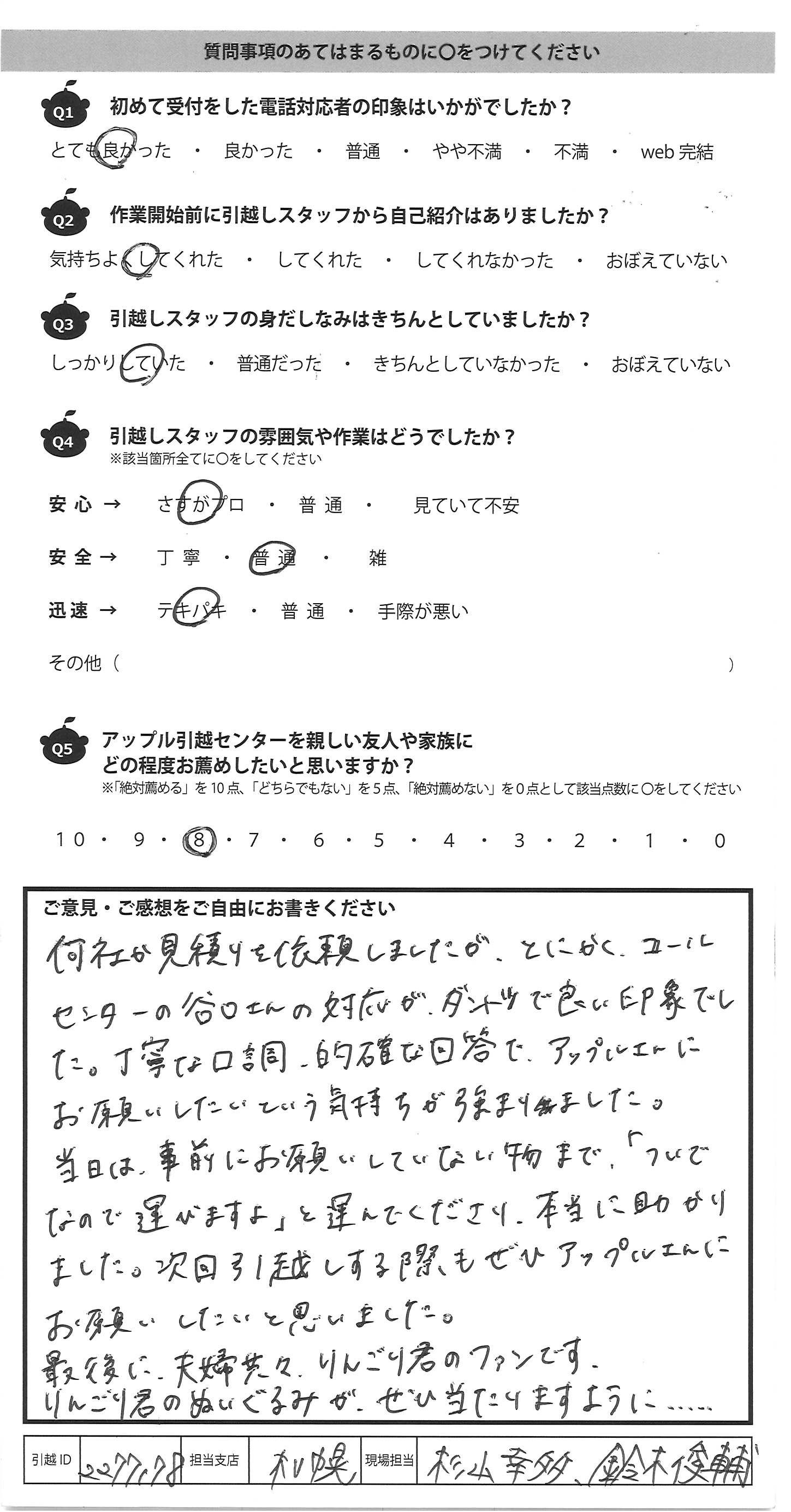 A.何社か見積を依頼しましたが、とのかくコール センターの谷口さんの対応がダントツで良い印象でし た。丁寧な口調、的確な回答で、アップルさんに お願いしたいという気持ちが強まりました。 当日は事前にお願いしていない物まで「ついで なので運びますよ」と運んでくださり、本当に助かり ました。次回引越しする際もぜひアップルさんに お願いしたいと思いました。 最後に夫婦共々、りんごり君のファンです。 りんごり君のぬいぐるみがぜひ当たりますように・・・