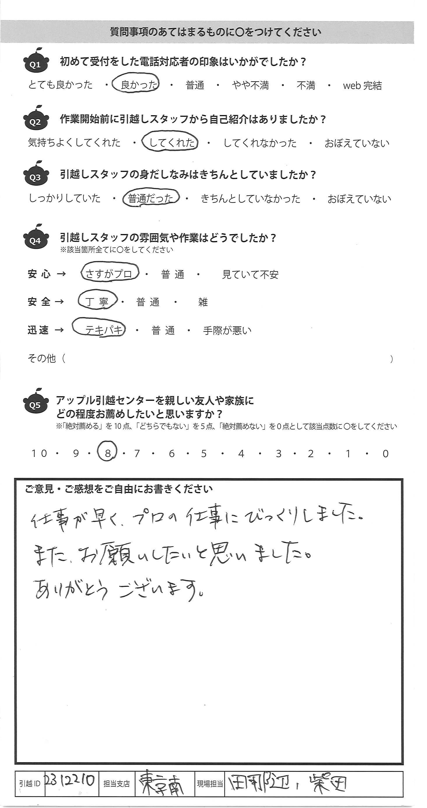 A.仕事が早く、プロの仕事にびっくりしました。 また、お願いしたいと思いました。 ありがとうございます。