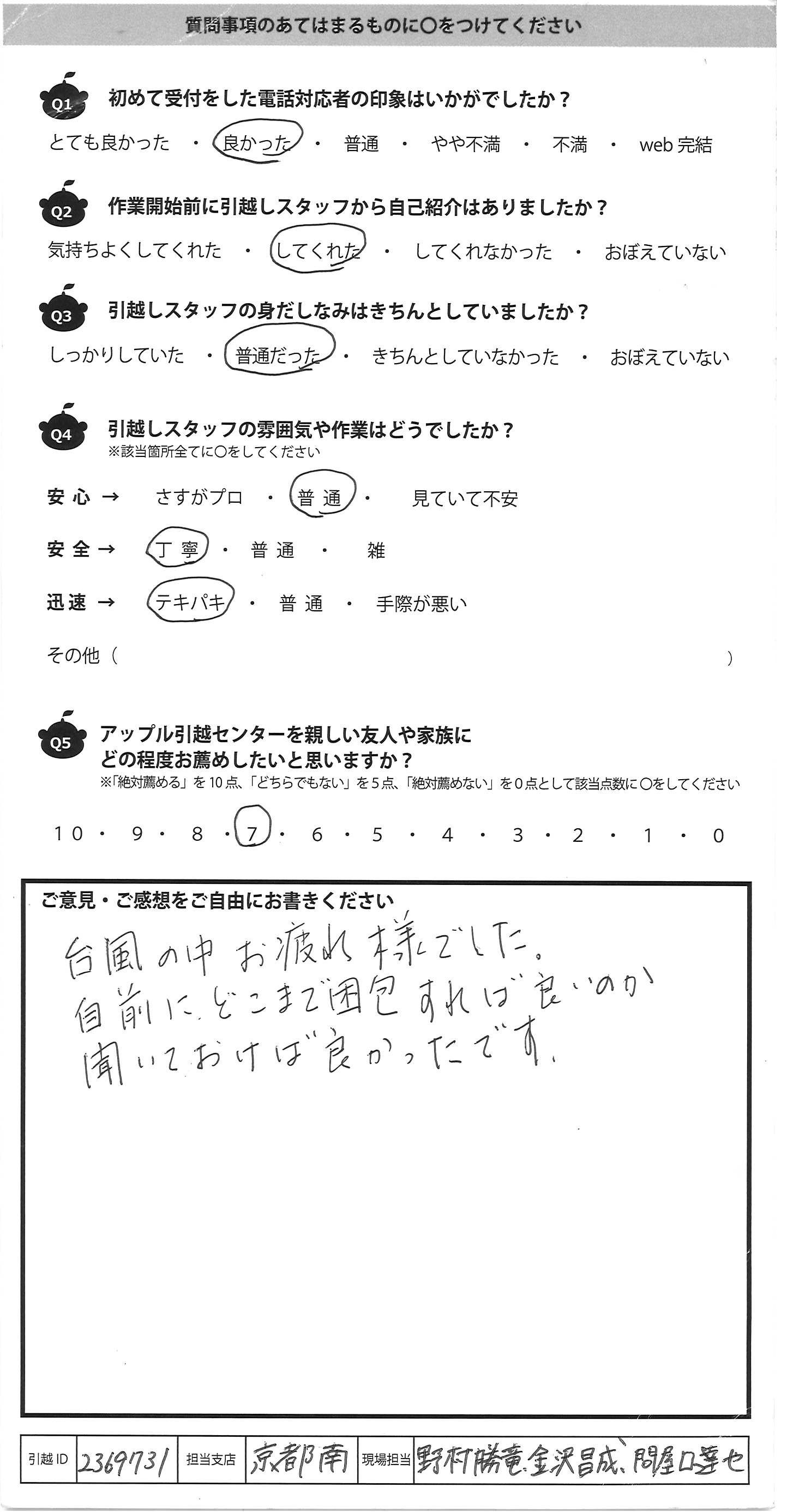 A.台風直撃のさなかでもテキパキとスムーズ に対応していただきました。 大変ありがとうございました。