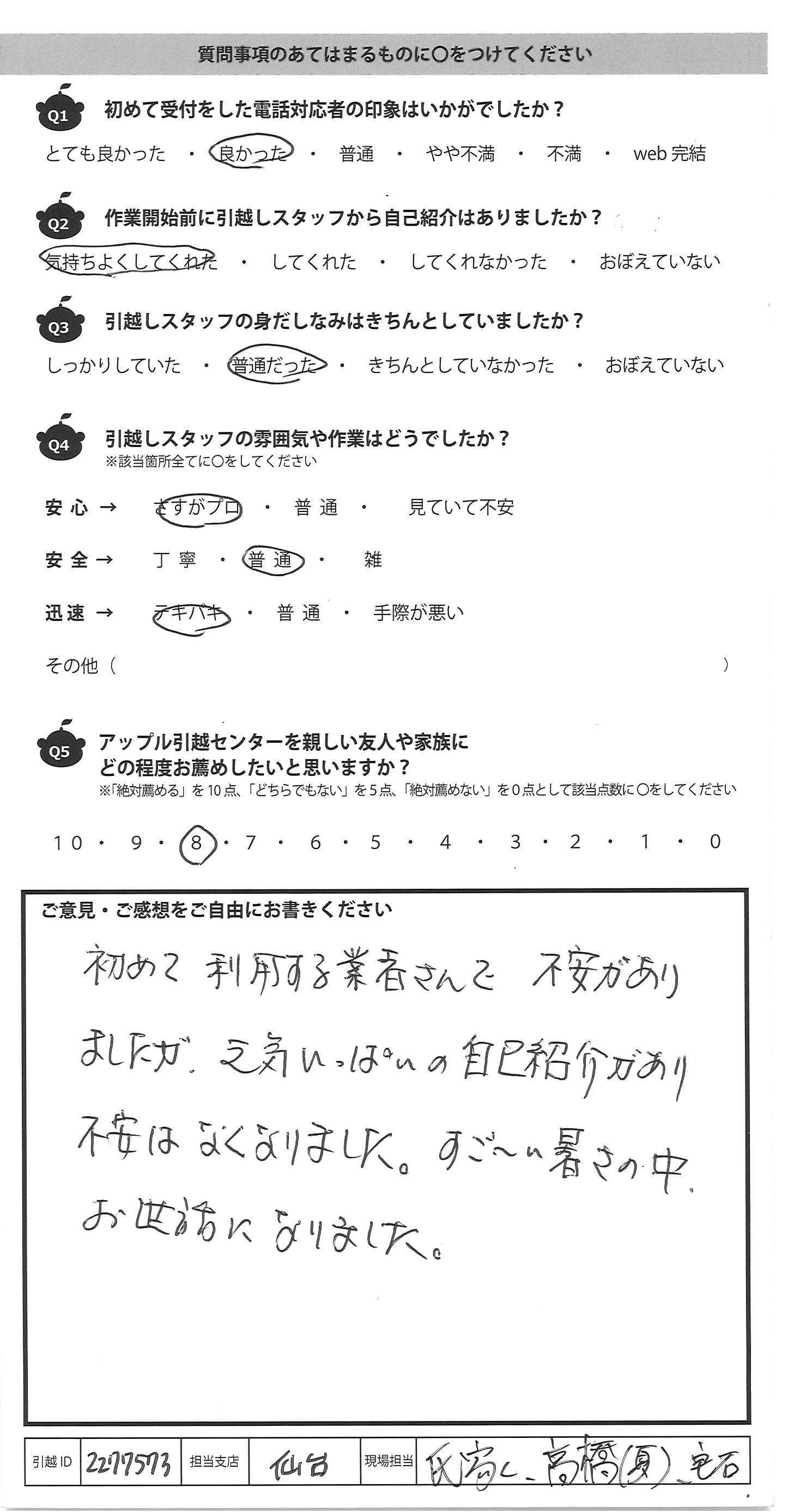 A.初めて利用する業者さんで不安があり ましたが、元気いっぱいの自己紹介があり 不安はなくなりました。すご~い暑さの中、 お世話になりました。