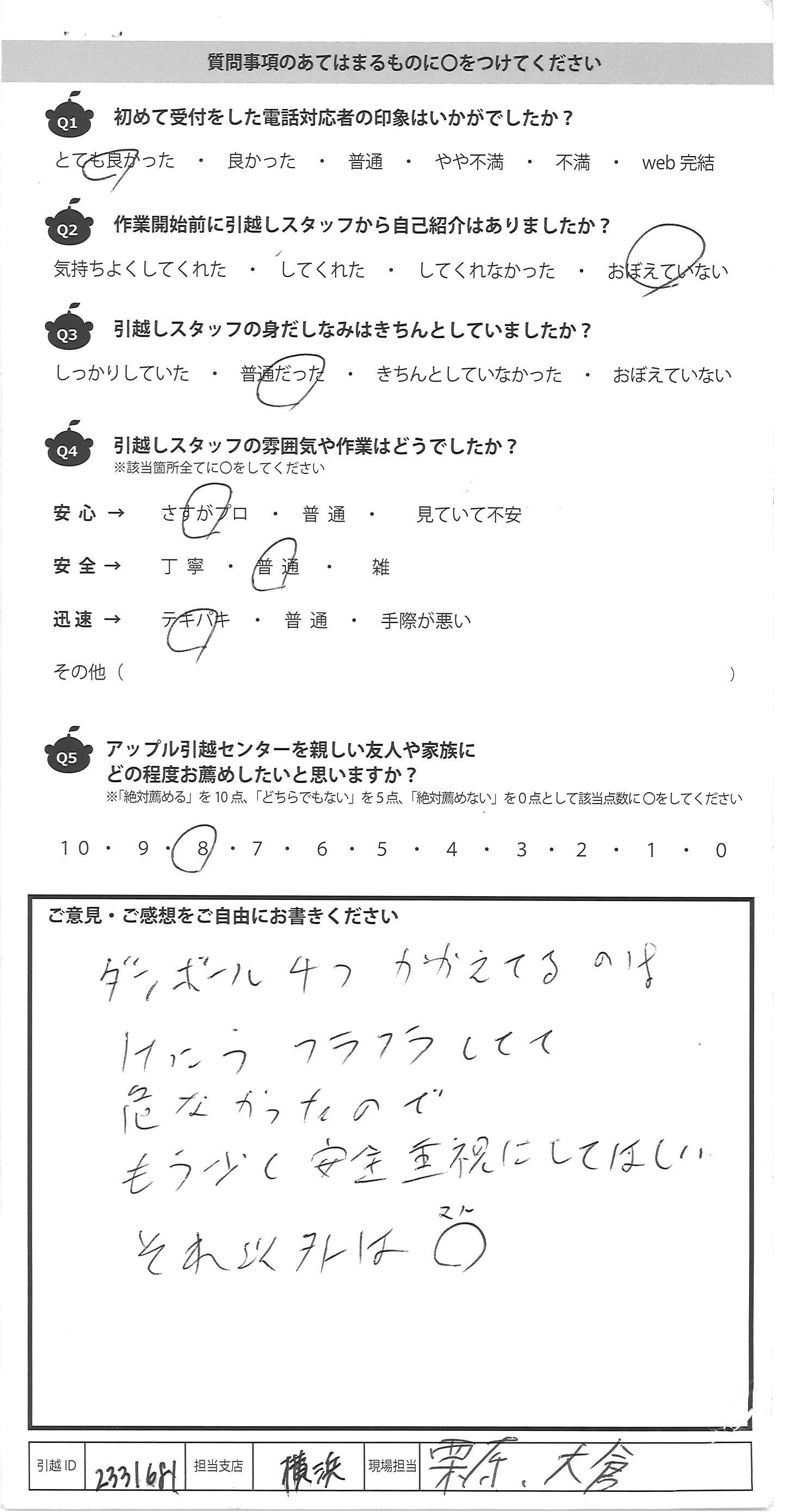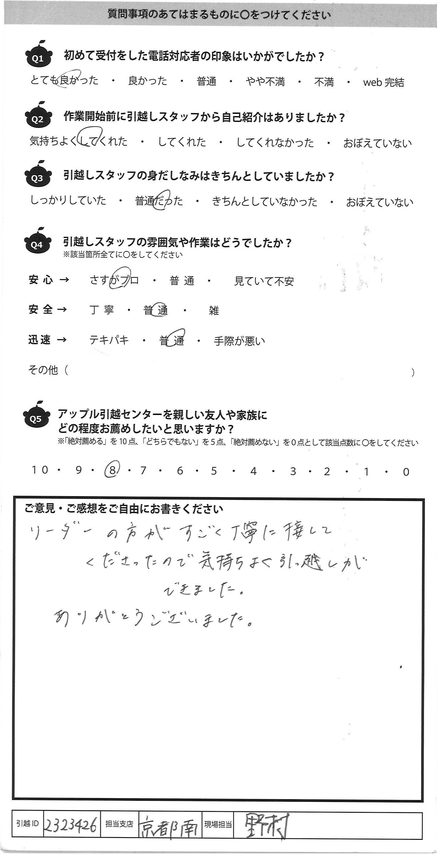 A.リーダーの方がすごく丁寧に接して くださったので気持ちよく引っ越しが できました。 ありがとうございました。