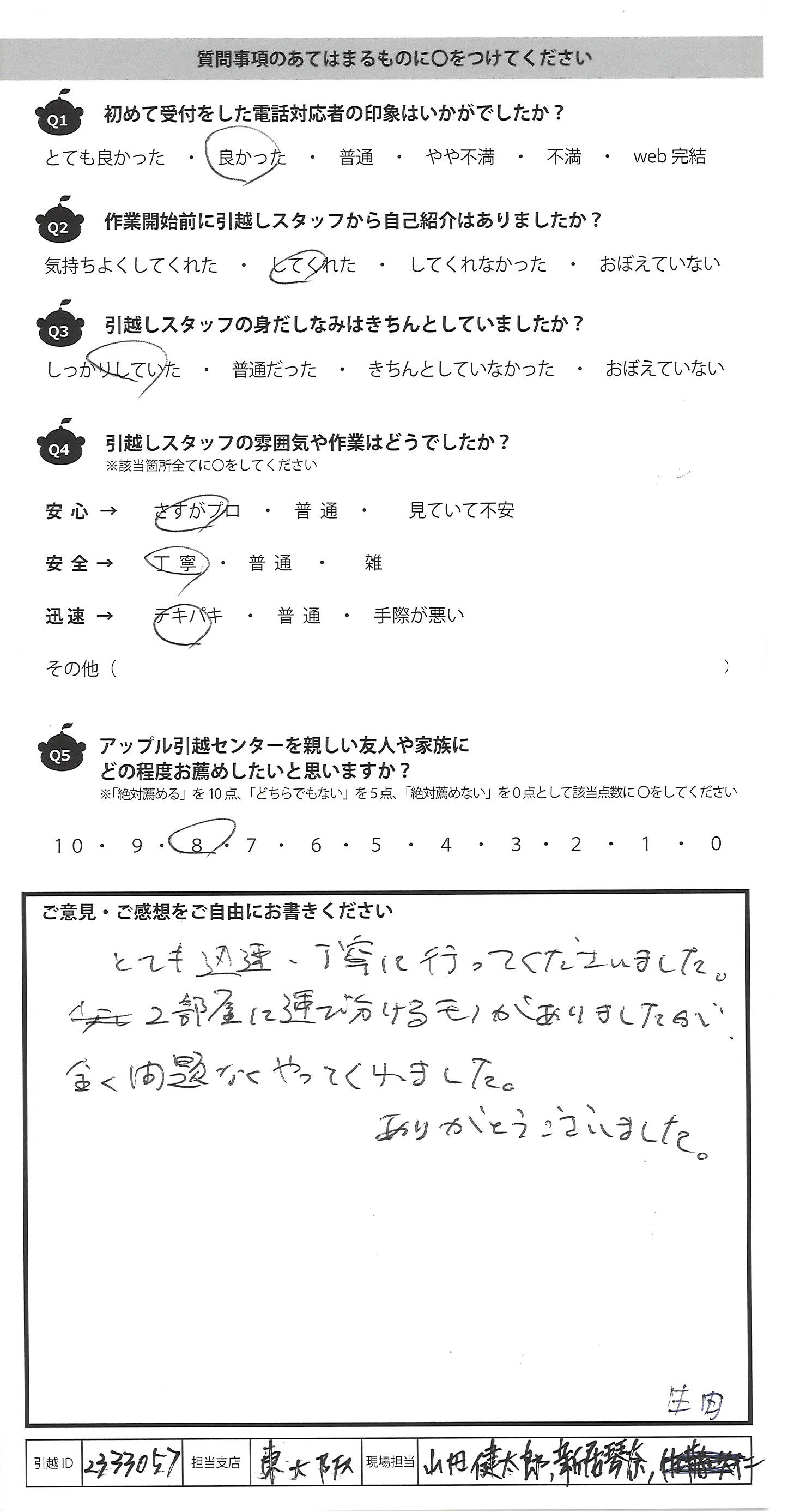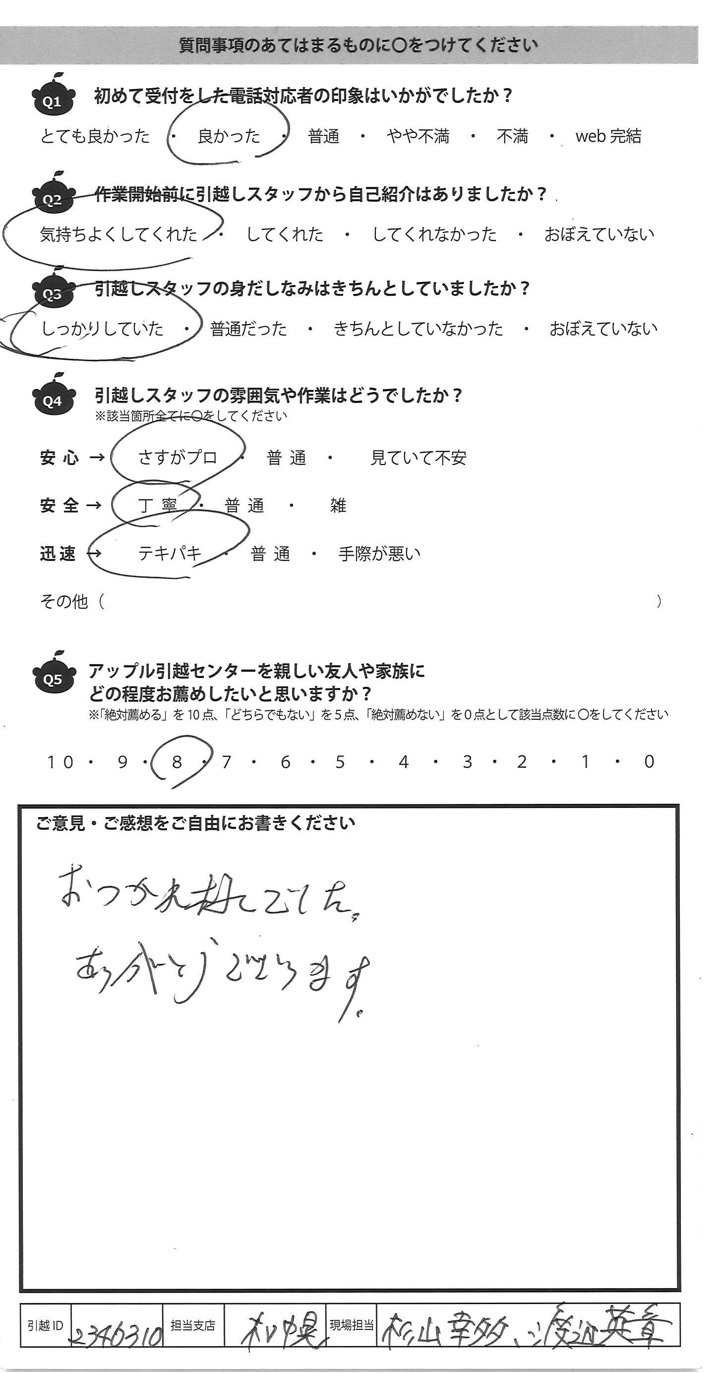 A.引越作業を担当頂きありがとうございました。 開始時間はトラック故障で遅れてしまったもののその後作業を迅速に対応頂き、その後の予定に影響はありませんでした。