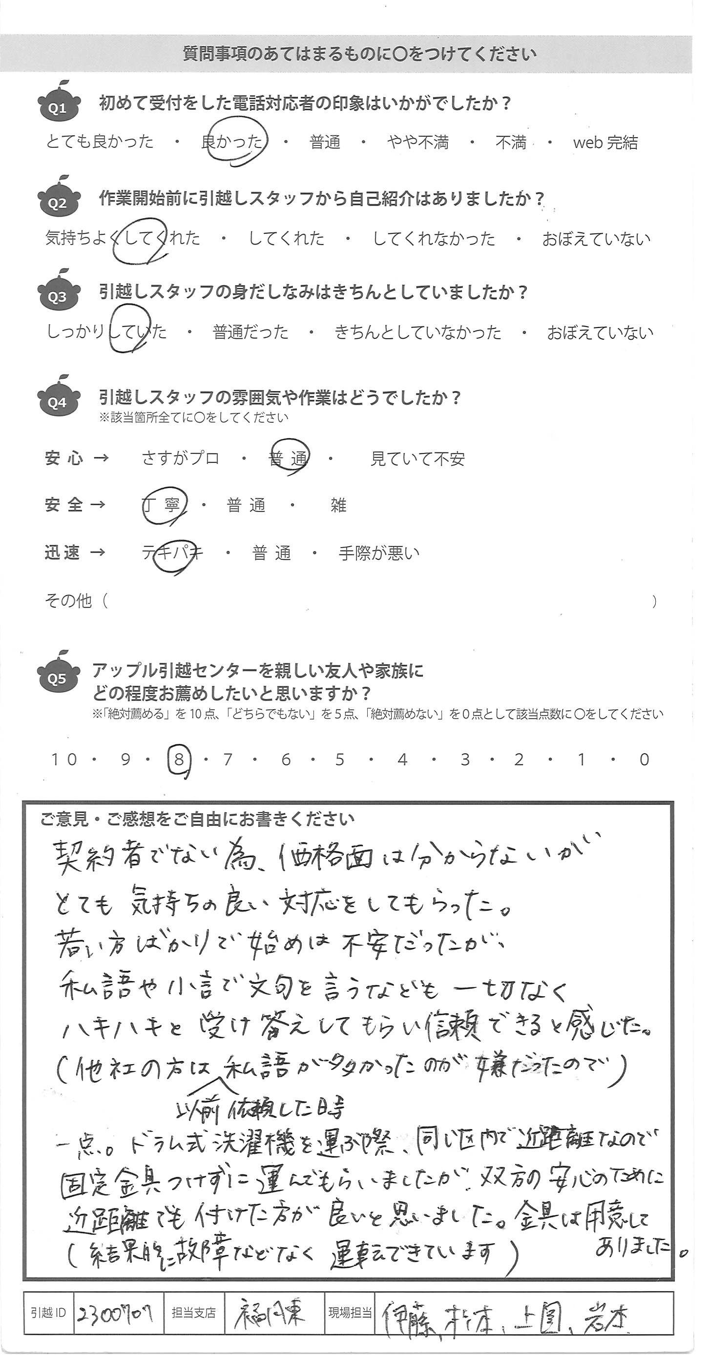 A.契約者でない為、価格面は分からないが とても気持ちの良い対応をしてもらった。 若い方ばかりで始めは不安だったが、 私語や小言で文句を言うなども一切なく ハキハキと受け答えしてもらい信頼できると感じた。 (他社の方は以前依頼した時私語が多かったのが嫌だったので) 一点。ドラム式洗濯機を運ぶ際、同じ区内で近距離なので 固定金具つけず運んでもらいましたが、双方の安心のために 近距離でも付けた方が良いと思いました。金具は用意してありました。 (結果的に故障などなく運転できています)