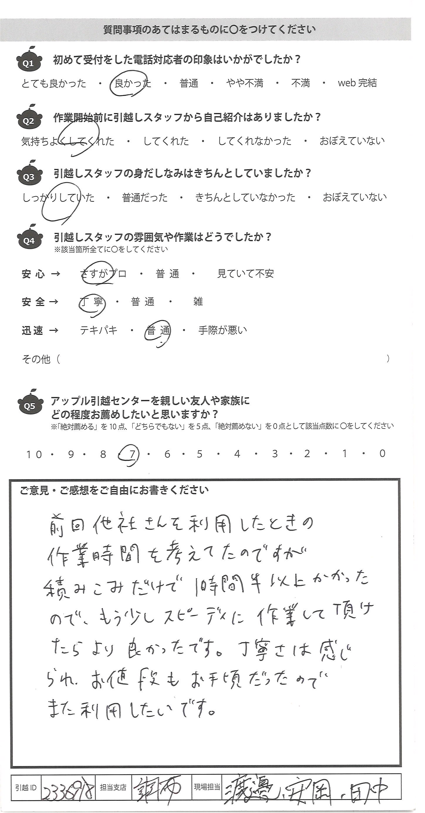 A.前回他社さんを利用したときの 作業時間を考えてたのですが 積みこみだけで1時間半以上かかった ので、もう少しスピーディに作業して頂け たらより良かったです。丁寧さは感じ られ、お値段もお手頃だったので また利用したいです。