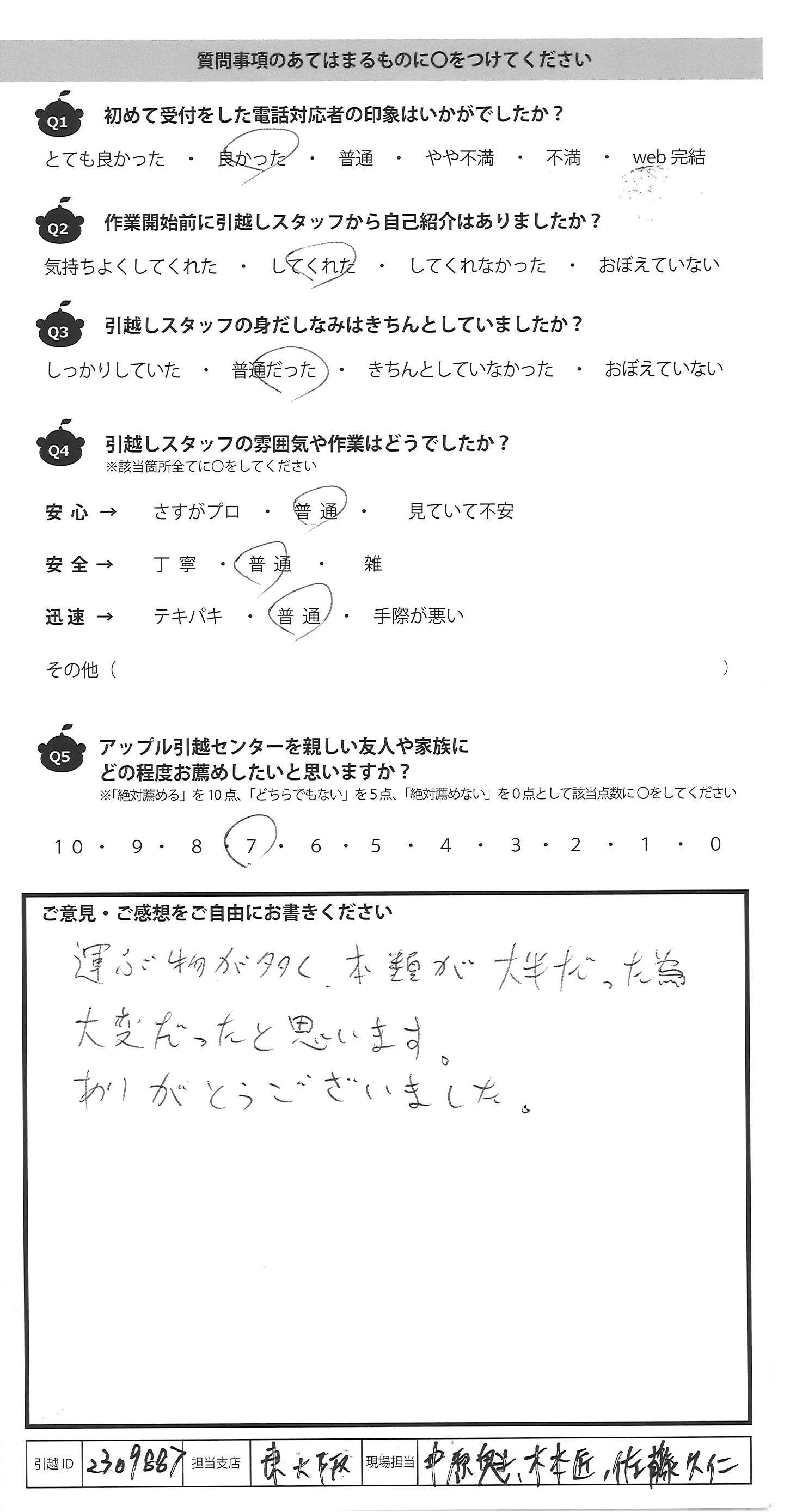 A.ダンボールが足りず荷作りが中途半端であった のにもかかわらずテキパキと荷づめ等 手伝って下さり大変ありがたかったです。 暑い中ありがとうございました。 お身体ご自愛下さい。