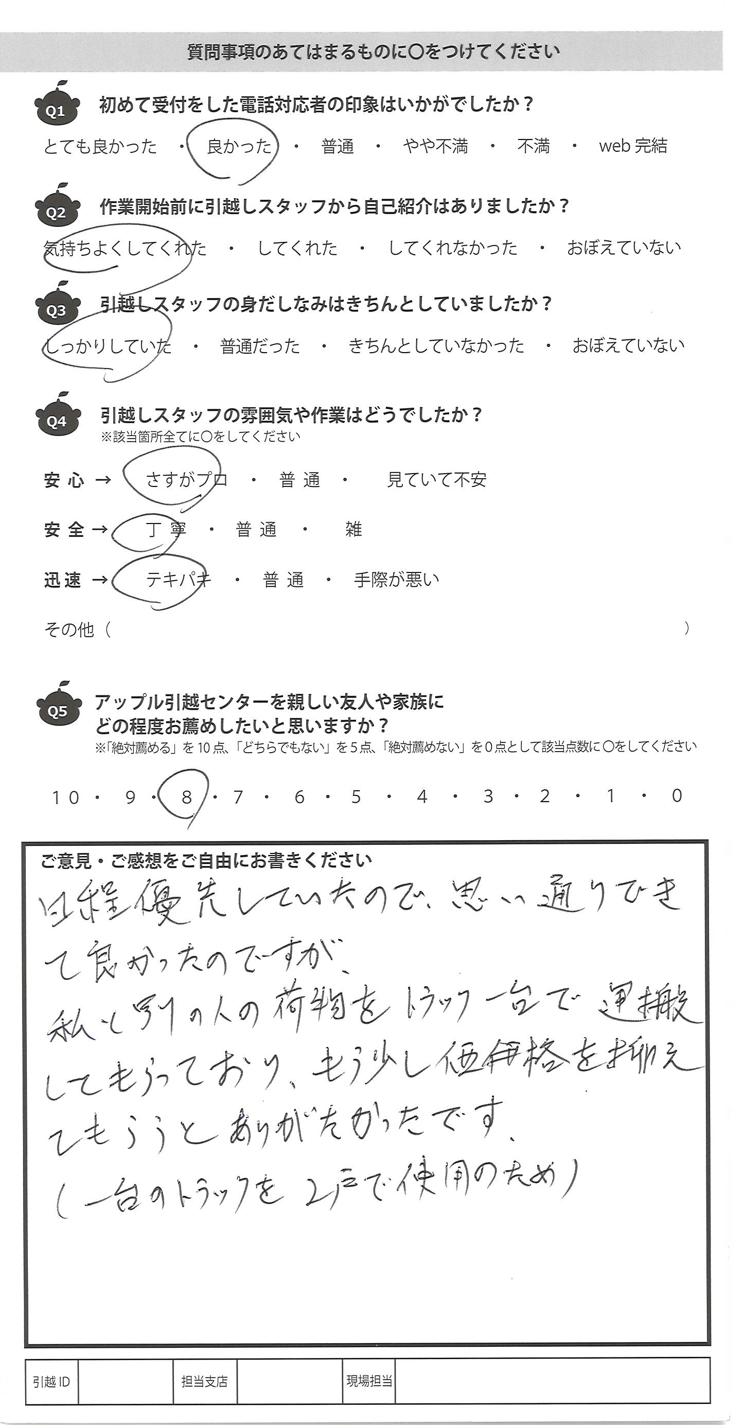 A.日程優先していたので、思い通りでき て良かったのですが、 私と別の人の荷物をトラック一台で運搬 してもらっており、もう少し価格を抑え てもらうとありがたかったです。 (一台のトラックを2戸で使用のため)