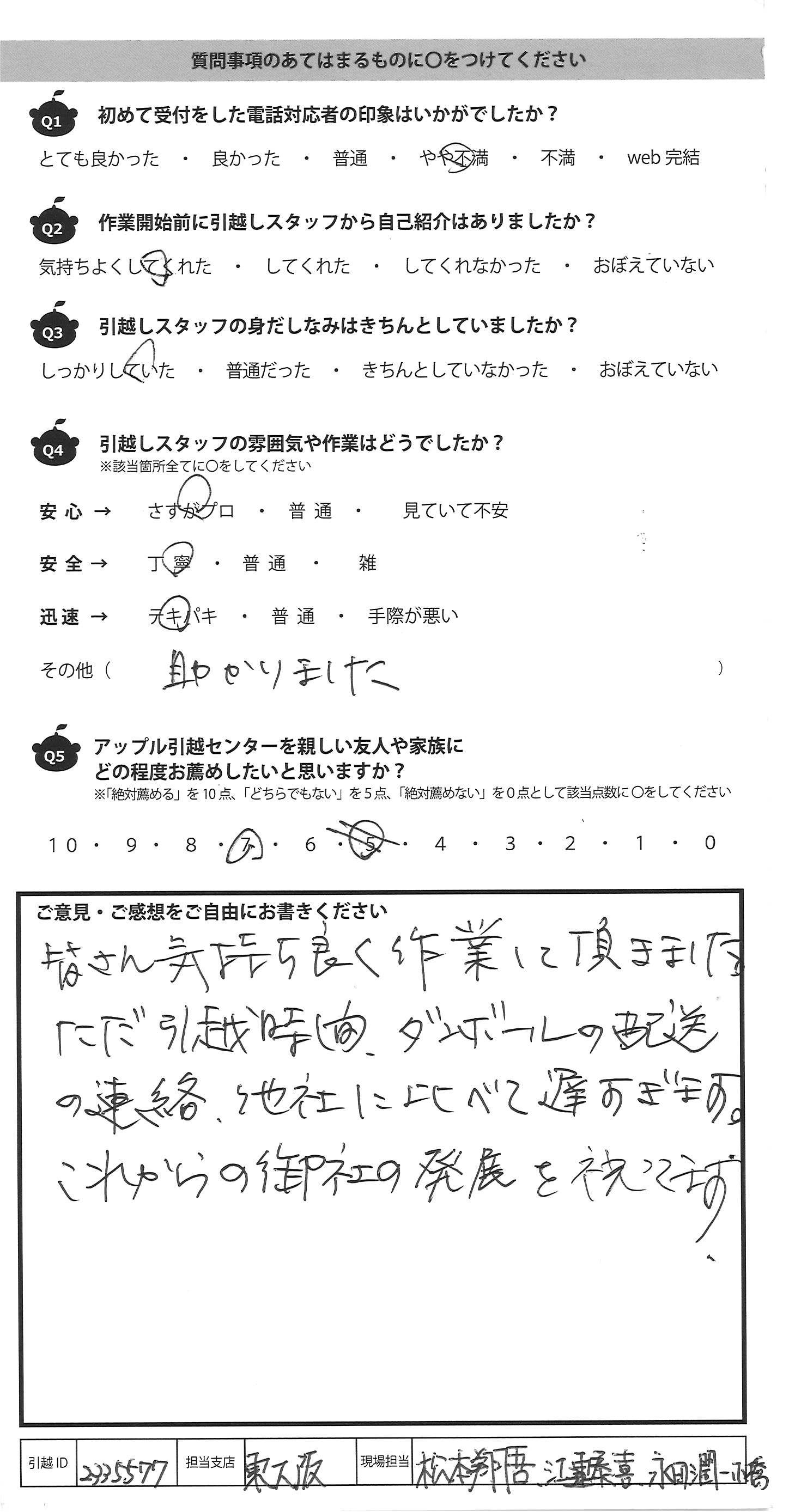 A.皆さん気持ち良く作業して頂きました ただ引越時間、ダンボールの配送 の連絡、他社に比べて遅すぎます。 これからの御社の発展を祈ってます。