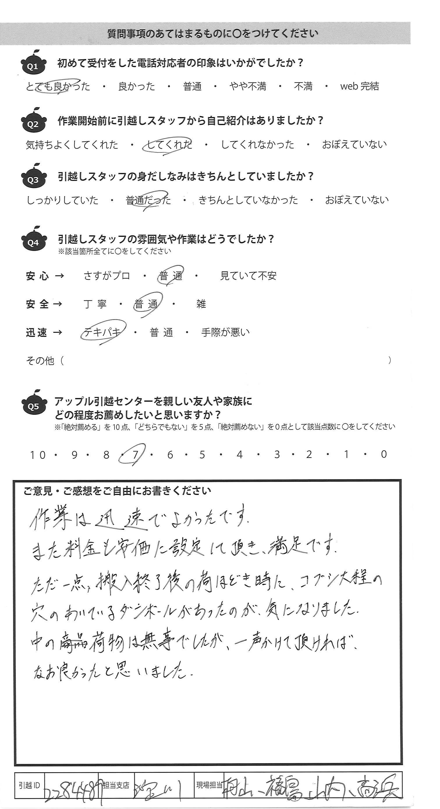 A.作業は迅速でよかったです。 また料金も安価に設定して頂き、満足です。 ただ一点搬入終了後の荷ほどき時に、コブシ大程の 穴のあいているダンボールがあったのが、気になりました。 中に荷物は無事でしたが、一声かけて頂ければ、 なお良かったと思いました。