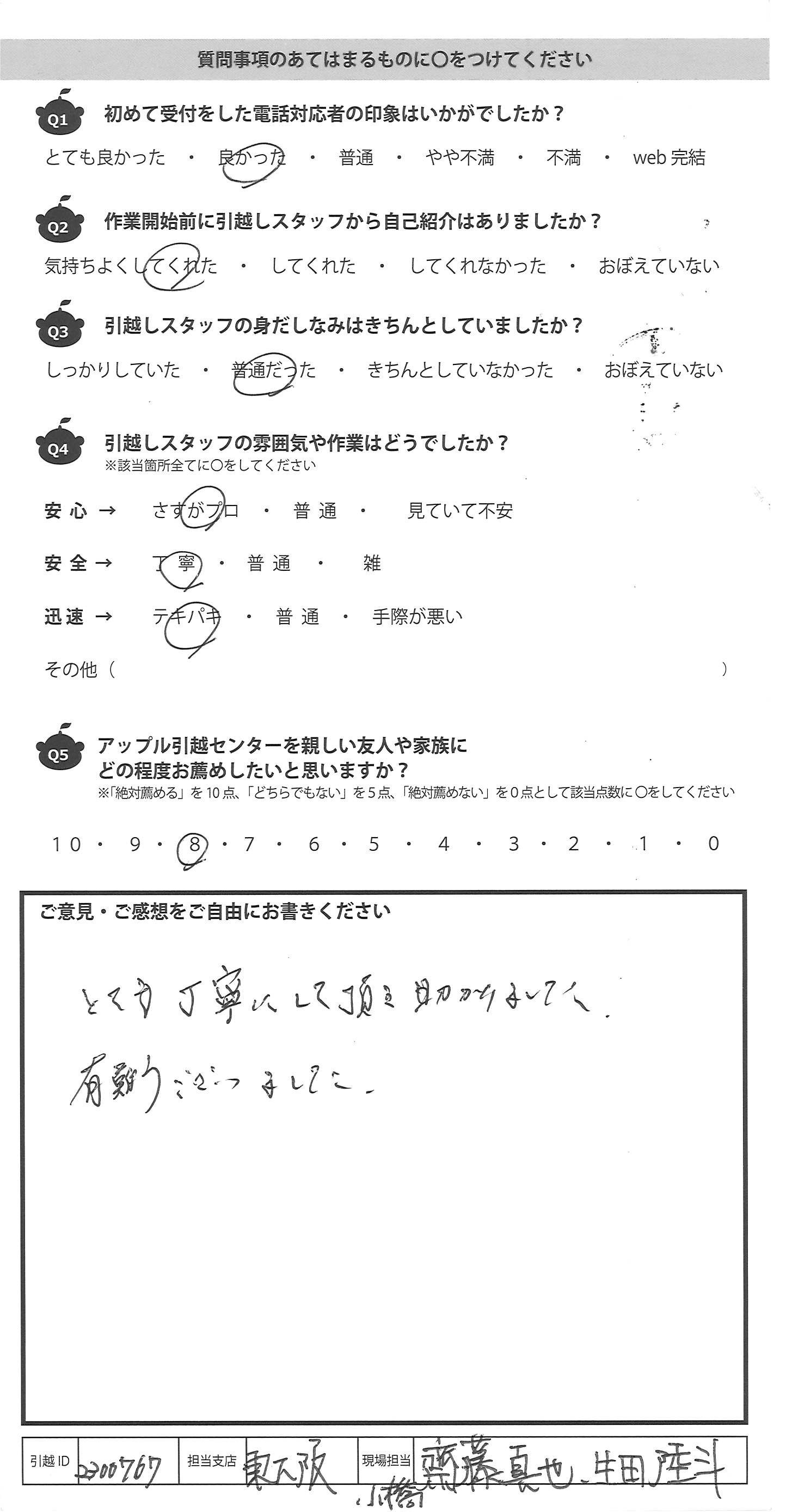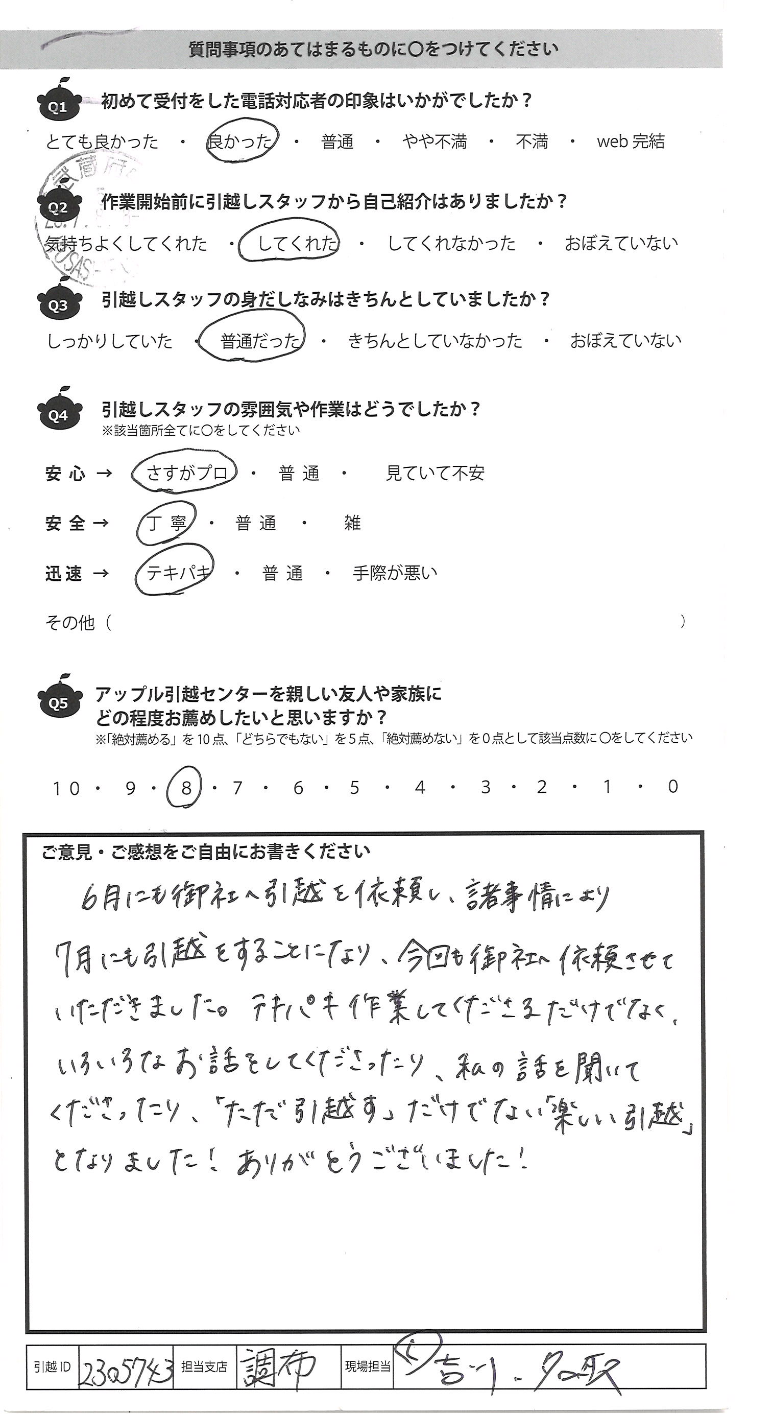 A.6月にも御社へ引越を依頼し、諸事情により 7月にも引越をすることになり、今回も御社へ依頼させて いただきました。テキパキ作業してくださるだけでなく、 いろいろなお話をしてくださったり、私の話を聞いて くださったり、「ただ引越す」だけでない「楽しい引越」 となりました!ありがとうございました!