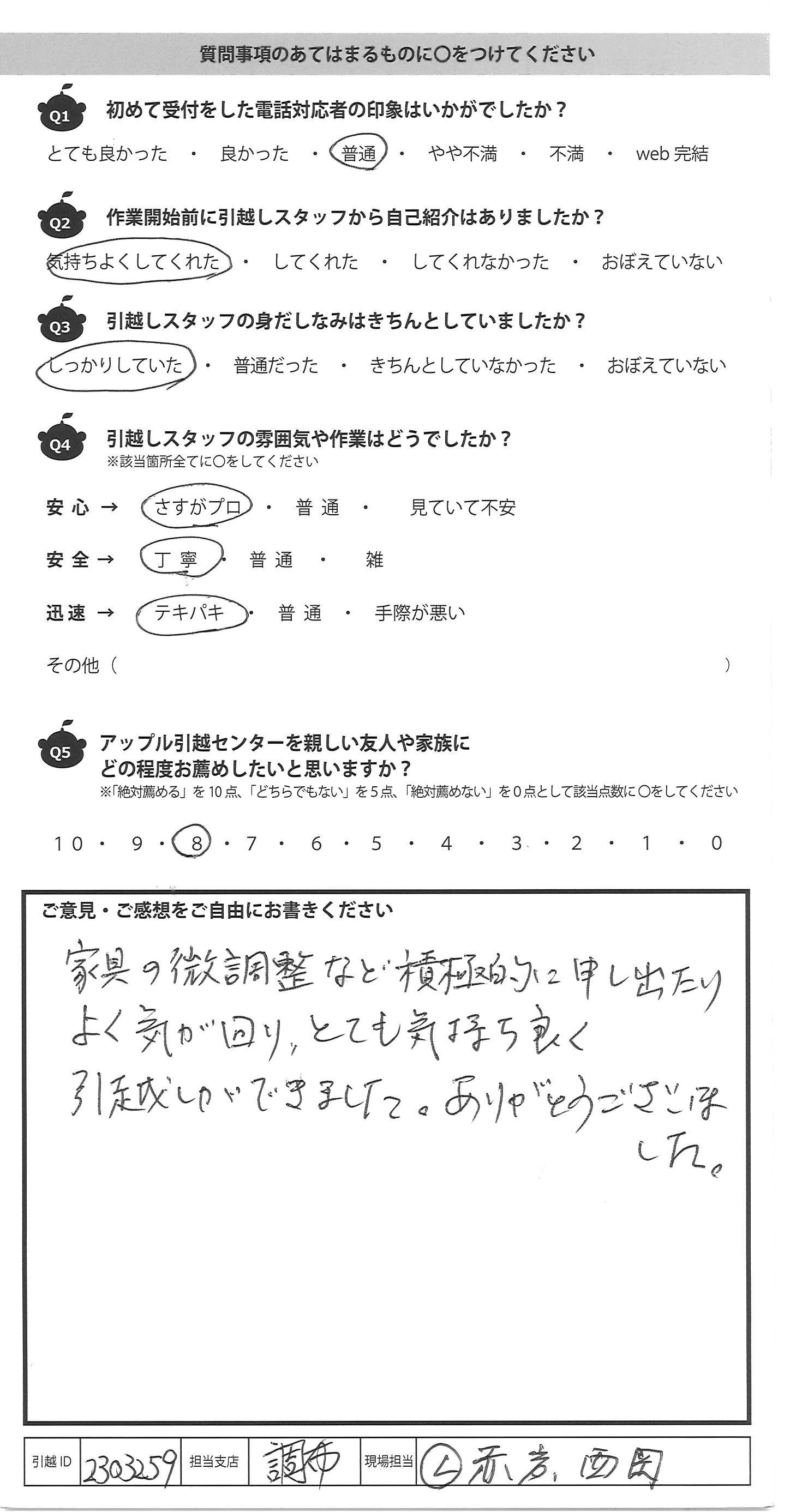 A.家具の微調整など積極的に申し出たり よく気が回り、とても気持ち良く 引越しができました。ありがとうございま した。
