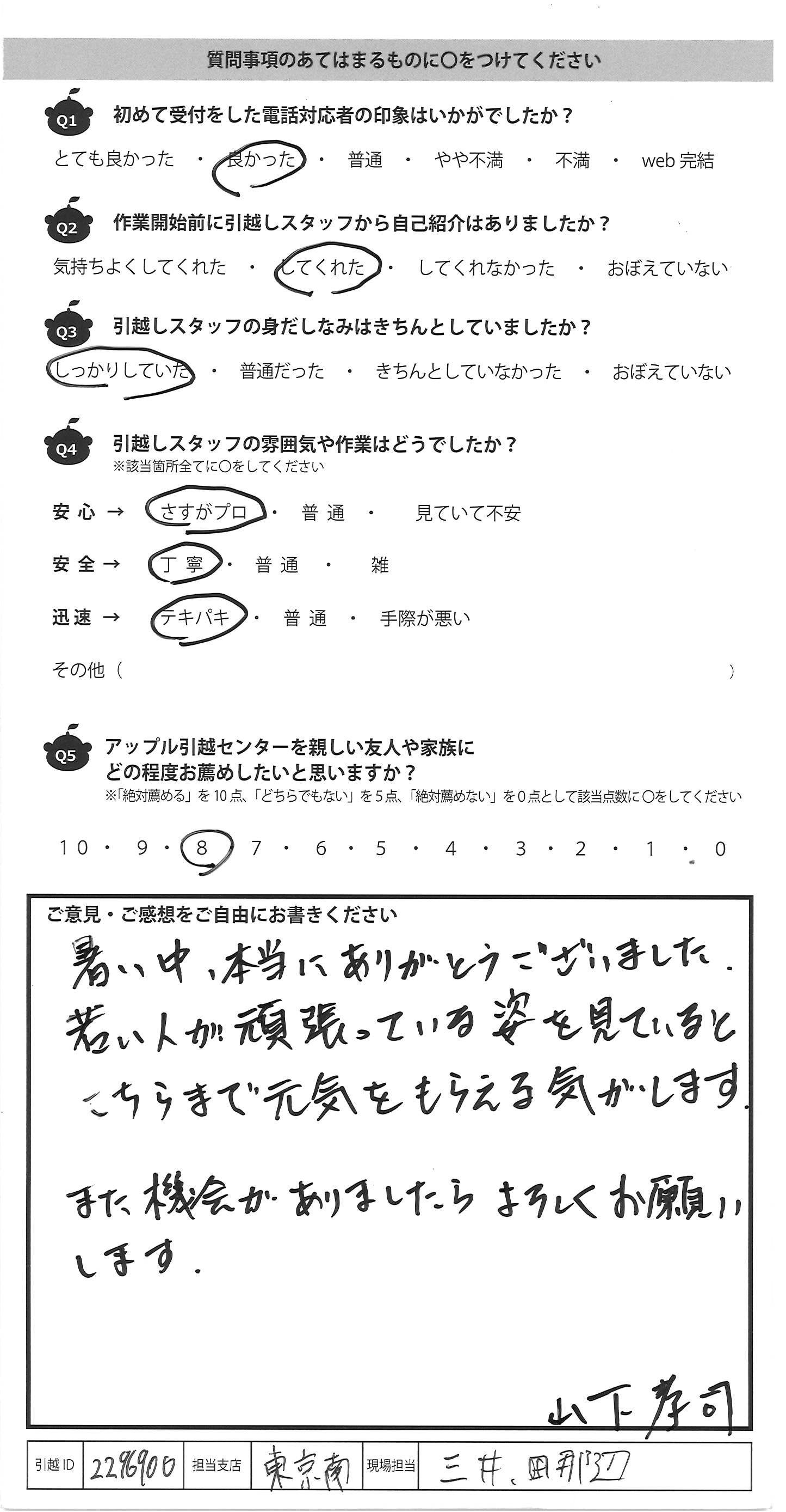A.初めて業者さんにお願いし引越をしましたが、 こんなにも作業が早いとは思っていなくて、びっくりしました。 重たい荷物を息も切らさず運んでくださり、すごいなぁと。 丁寧に対応してくださり、ありがとうございました。 向久保さんのさわやかな笑顔とやわらかい話し方が 好印象でした 暑い中、本当にありがとうございました!