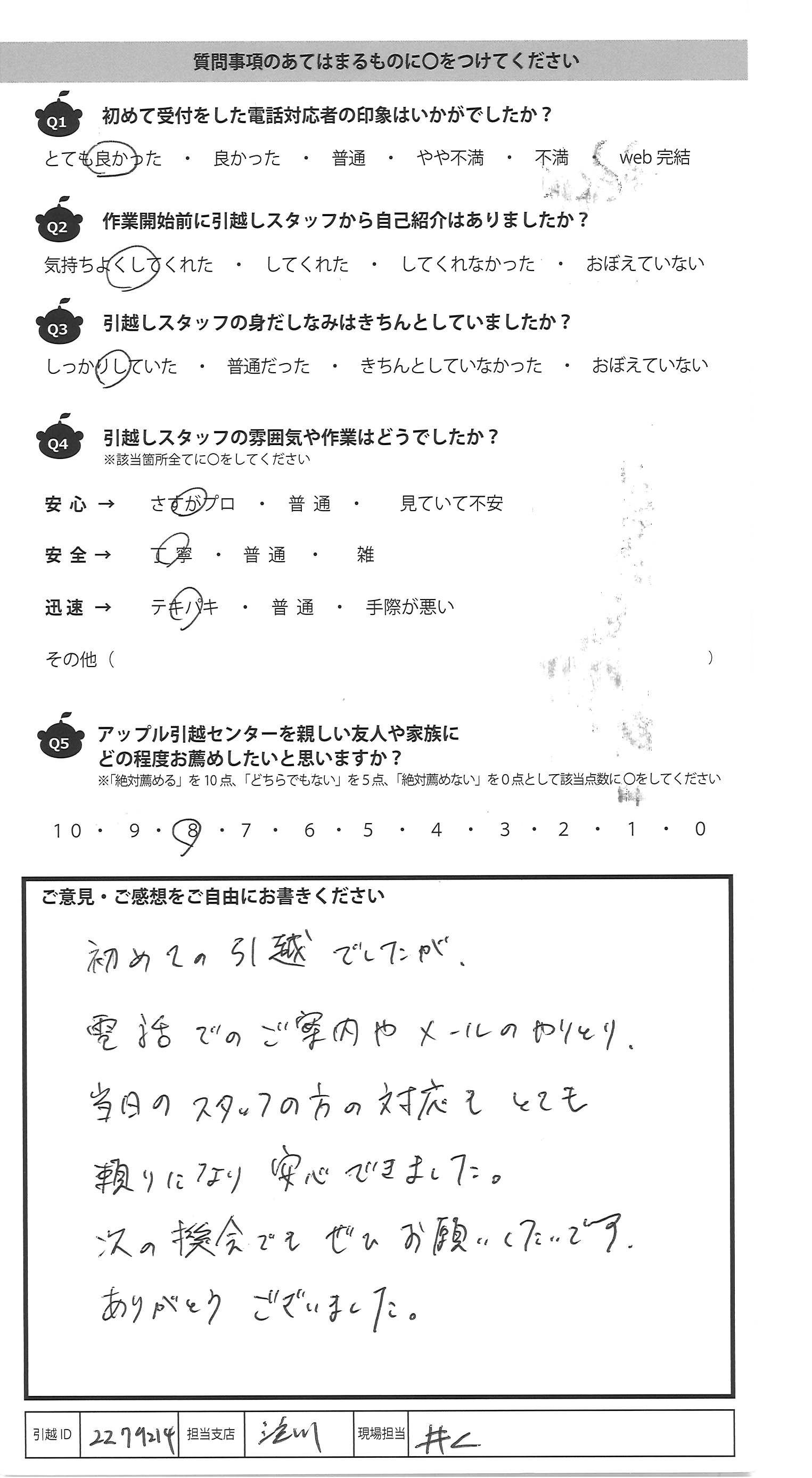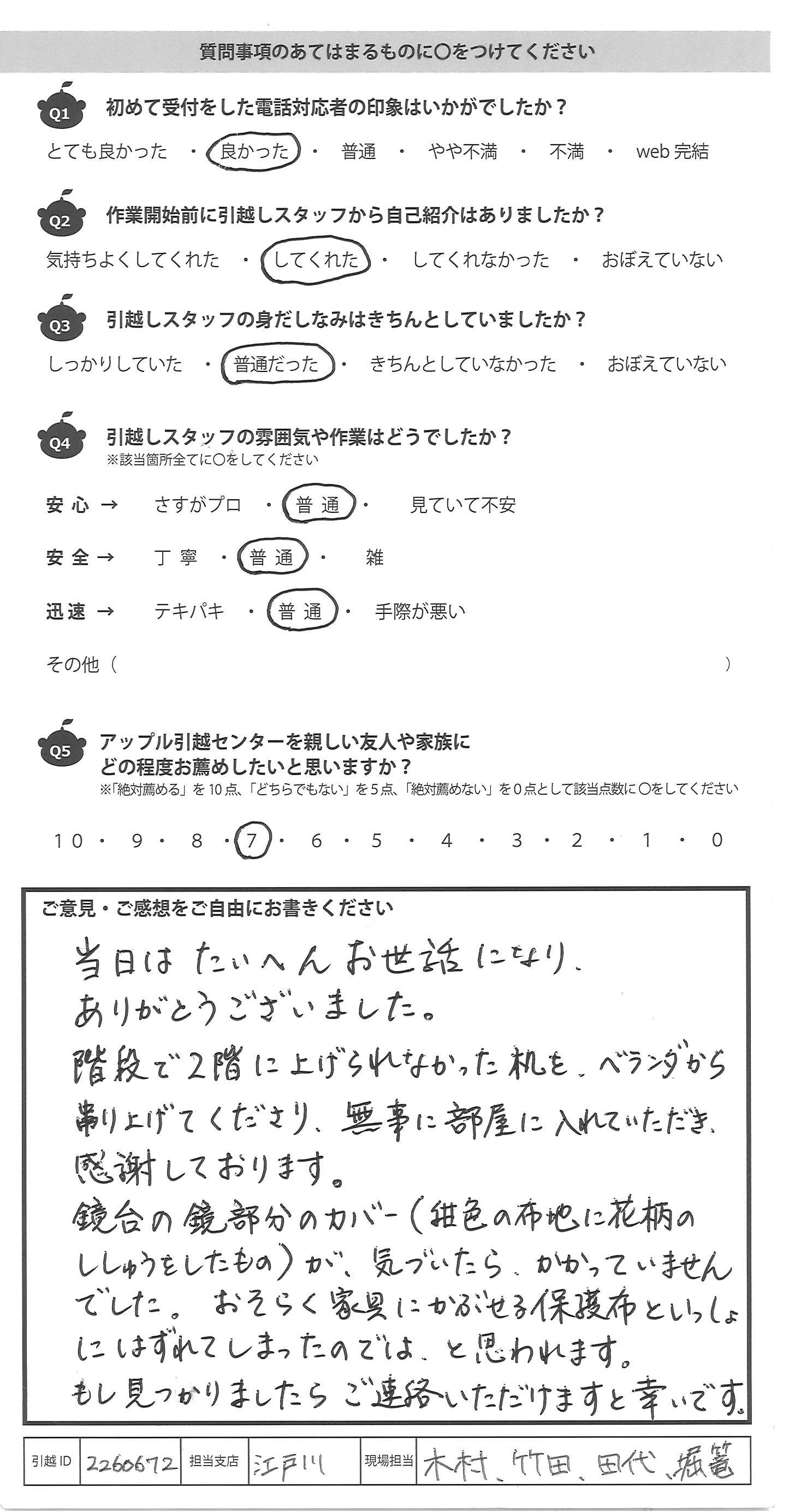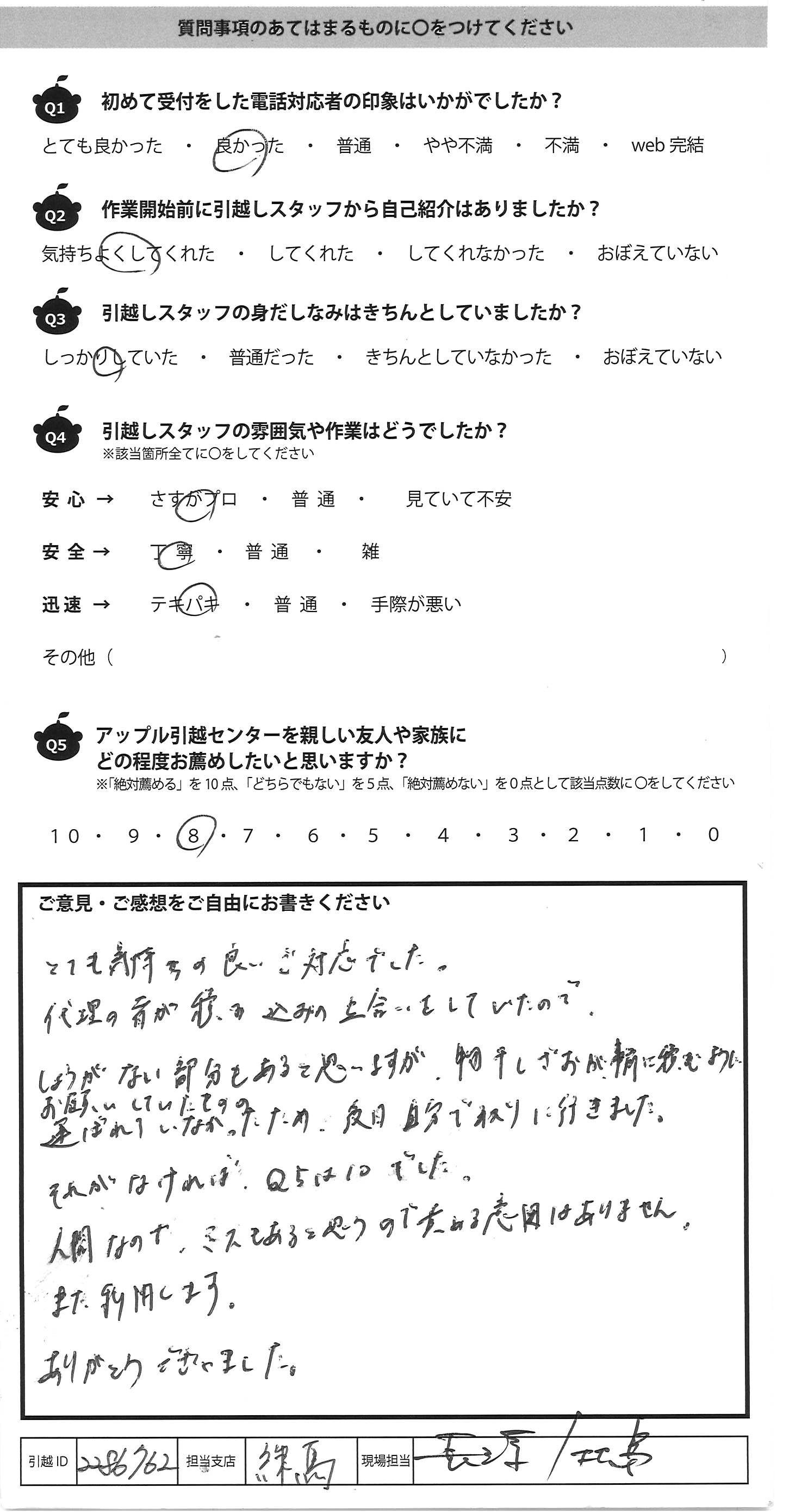 A.とても気持ちの良いご対応でした。 代理の者が積み込みの立会いをしていたので しょうがない部分もあうと思いますが、物干しざおが事前に積むように お願いしていたものの 運ばれていなかったため、後日自分で取りに行きました。 それがなければ、Q5は10でした。 人間なのでミスもあると思うので責める意図はありません。 また利用します。 ありがとうございました。
