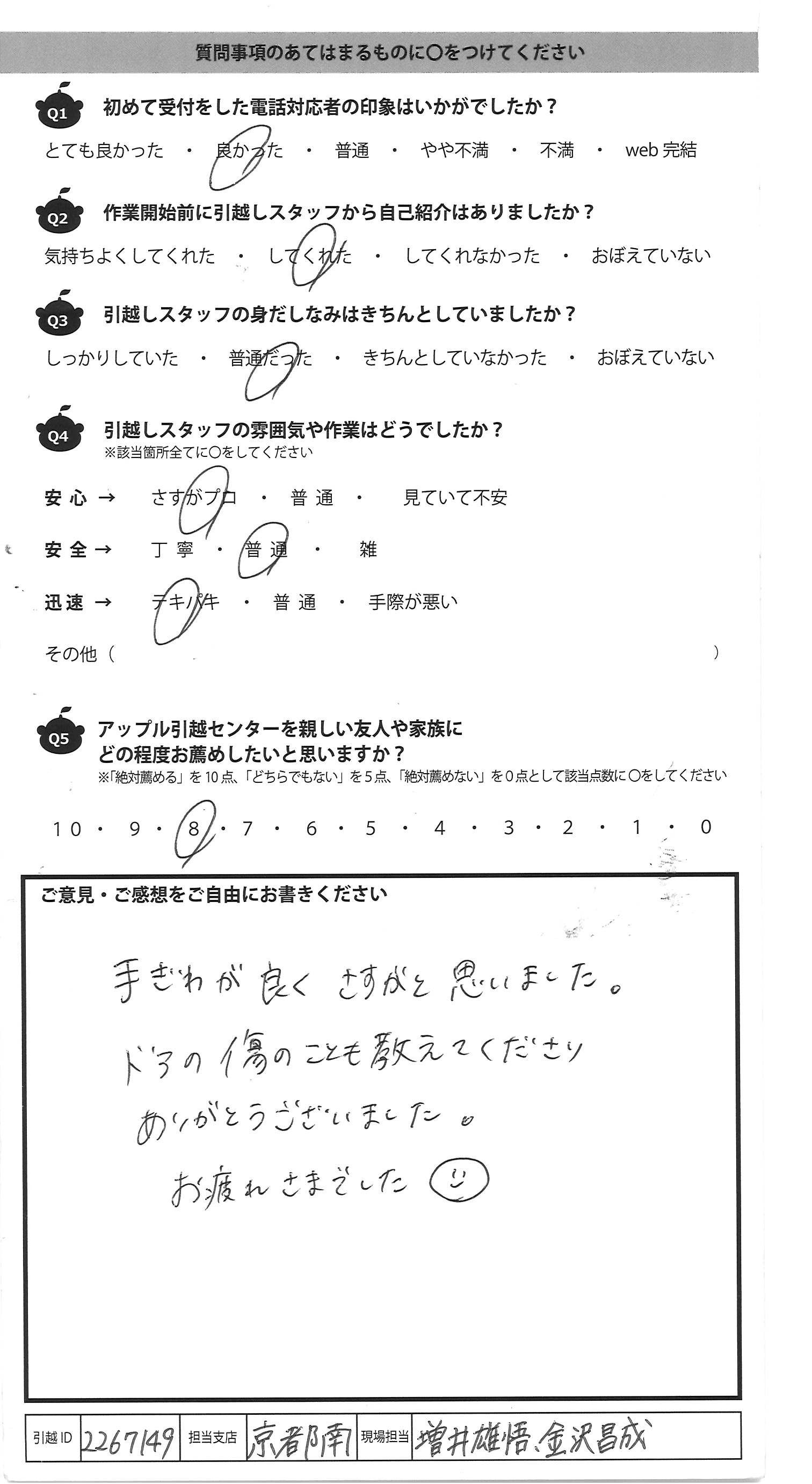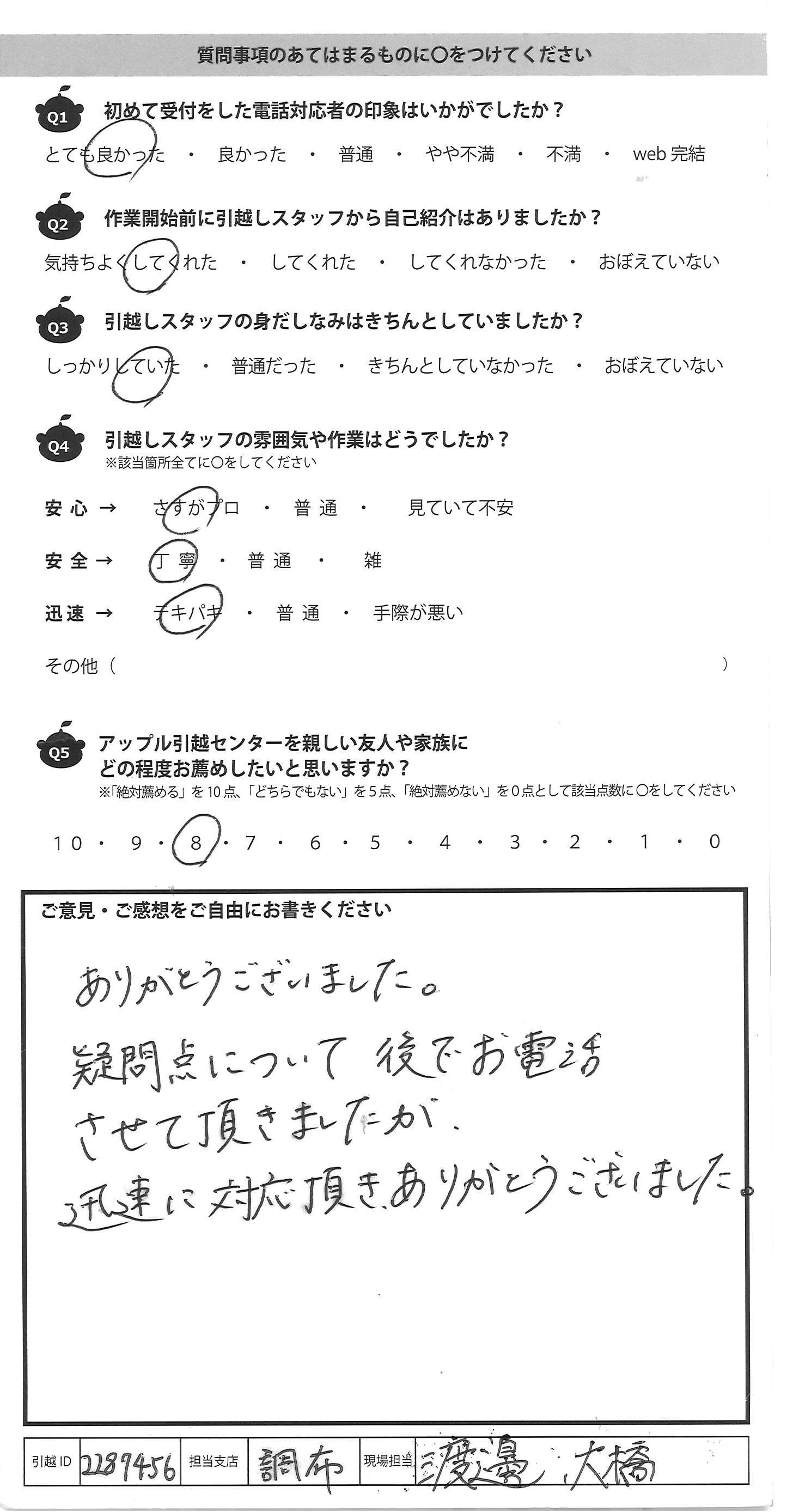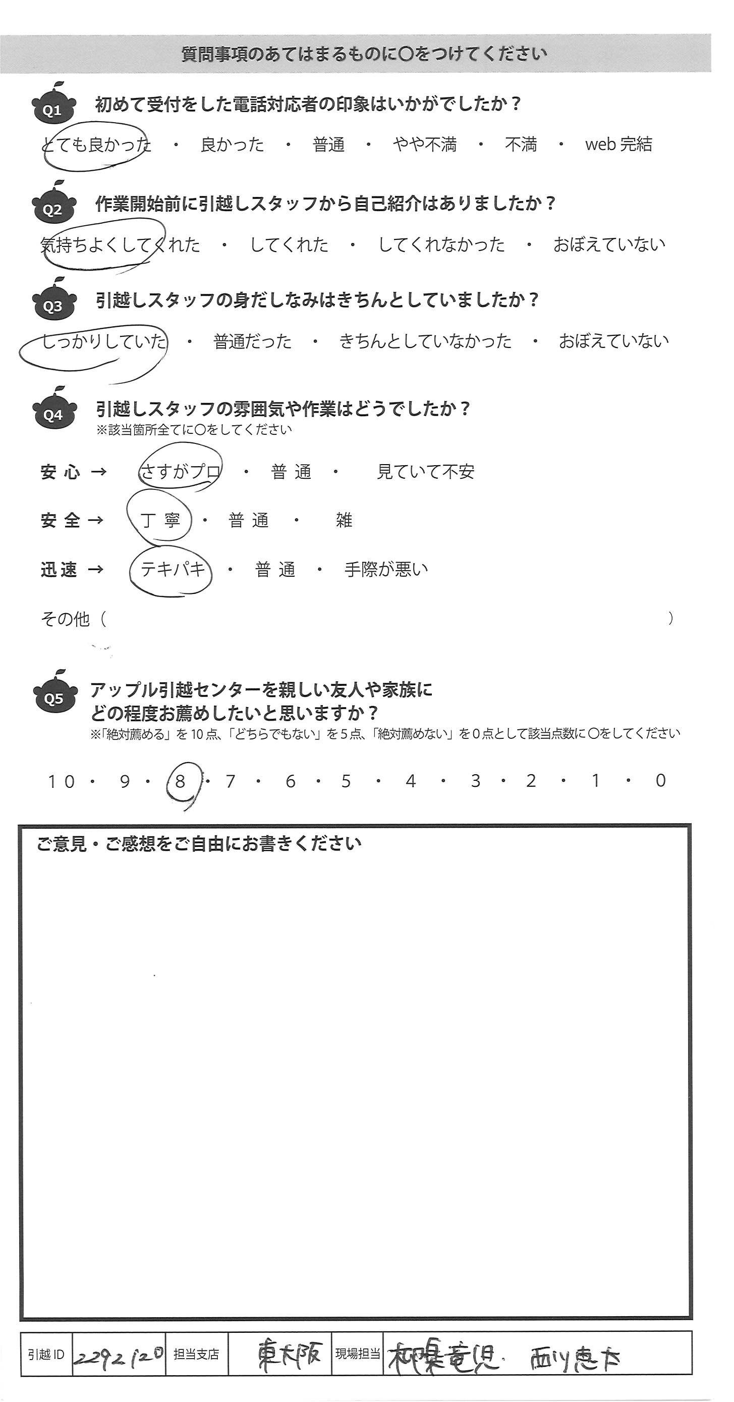 A.とても気持ちの良いご対応でした。 代理の者が積み込みの立会いをしていたので しょうがない部分もあうと思いますが、物干しざおが事前に積むように お願いしていたものの 運ばれていなかったため、後日自分で取りに行きました。 それがなければ、Q5は10でした。 人間なのでミスもあると思うので責める意図はありません。 また利用します。 ありがとうございました。
