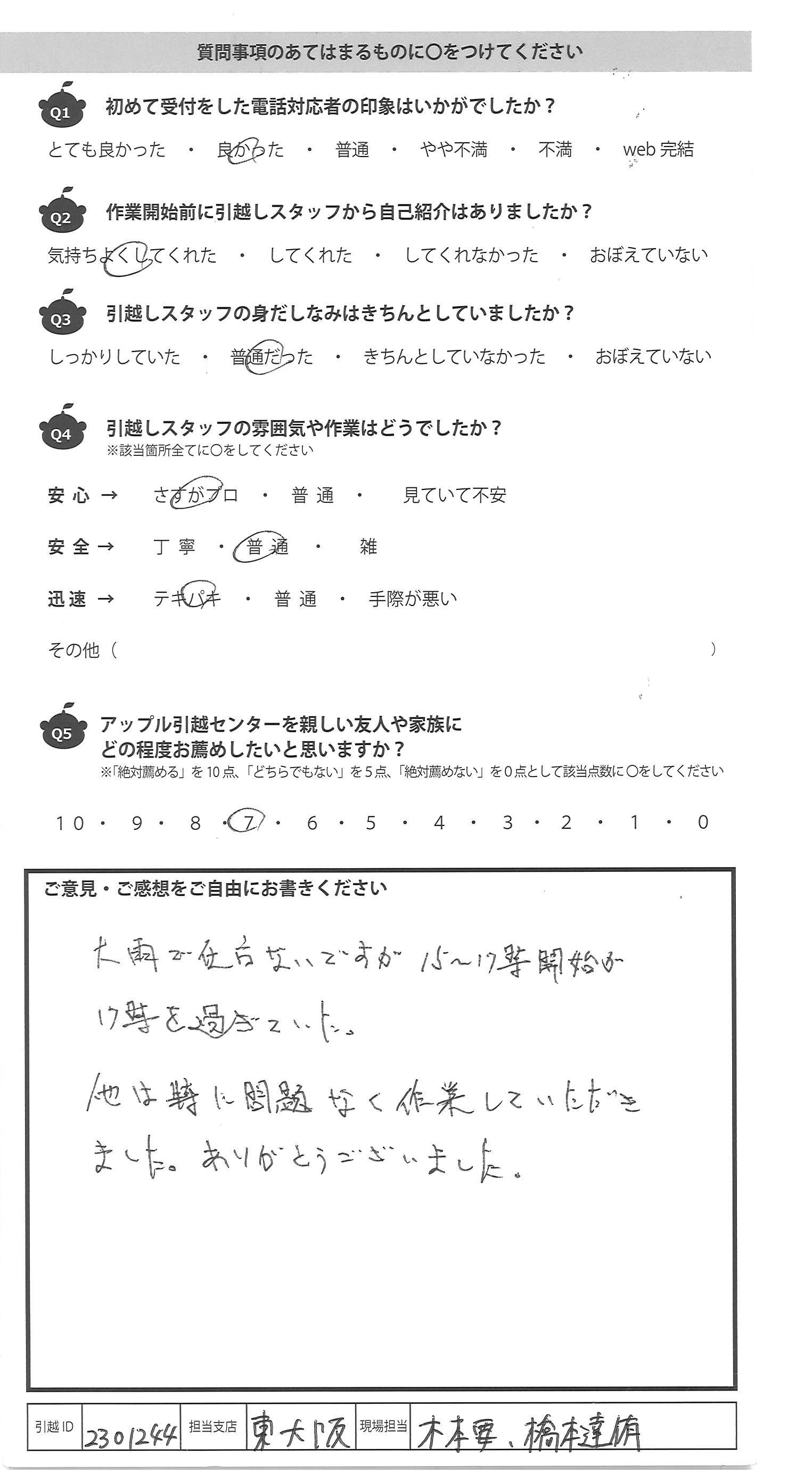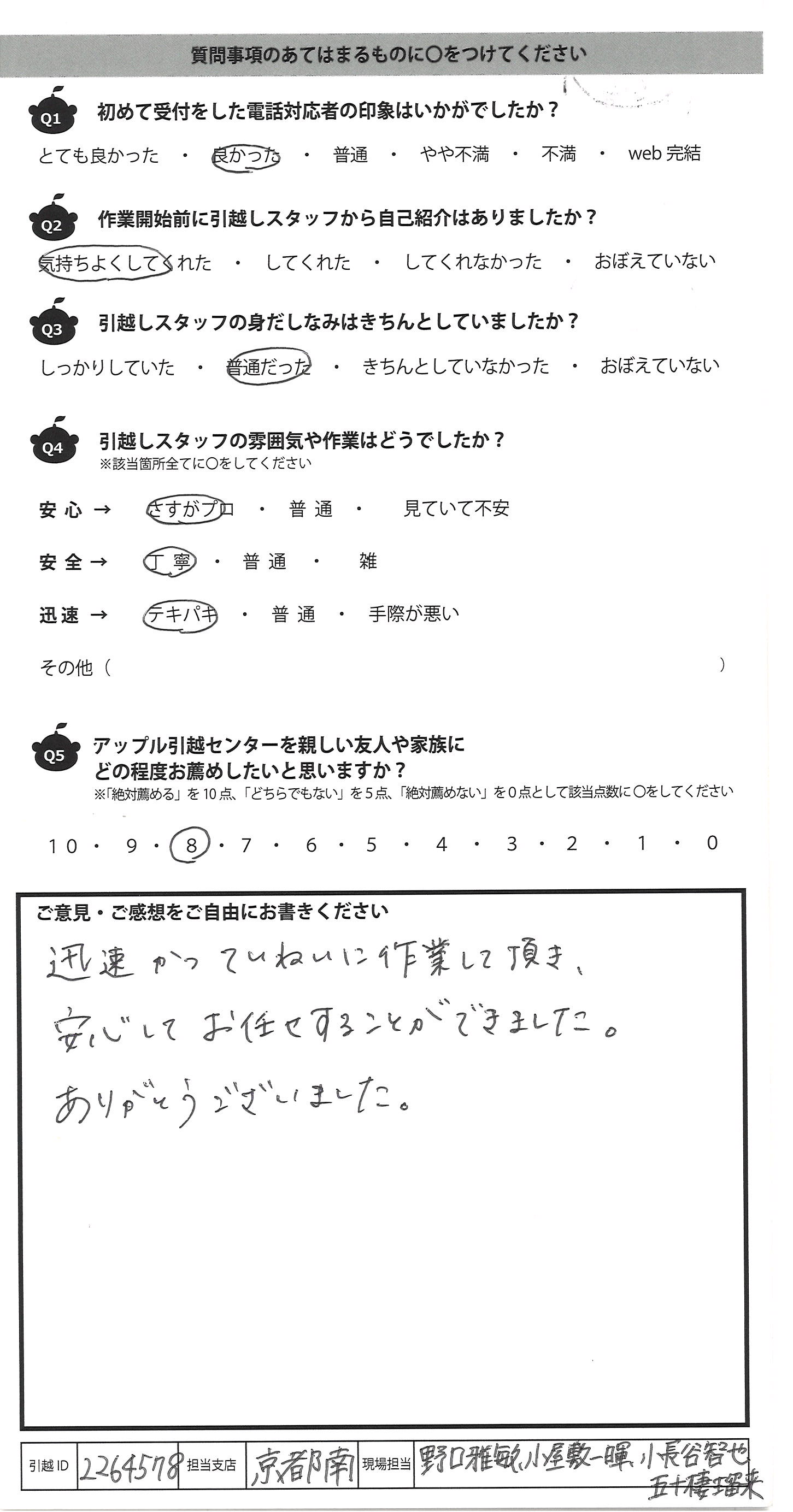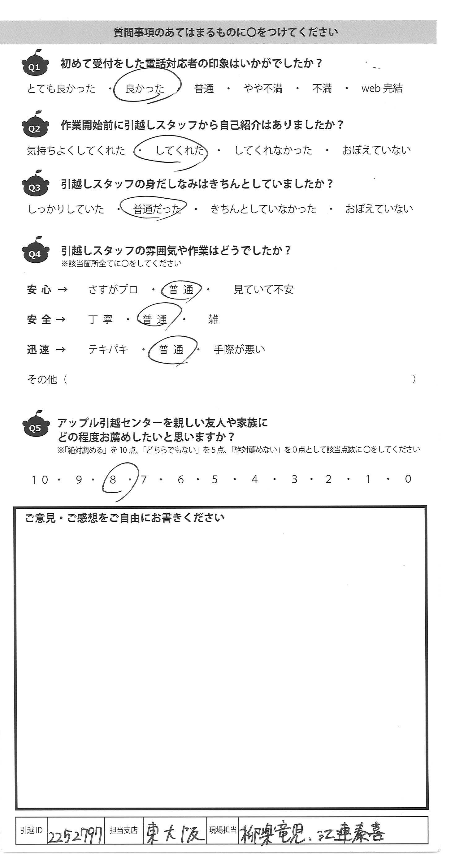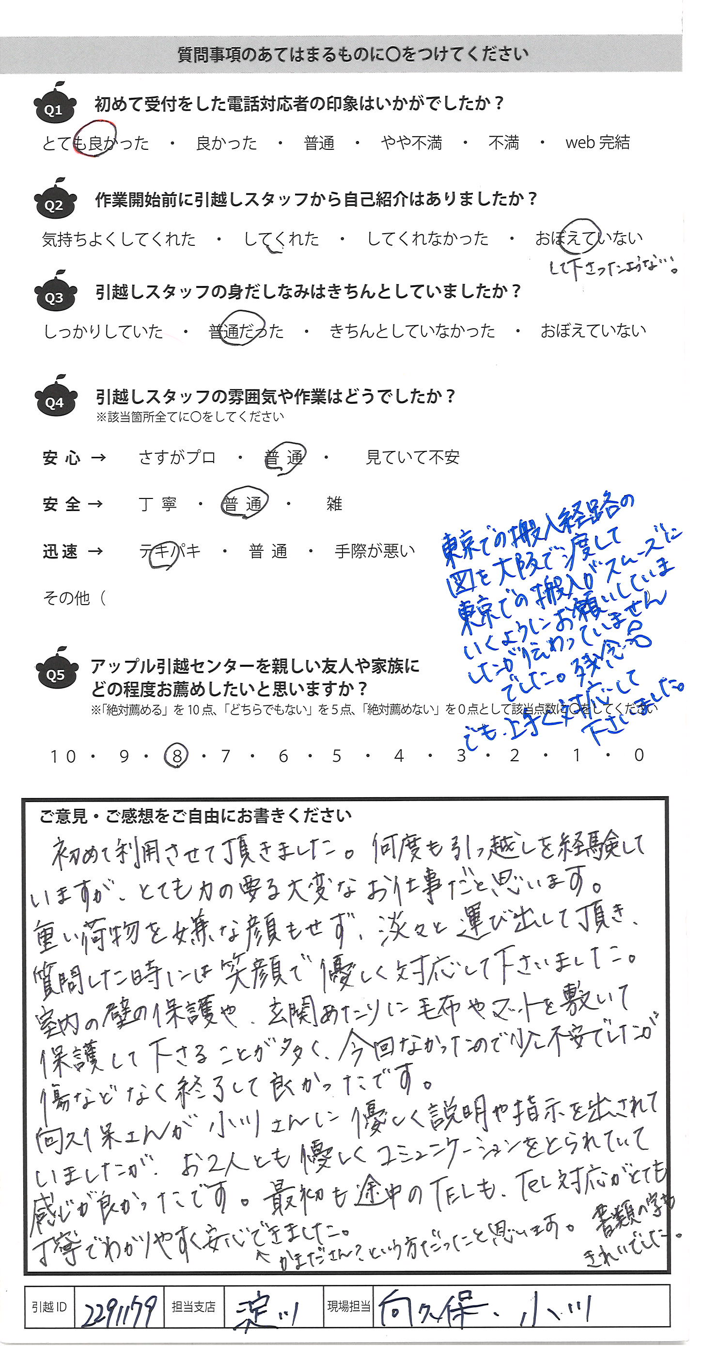 A.初めて利用させて頂きました。何度も引っ越しを経験して いますが、とても力の要る大変なお仕事だと思います。 重い荷物を嫌な顔もせず、淡々と運び出して頂き、 質問した時には笑顔で優しく対応して下さいました。 室内の壁の保護や、玄関あたりに毛布やマットを敷いて 保護して下さることが多く、今回なかったので少し不安でしたが 傷などなく終了して良かったです。 向久保さんが小川さんに優しく説明や指示を出されて いましたが、お2人とも優しくコミュニケーションをとられていて 感じが良かったです。最初も途中のTELも、Tel対応がとても 丁寧でわかりやすく安心できました。 かまださん?という方だったと思います。 書類の字もきれいでした。