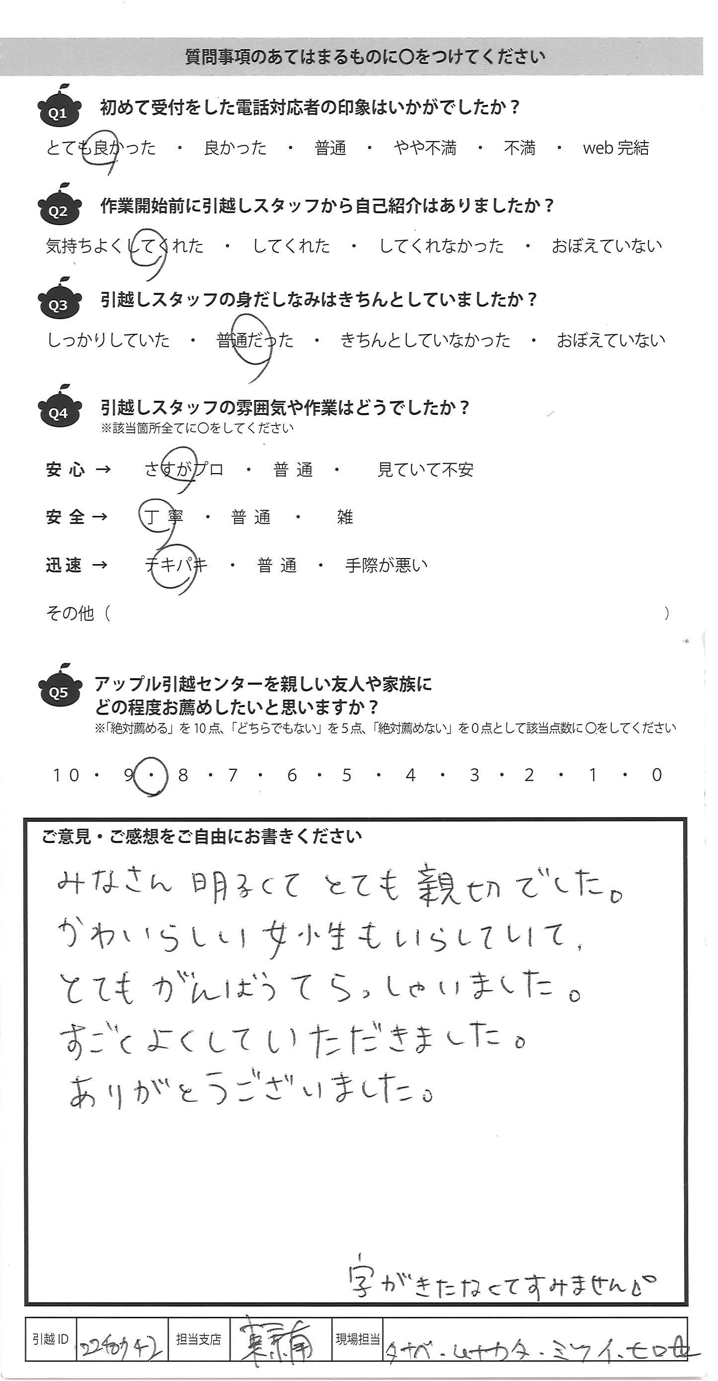 A.短時間で引っ越しが終わり助かりました。暑い中ありがとうございました。