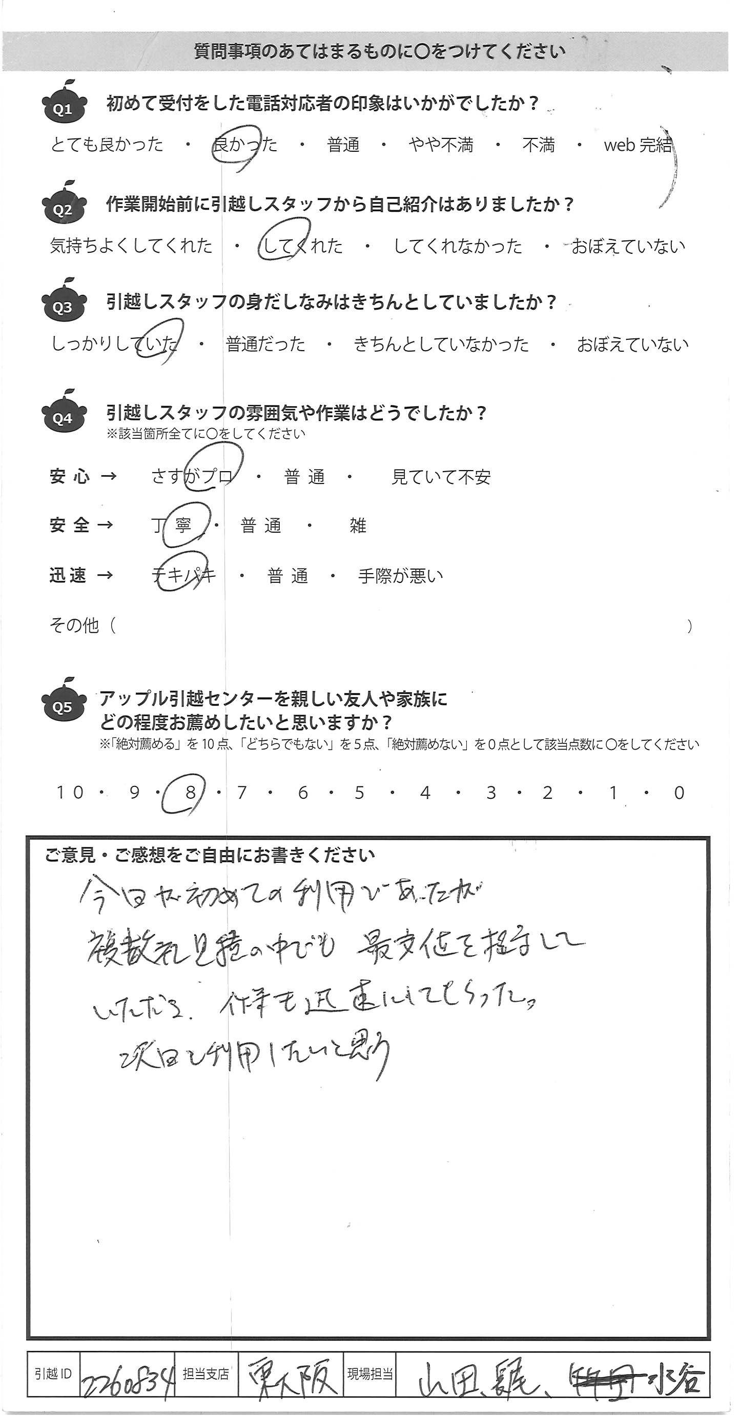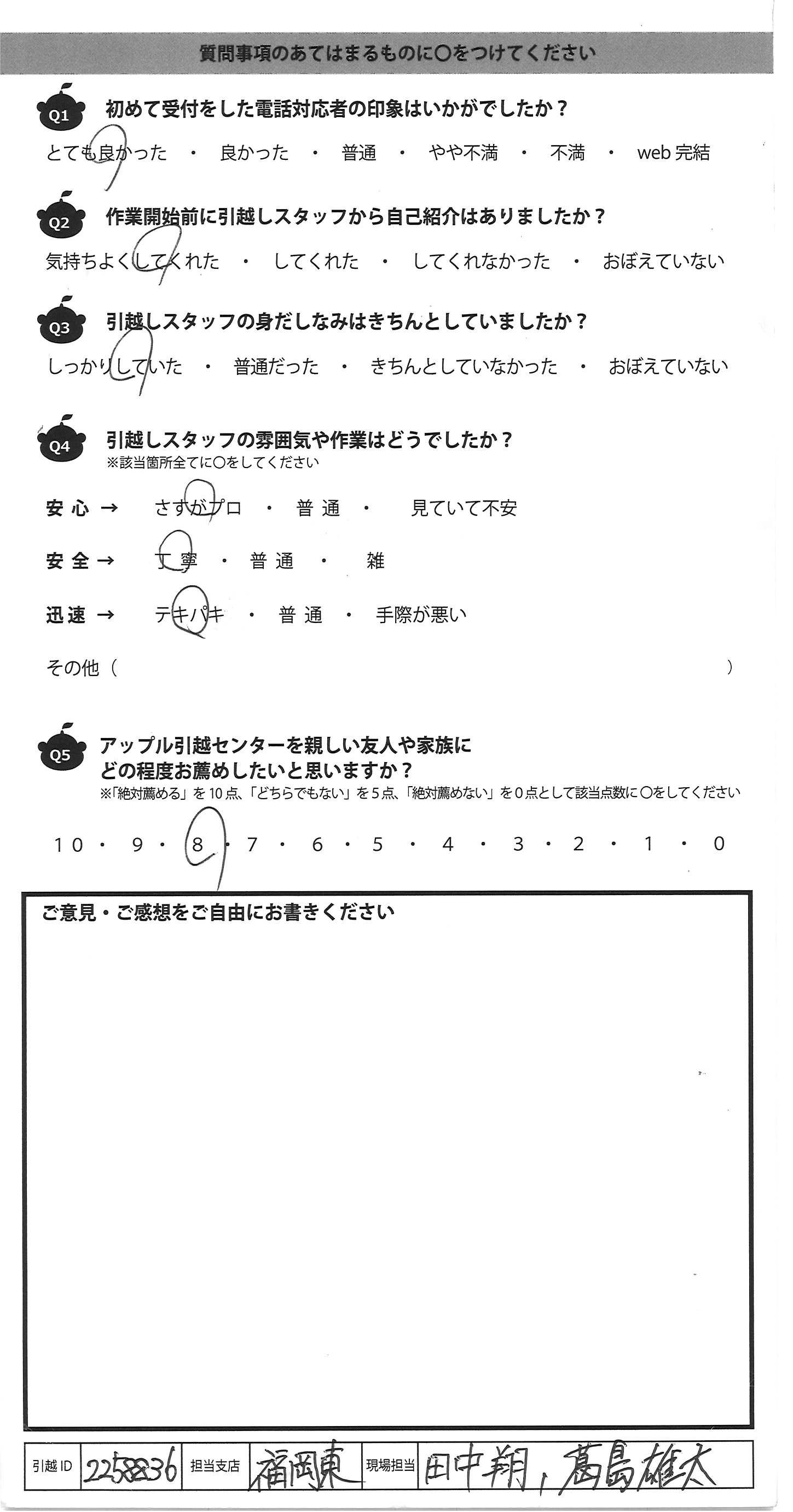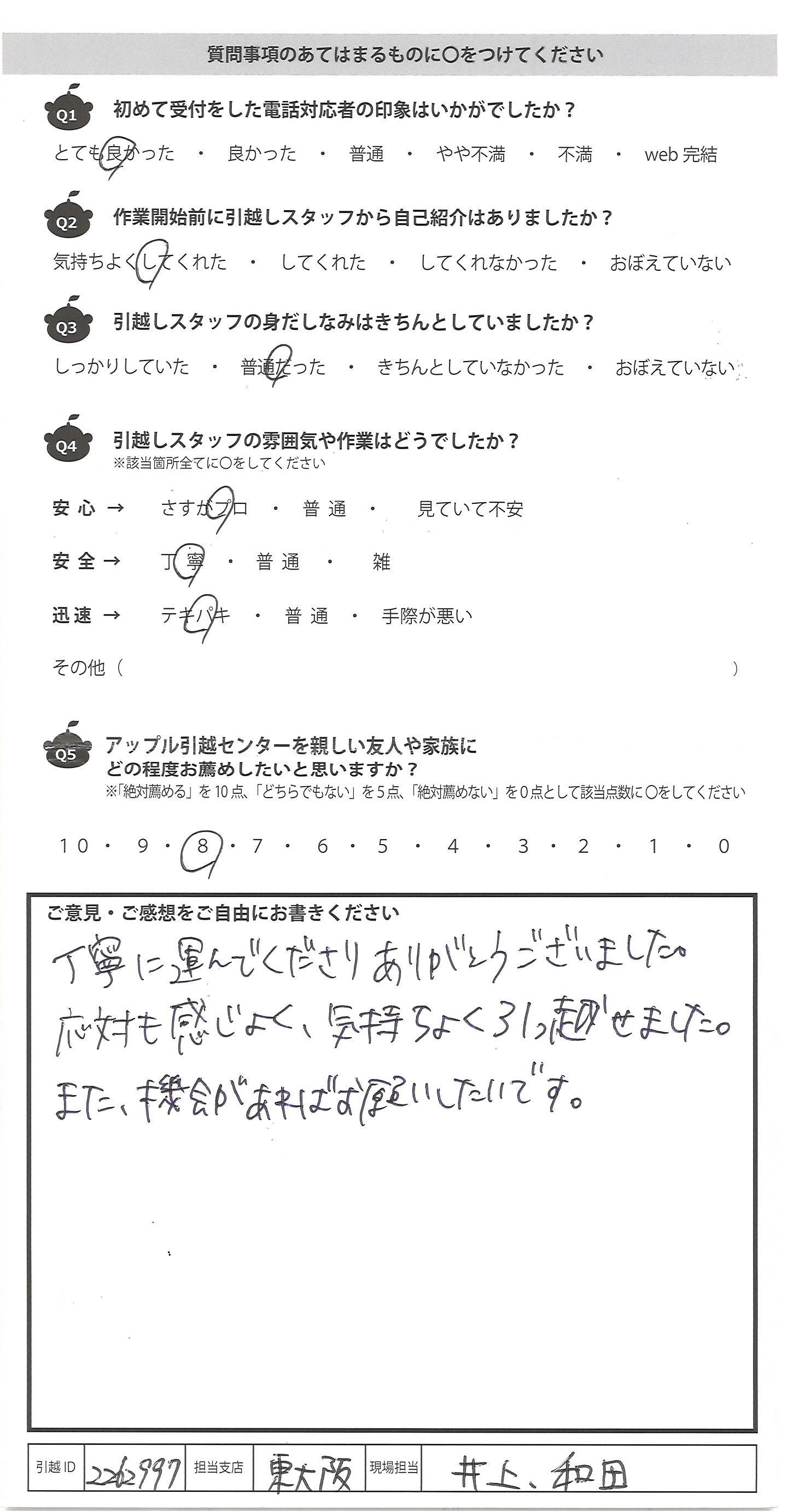 A.丁寧に運んでくださりありがとうございました。 応対も感じよく、気持ちよく引っ越せました。 また、機会があればお願いしたいです。
