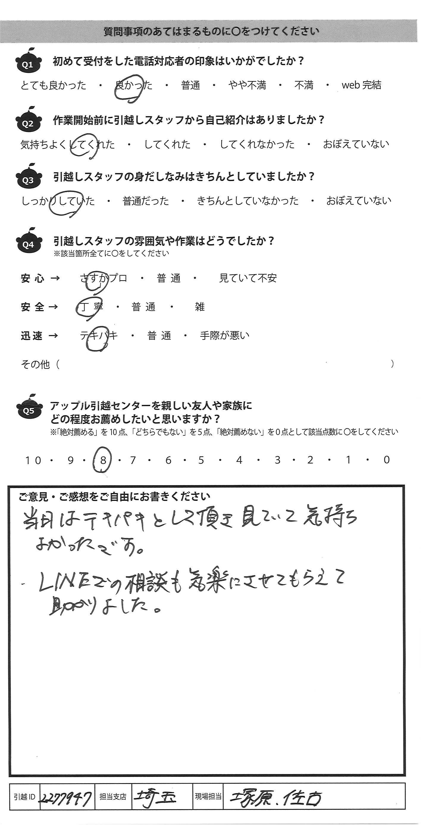 A.当日はテキパキとして頂き見ていて気持ち よかったです。 LINEでの相談も気楽にさせてもらえて 助かりました。