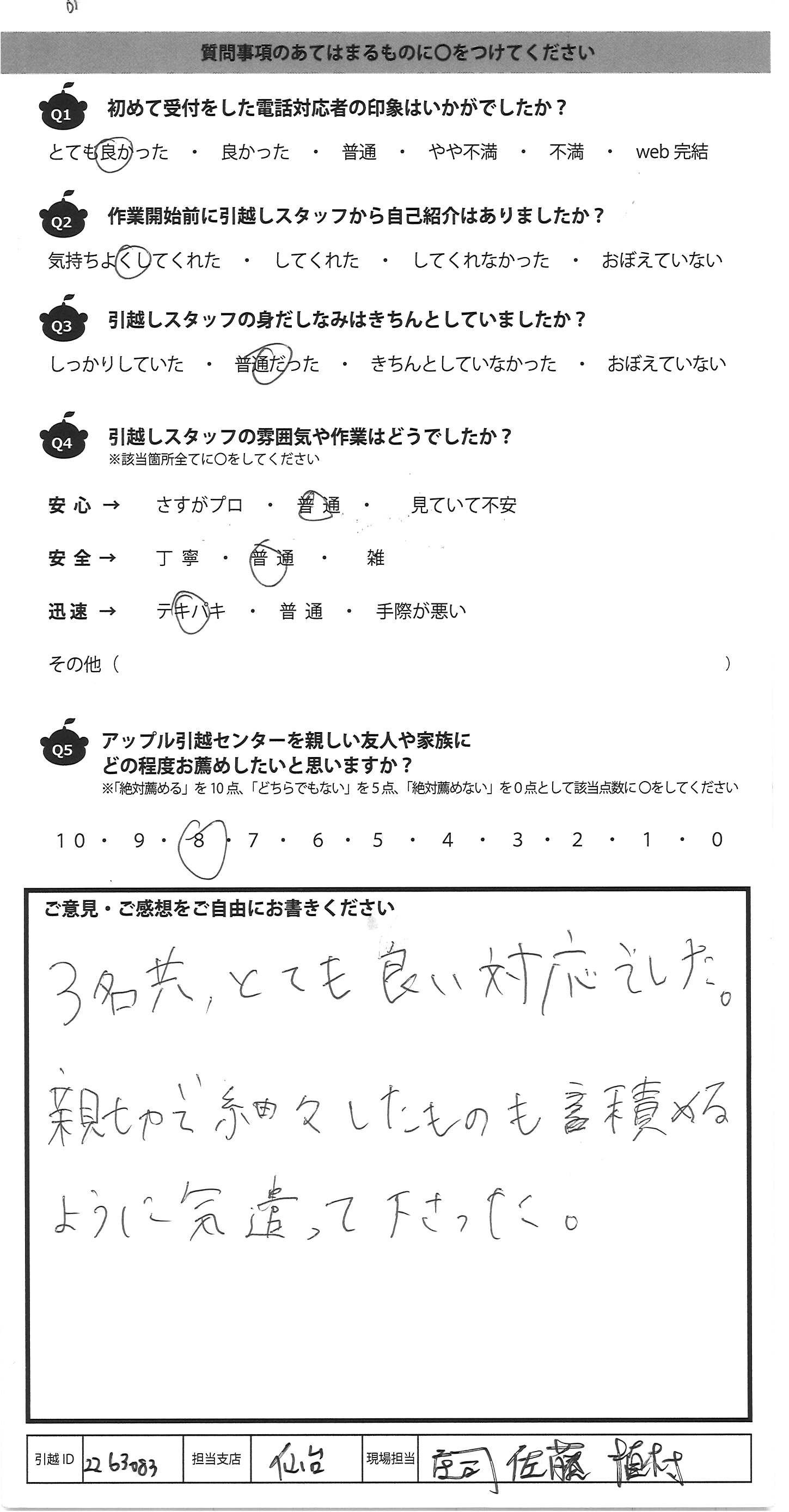 A.お世話になりました。 終始丁寧に対応いただきました。 ただ、新人の方がいる場合は、もう1人人員を追加していただけると尚ありがたく思います。 また引越しの機会があれば、お願いします。
