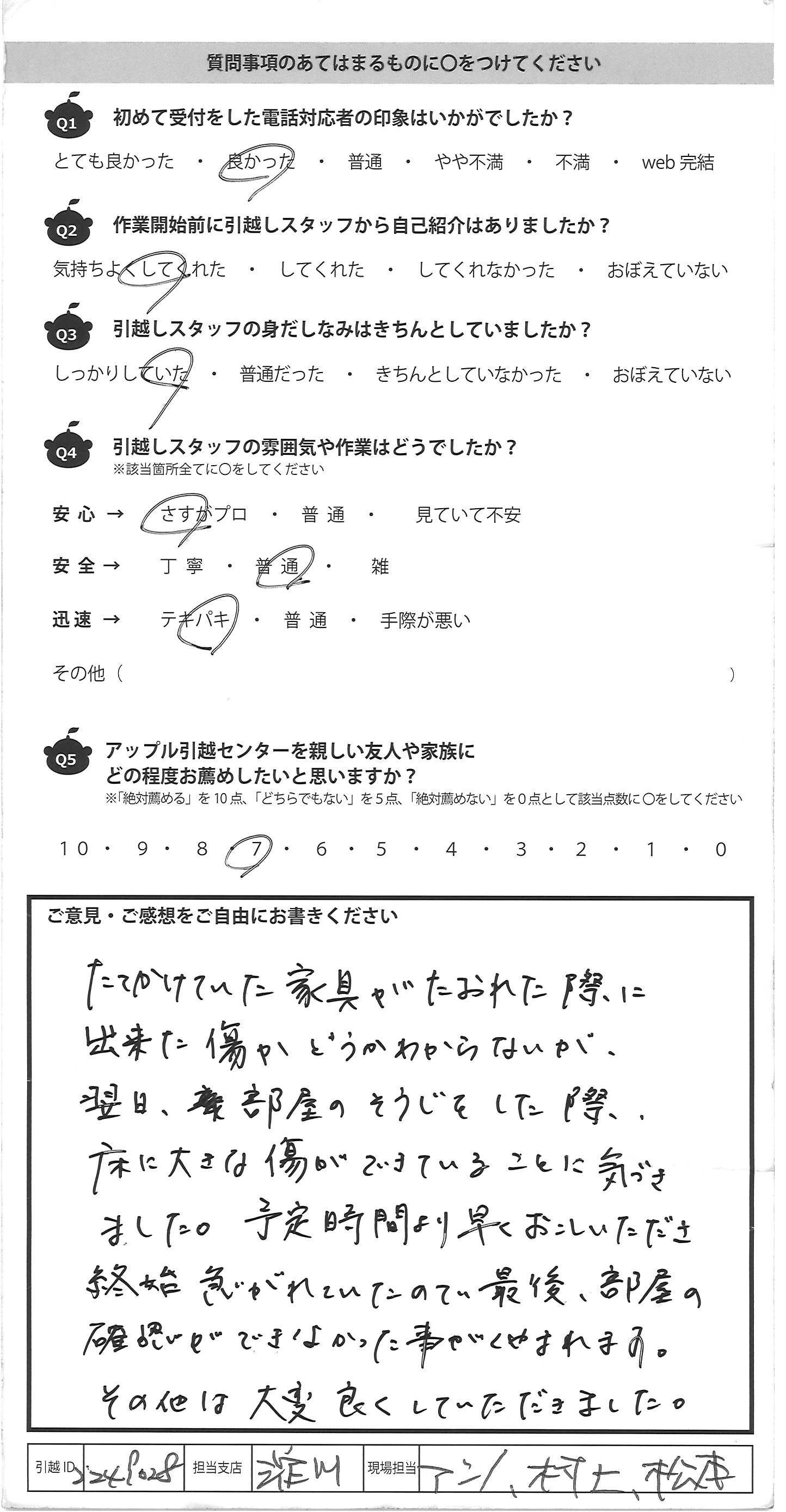 A.たてかけていた家具がたおれた際に 出来た傷かどうかわからないが、 翌日、部屋のそうじをした際、 床に大きな傷ができていることに気づき ました。予定時間より早くおこしいただき 終始急がれていたので最後、部屋の 確認ができなかった事がくやまれます。 その他は大変良くしていただきました。