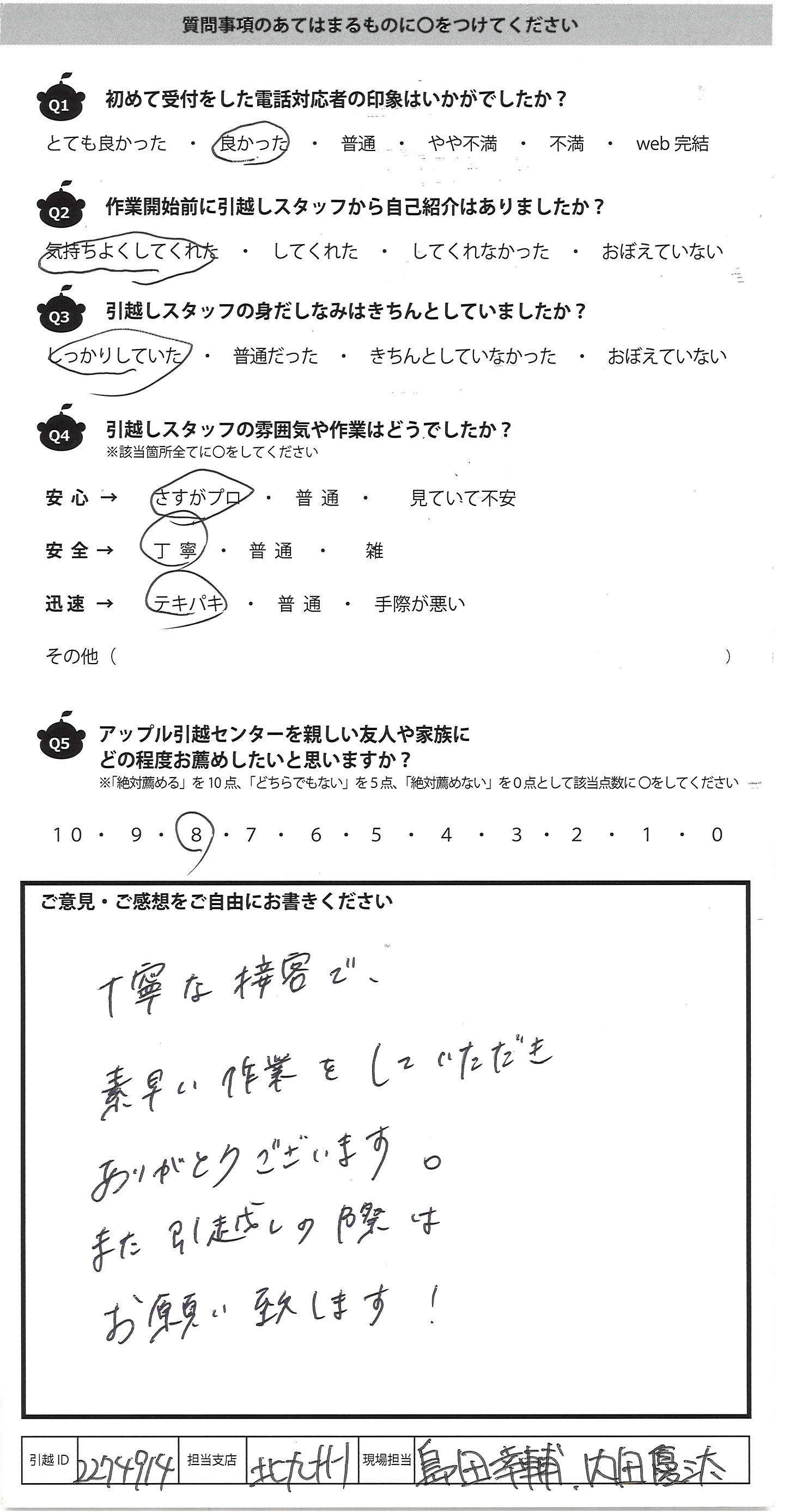 A.丁寧な接客で、 素早い作業をしていただき ありがとうございます。 また引越しの際は お願い致します!
