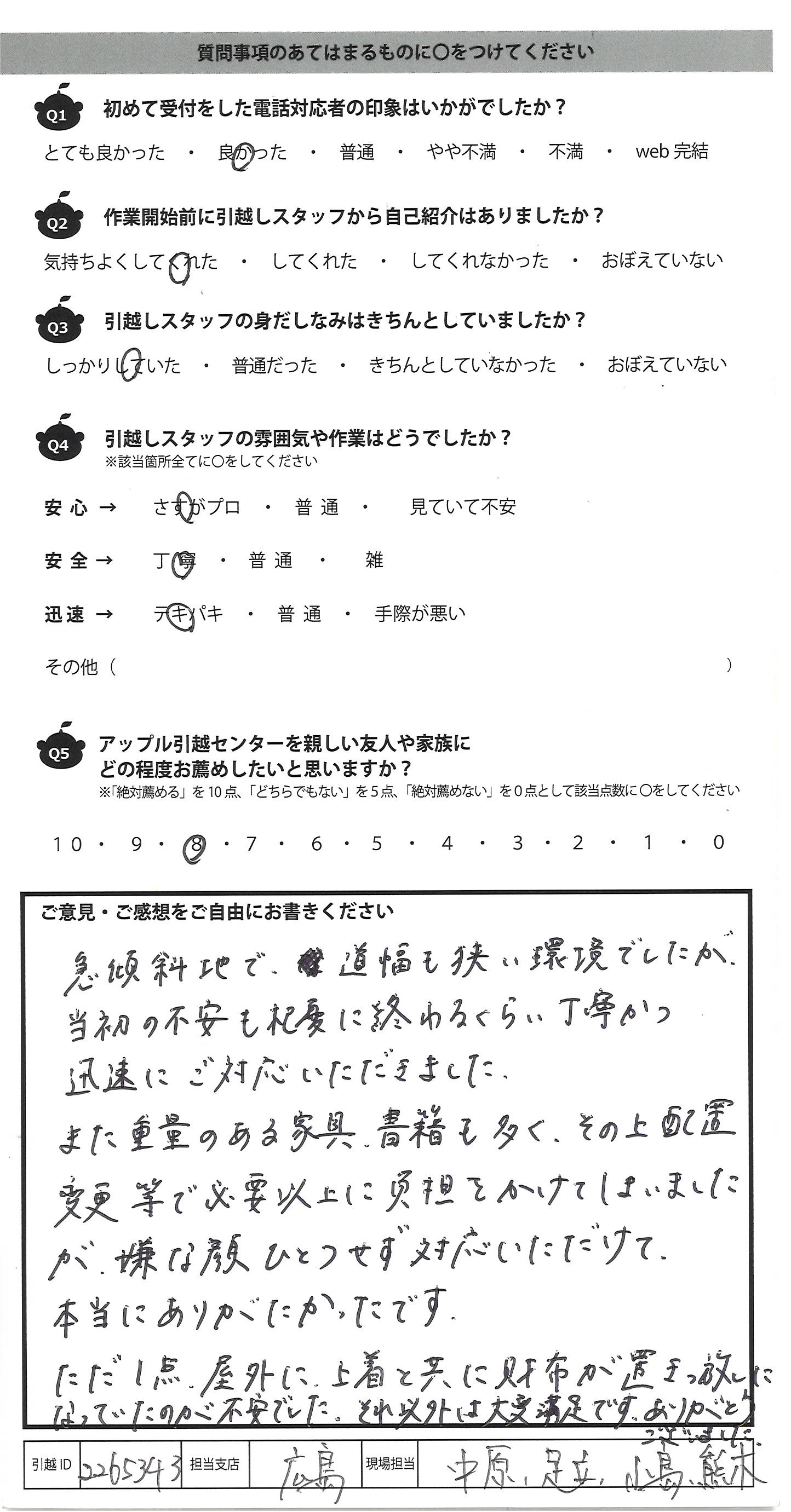 A.急傾斜地で、道幅も狭い環境でしたが 当初の不安も杞憂に終わるくらい丁寧かつ 迅速にご対応いただきました。 また重量のある家具、書籍も多く、その上配置 変更等で必要以上に負担をかけてしまいました が、嫌な顔ひとつせず対応いただけて、 本当にありがたかったです。 ただ1点、屋外に上着と共に財布が置きっ放しに なっていたのが不安でした。それ以外は大変満足です。ありがとうございました。