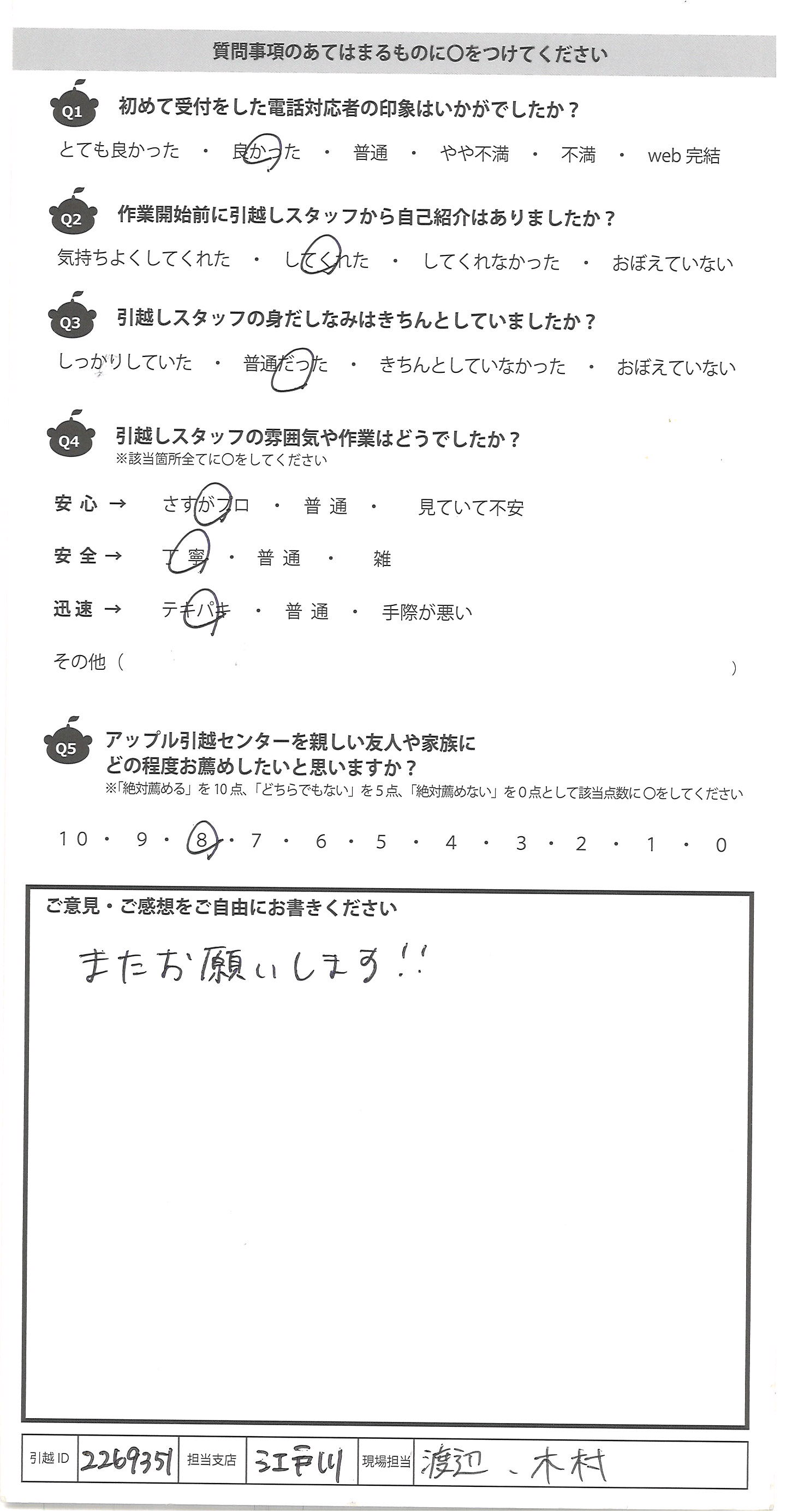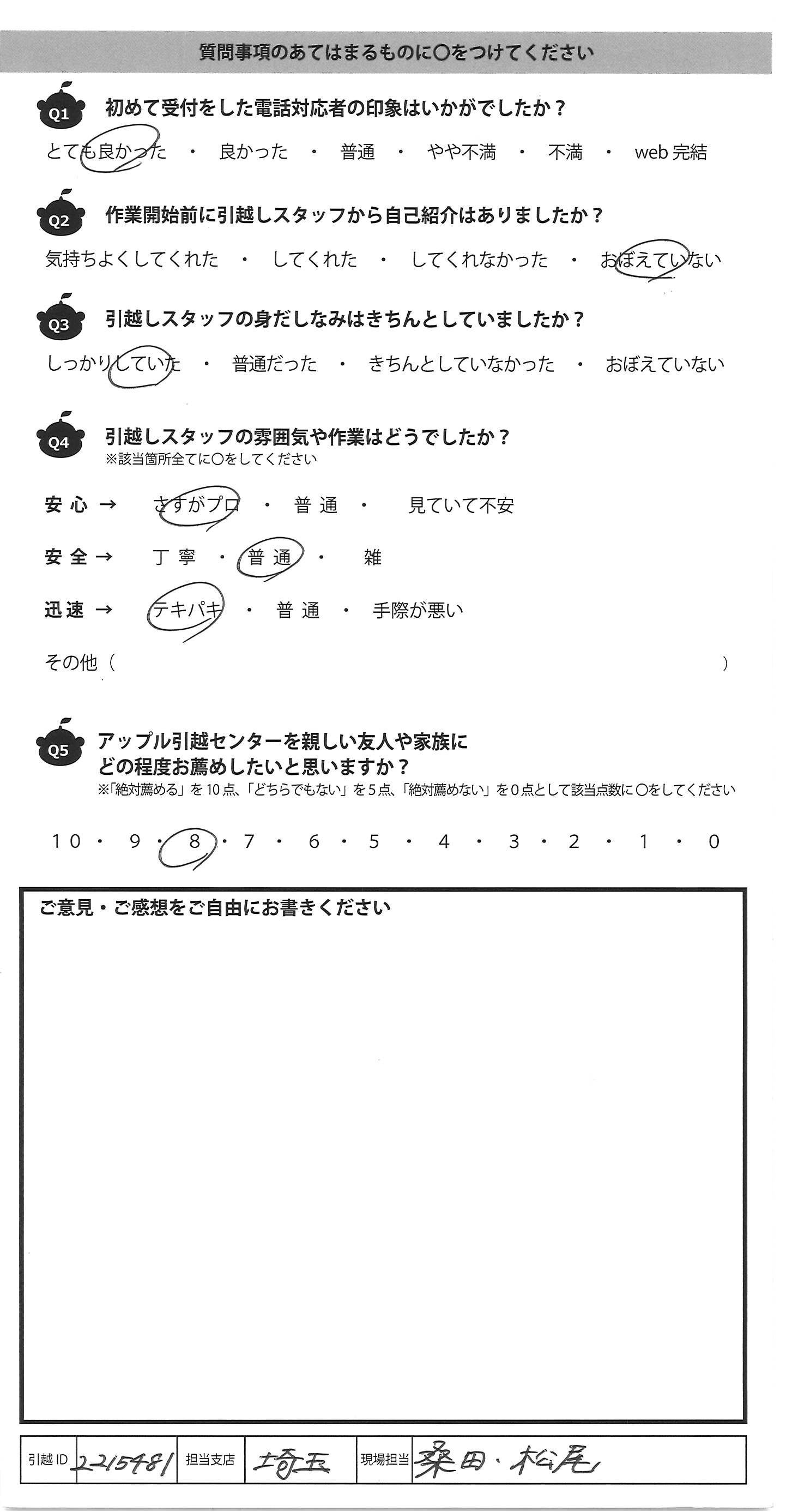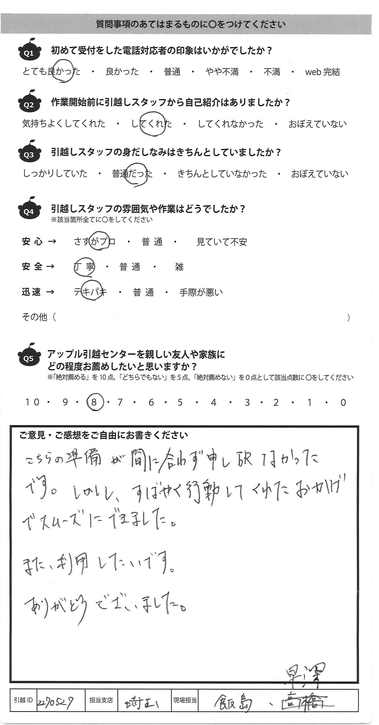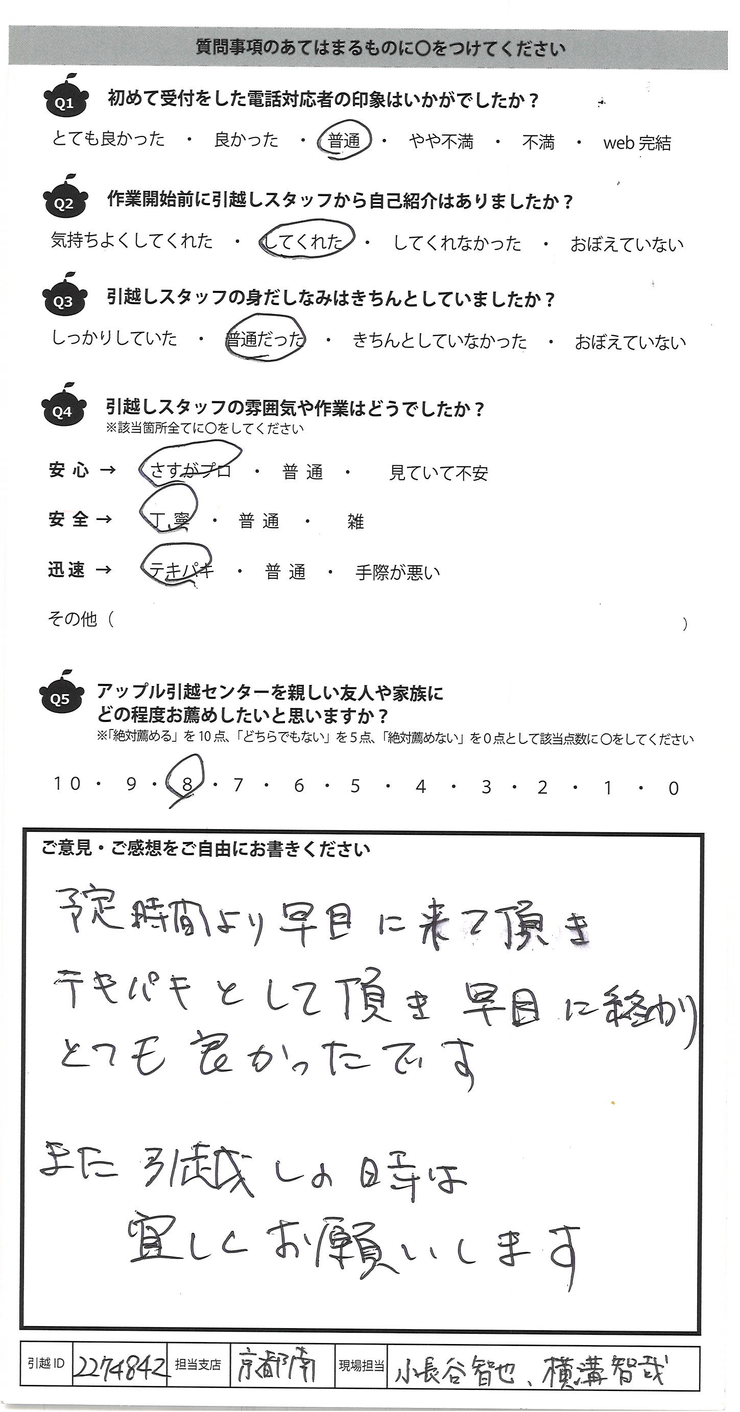 A.予定時間より早目に来て頂き テキパキとして頂き早目に終わり とても良かったです また引越しの時は 宜しくお願いします