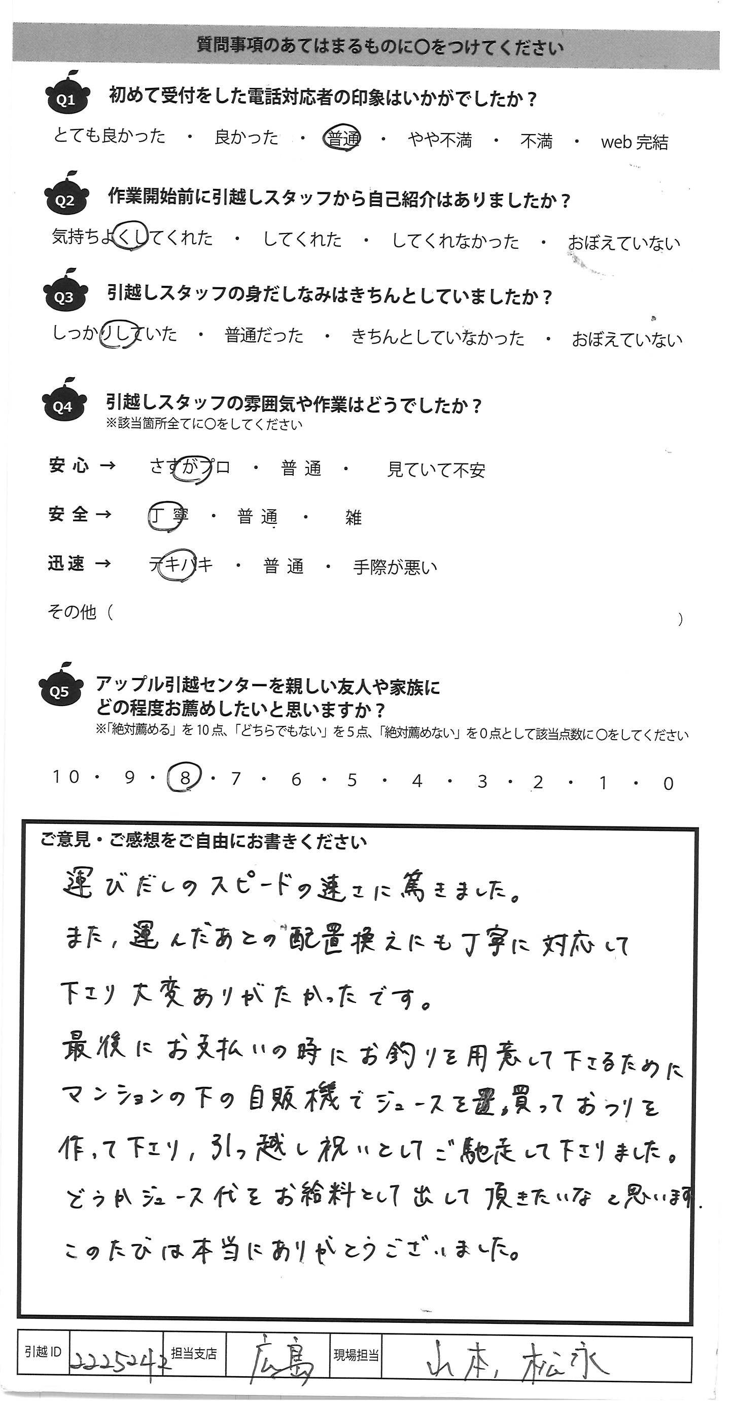 A.運びだしのスピードの速さに篤きました。 また、運んだあとの配置換えにも丁寧に対応して 下さり大変ありがたかったです。 最後にお支払いの時にお釣りを用意して下さるために マンション下の自販機でジュースを買っておつりを 作って下さり、引っ越し祝いとしてご馳走して下さりました。 どうかジュース代をお給料として出して頂きたいなと思います。 このたび本当にありがとうございました。