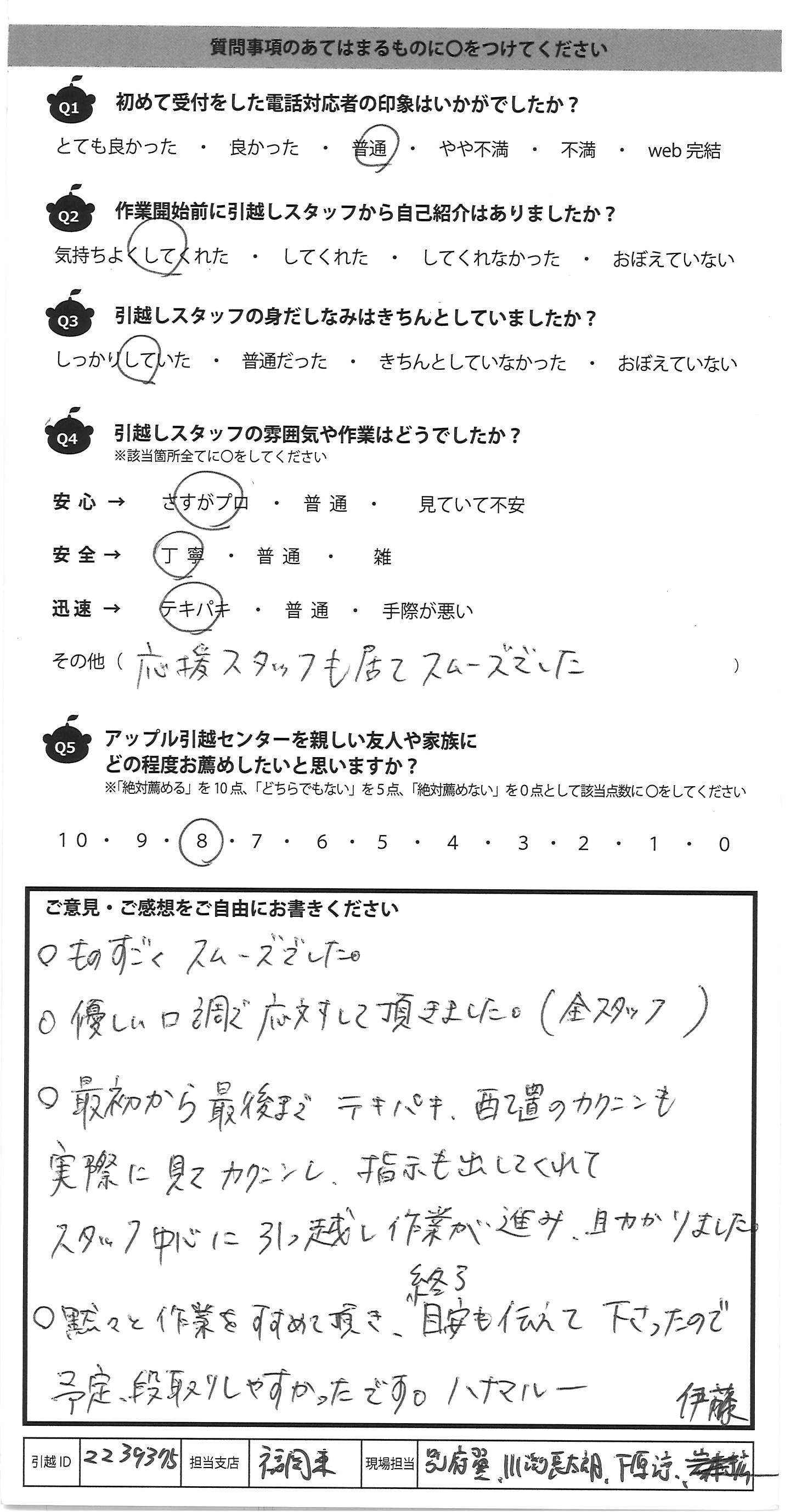 A.・ものすごくスムーズでした。 ・優しい口調で対応して頂きました。(全スタッフ) ・最初ら最後までカクニンし、指示も出してくれて スタッフ中心に引っ越し作業が進み、助かりました。 ・黙々と作業をすすめて頂き、終了目安も伝えて下さったので 予定、段取りしやすかったです。ハナマルー