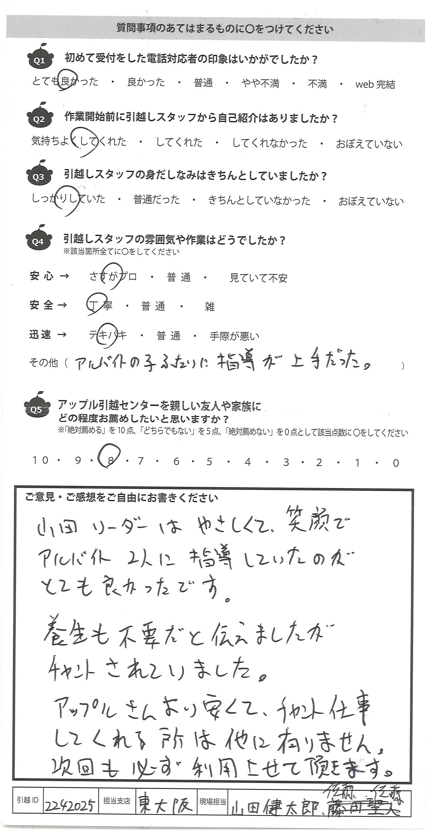 A.山田リーダーはやさしくて、笑顔で アルバイト2人に指導していたのが とても良かったです。 養生も不要だと伝えましたが チャントされていました。 アップルさんより安くて、チャント仕事 してくれる所は他に有りません。 次回も必ず利用させて頂きます。
