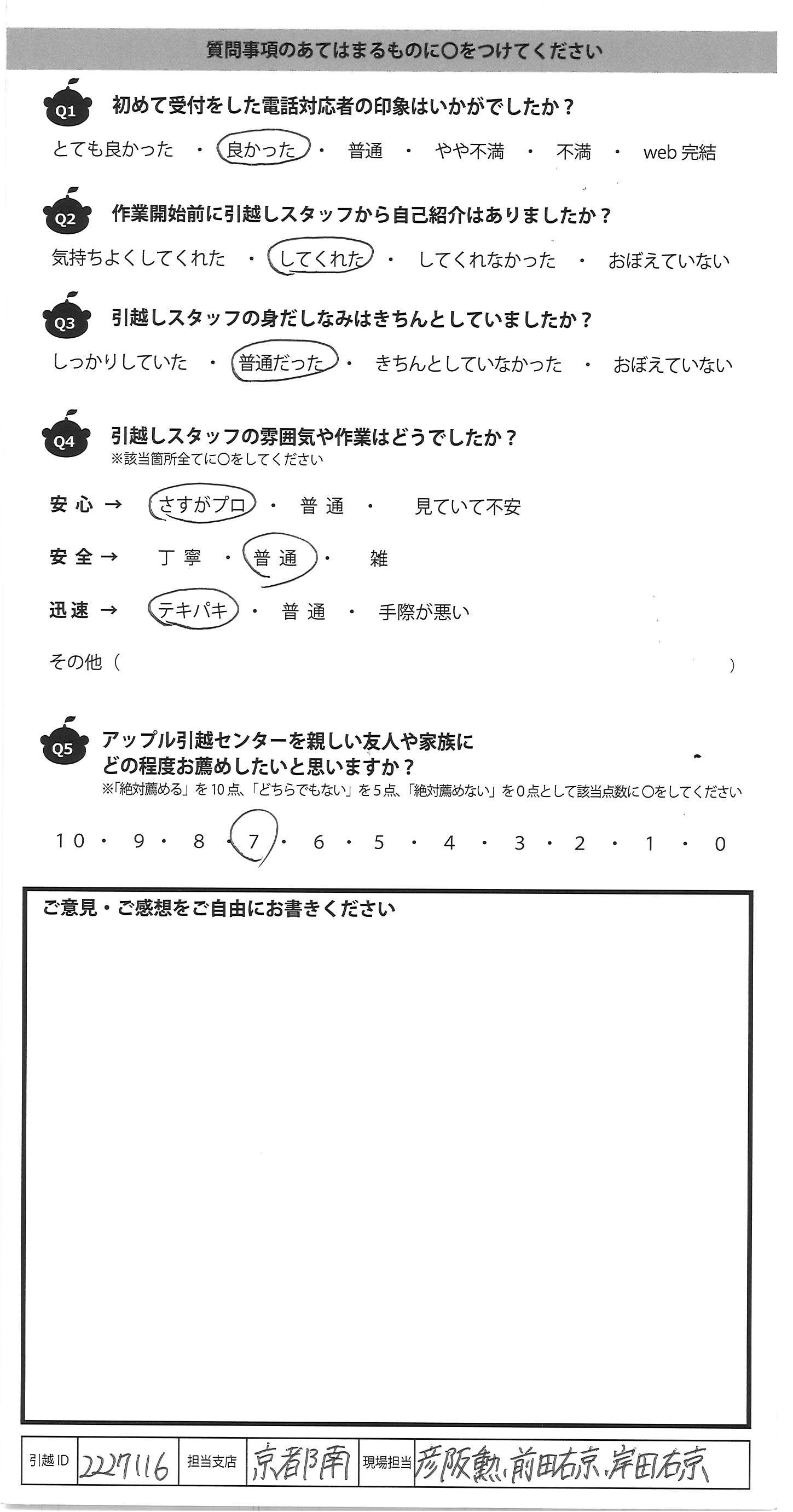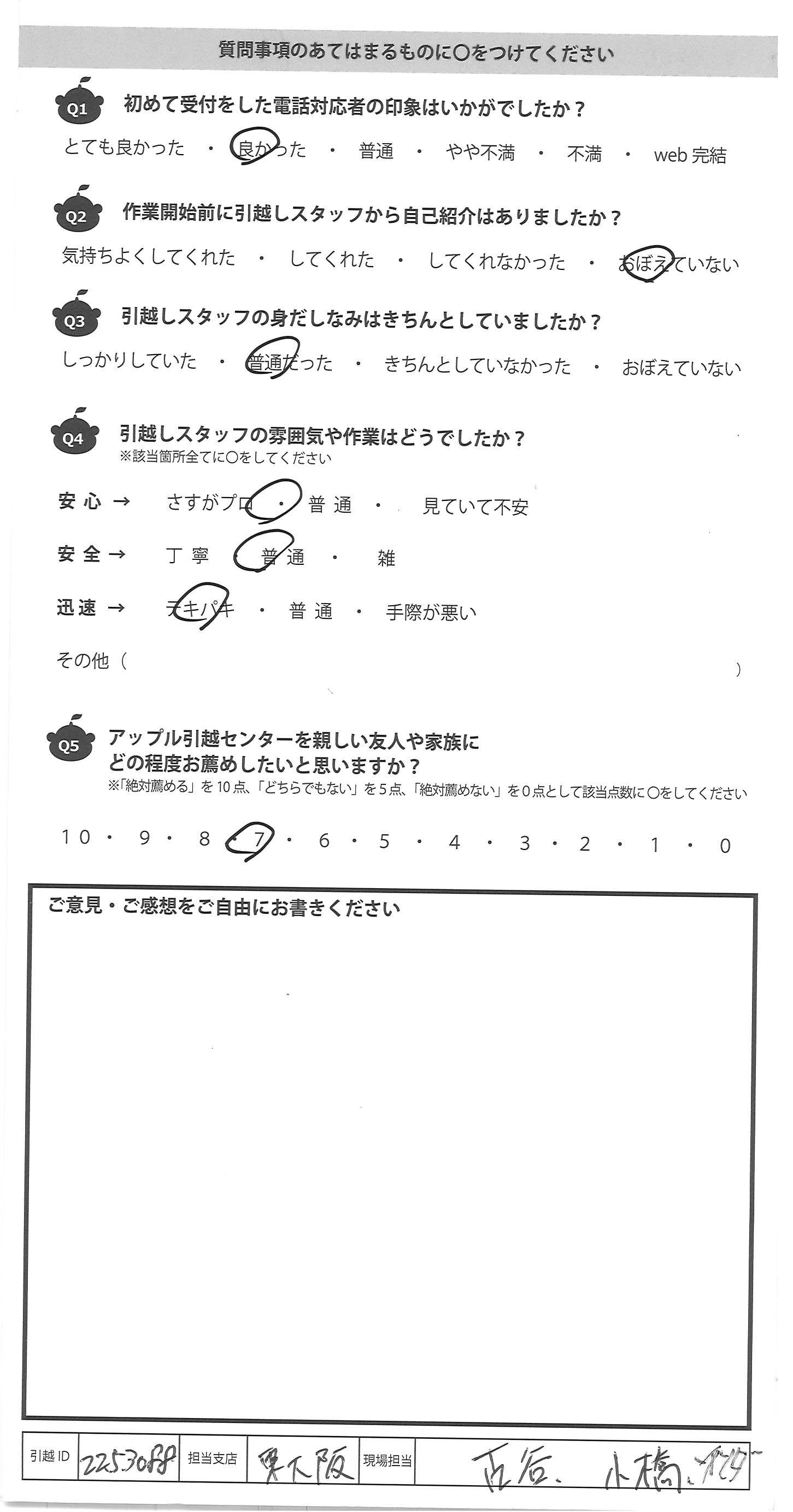 A.引っ越しの片付けがなかなか進まなくて、アンケートが遅くなり申し訳ありません。 今回、最初に「一切の値引きをしないというその自信がどの程度のものなのか試してみたい」という理由で、他にももっと安くしてくれる所もあったのですが御社にお願いしました。 見積もりもWEB、引っ越し用段ボールも宅急便で届くという(これは初めての経験でちょっと衝撃的でした)徹底したマンパワー削減で、今時だなーと思う反面、引っ越し当日まで誰にも会わないことにちょっとだけ不安感はありました。 引っ越し作業はテキパキで概ね満足です。 では他の引っ越し業者さんと比べて何が違うのかと言われると、明確な差は正直わかりませんでした。なるほど、ここが違うのねという差別化がはかられたら、またお願いしたいと思う理由になるのかなと思います。 引っ越しはまた必ずすると思いますので、その際にもまた候補に上げさせてもらいます。