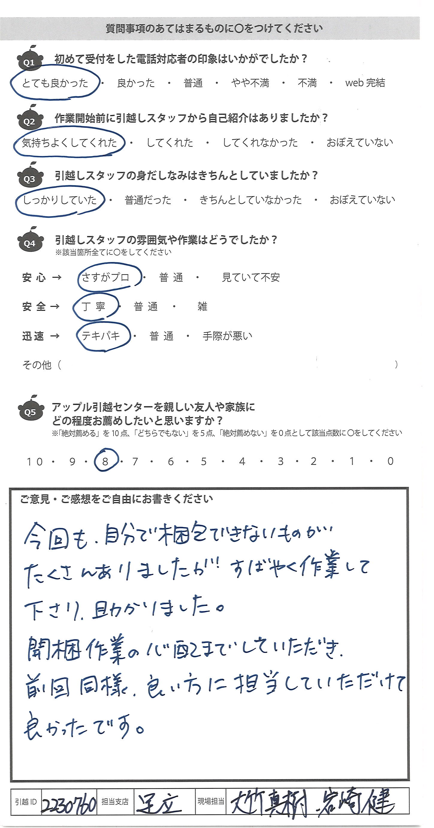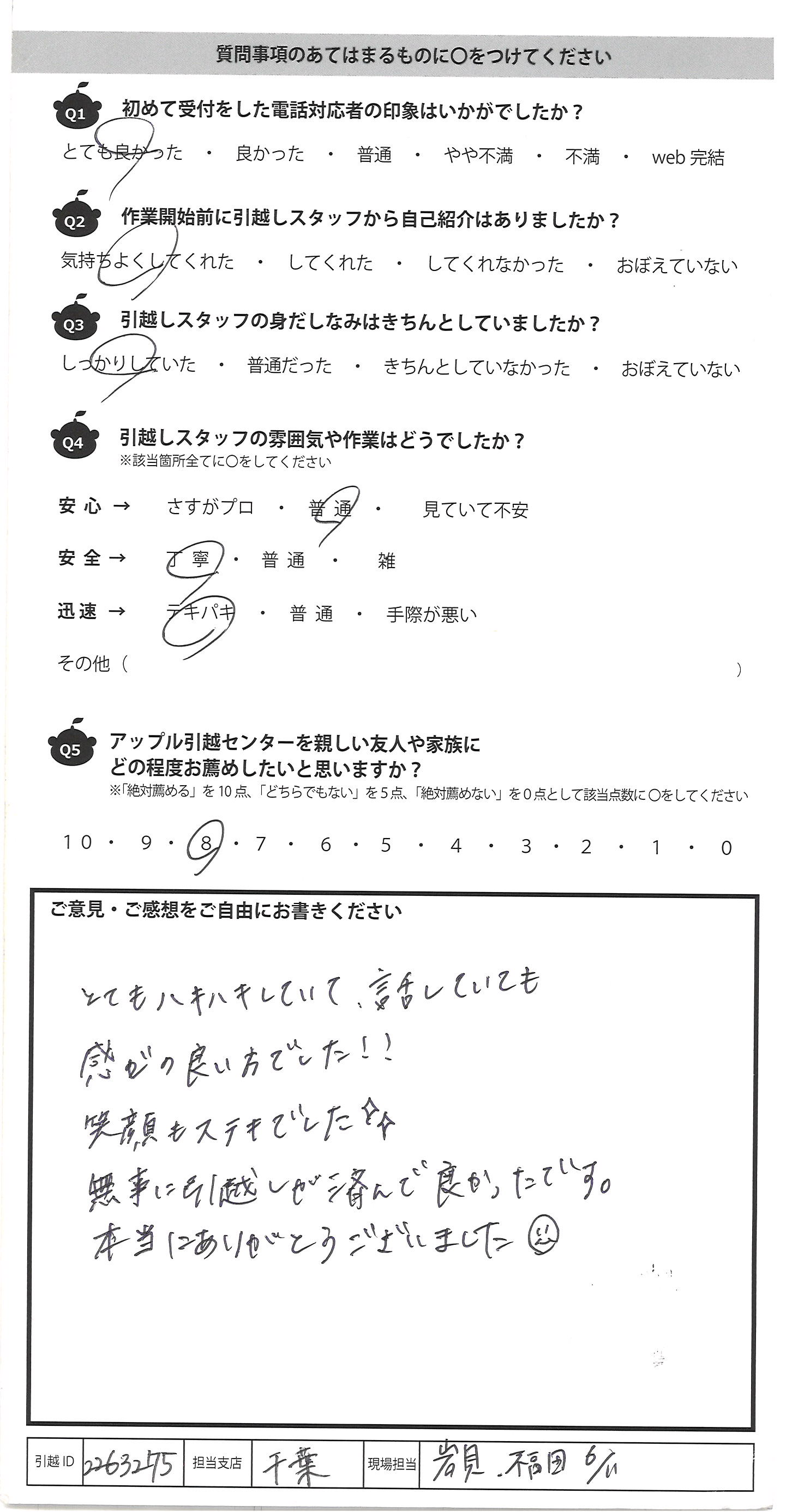 A.とてもハキハキしていて、話していても 感じの良い方でした!! 笑顔もステキでした 無事に引越しが済んで良かったです。 本当にありがとうございました