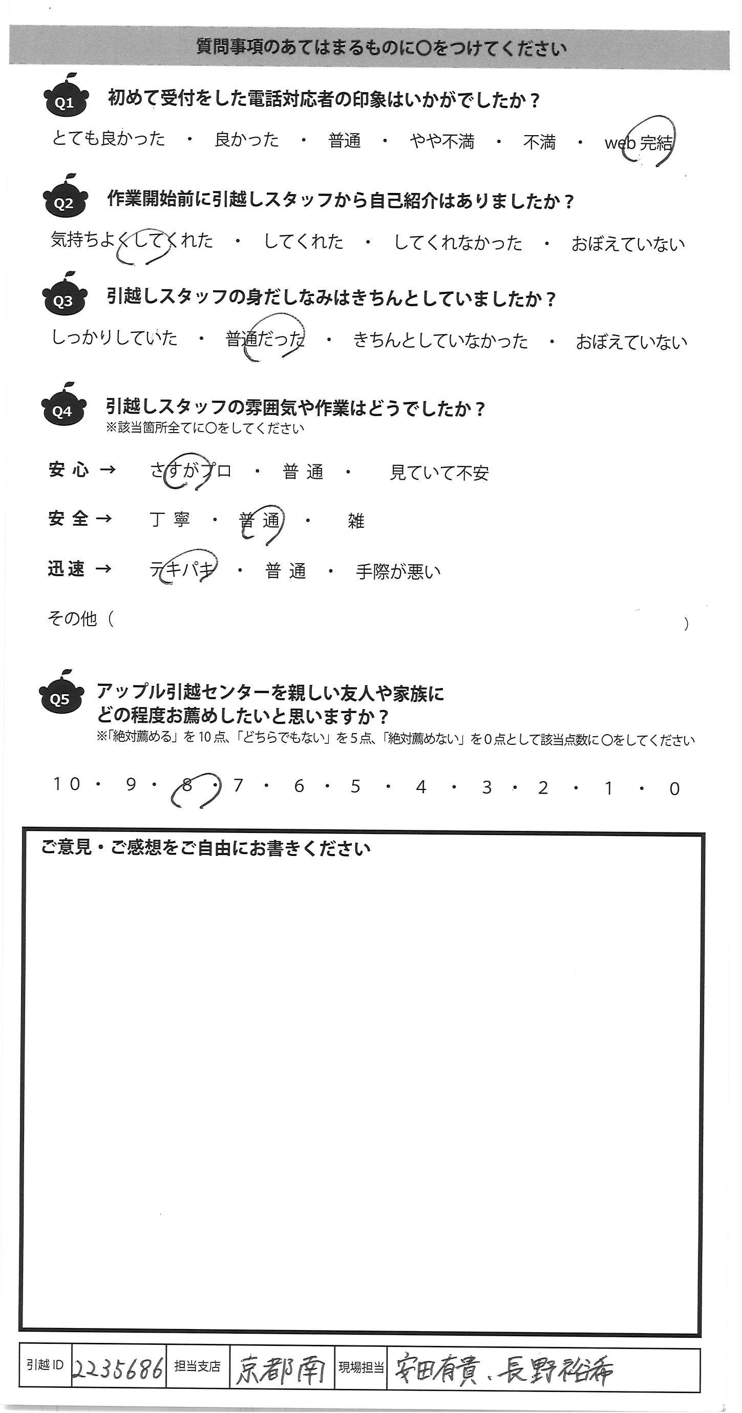 A.Web完結させての依頼でした。 自分で荷物を入力しますが、該当しない項目の荷物が多く(食洗機やガステーブル、トースター、キャスター付ワゴン、キャリーケース、組立家具など)、何度もチャットで依頼する事となりました。 実際に積みきれるのか?は私では分かりませんので不安でしたし、不便に感じました。 家電品は出来る限り元の箱に収めましたが、全ての箱を取っておける訳では無いので、段ボールに収まらないサイズの家電等を梱包して頂く事になってしまい申し訳無かったです。 当日に作業して下さった方々が、気持ち良く梱包し積み込んで下さったので感謝しかありません。