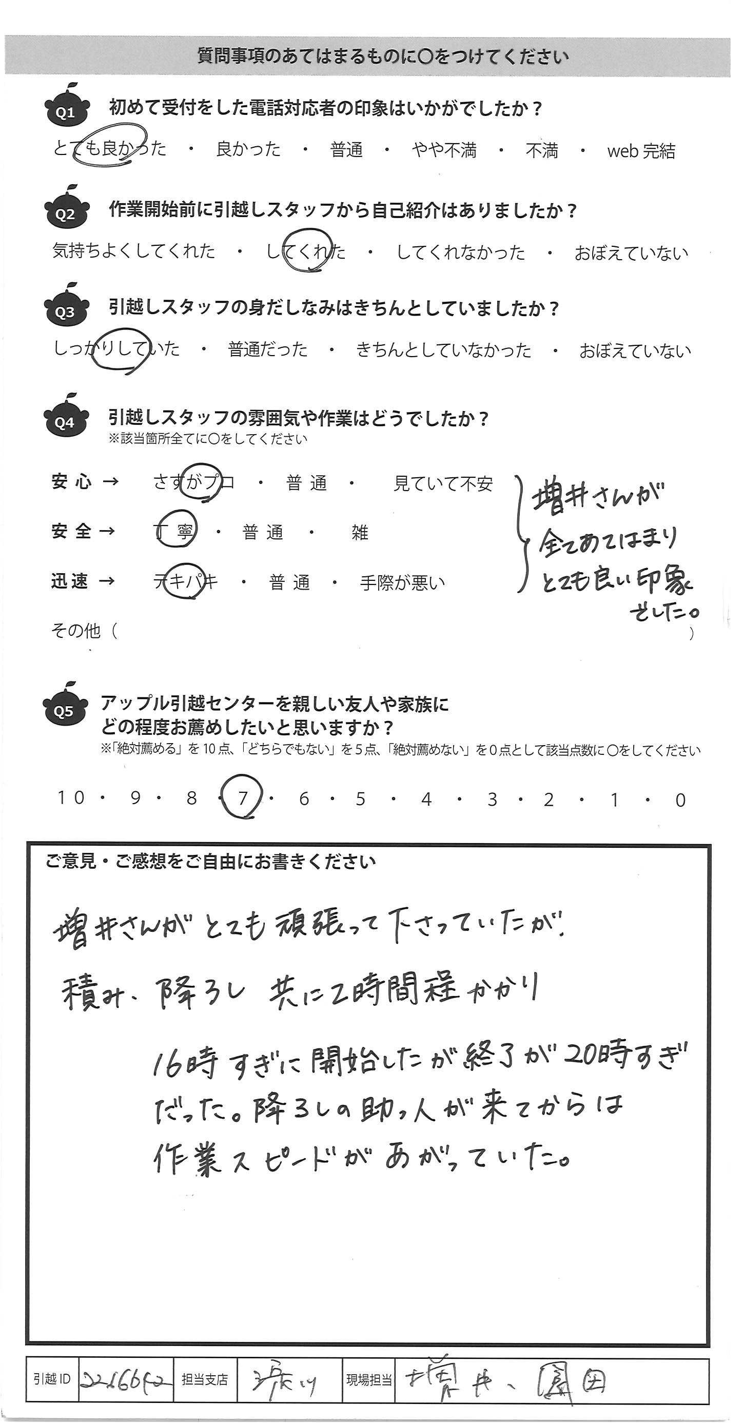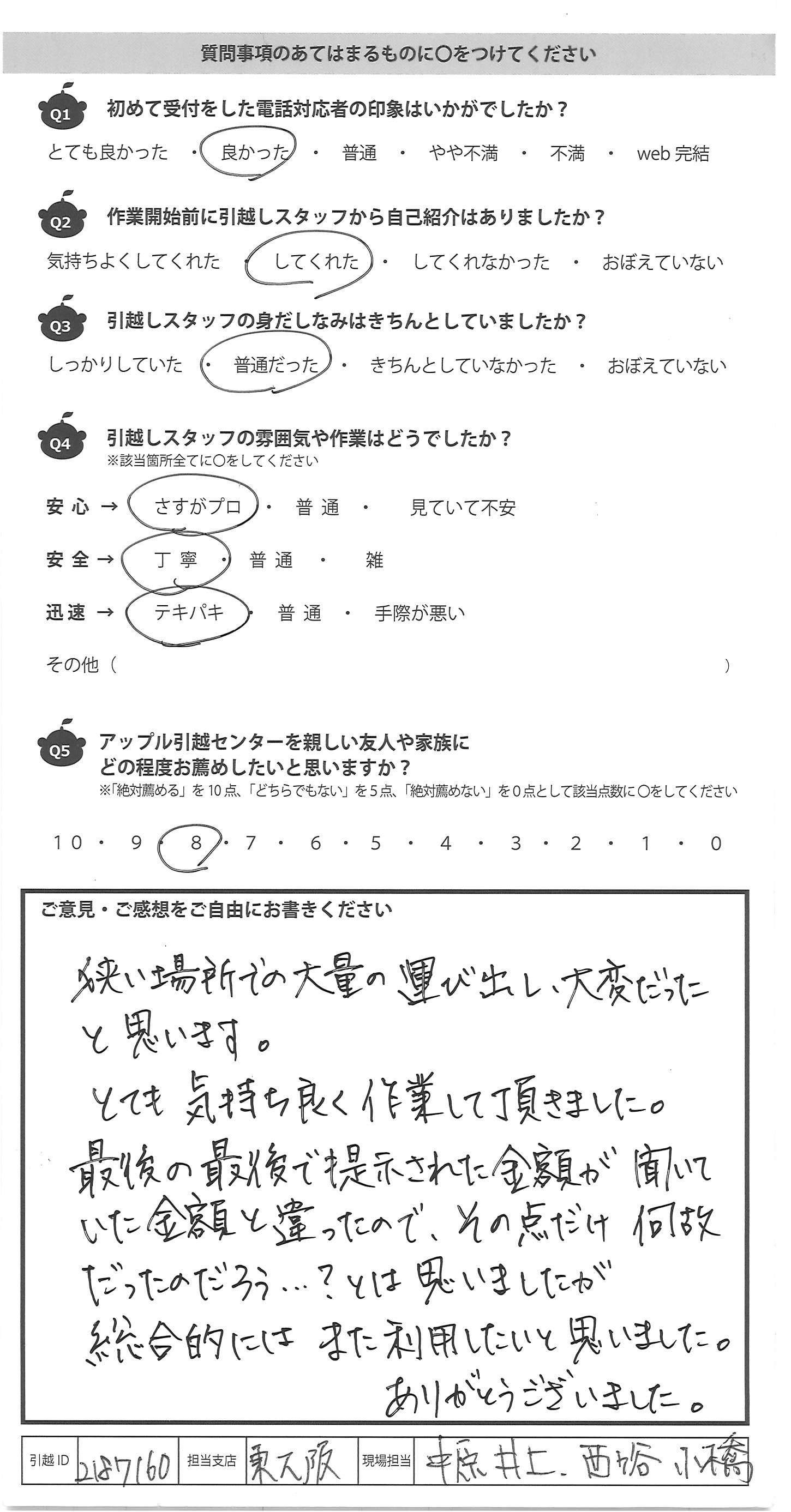 A.狭い場所での大量の運び出し、大変だった と思います。 とても気持ち良く作業して頂きました。 最後の最後で提示された金額が聞いて いた金額と違ったので、その点だけ何故 だったのだろう…?とは思いましたが 総合的にはまた利用したいと思いました。 ありがとうございました。