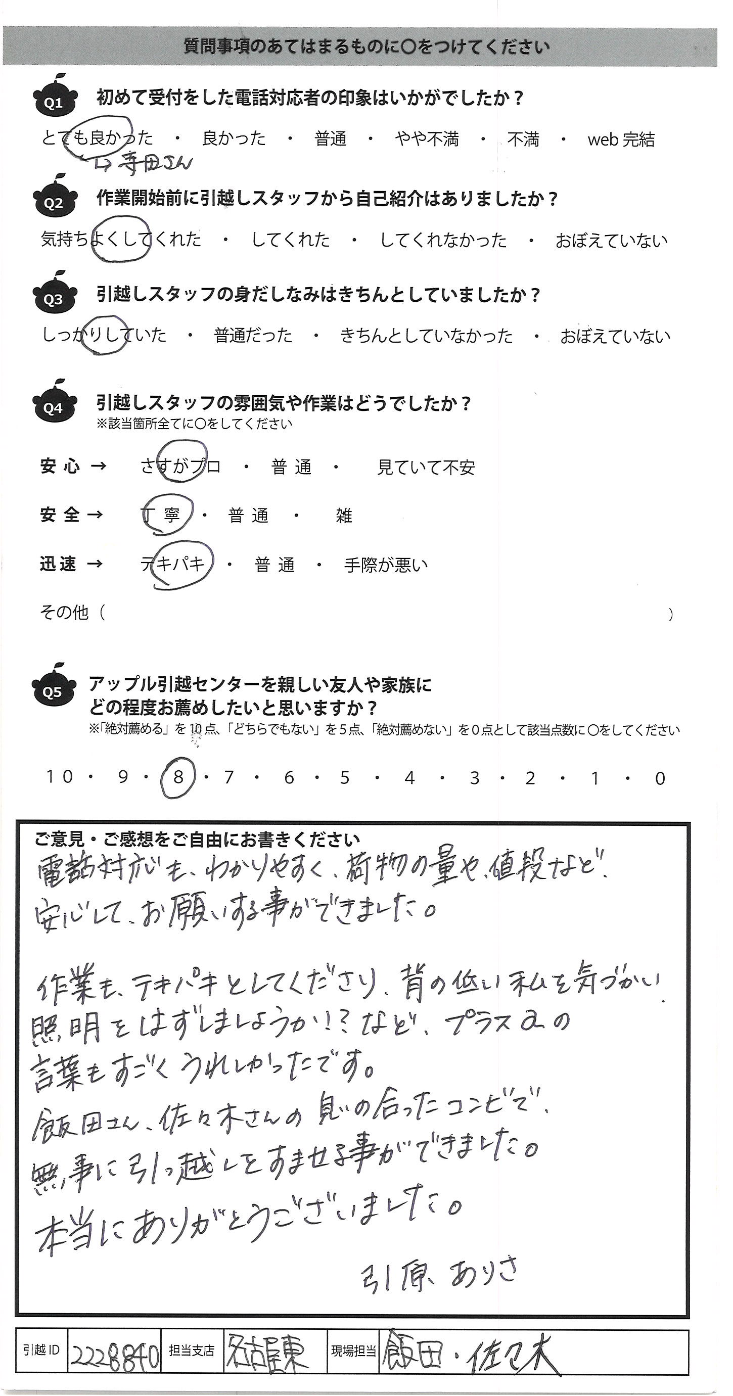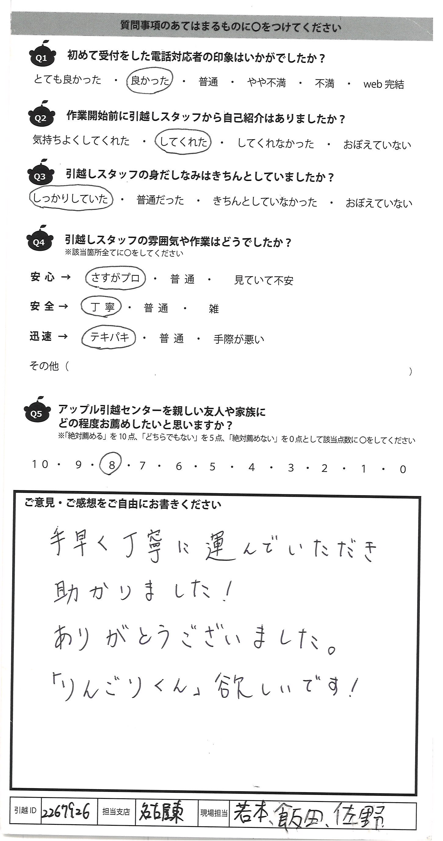 A.電話対応も、わかりやすく、荷物の量や、値段など、 安心して、お願いする事ができました。 作業も、テキパキとしてくださり、背の低い私を気づかい、 照明をはずしましょうか!?など。プラスaの 言葉もすごくうれしかったです。 飯田さん、佐々木さんの息の合ったコンビで、 無事に引っ越しをすませる事ができました。 本当にありがとうございました。