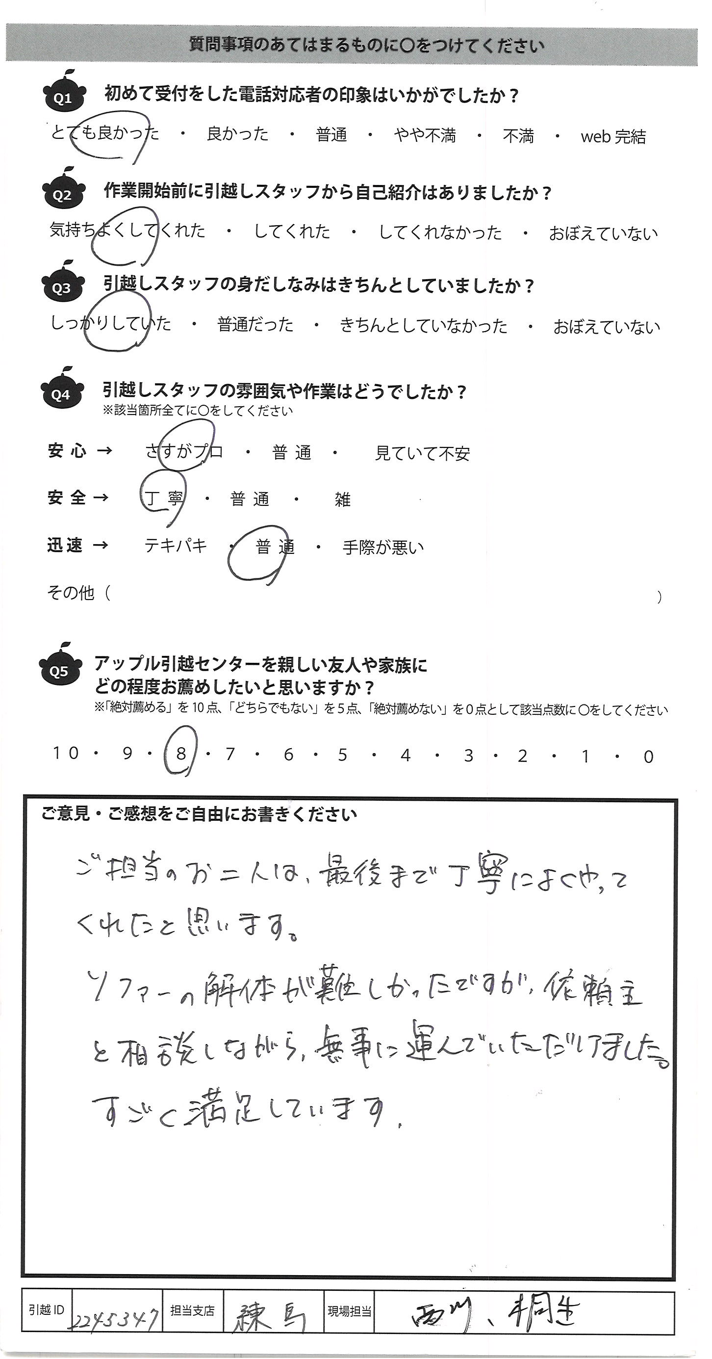 A.ご担当のお二人は、最後まで丁寧によくやって くれたと思います。 ソファーの解体が難しかったですが、依頼主 と相談しながら、無事に運んでいただけました。 すごく満足しています。