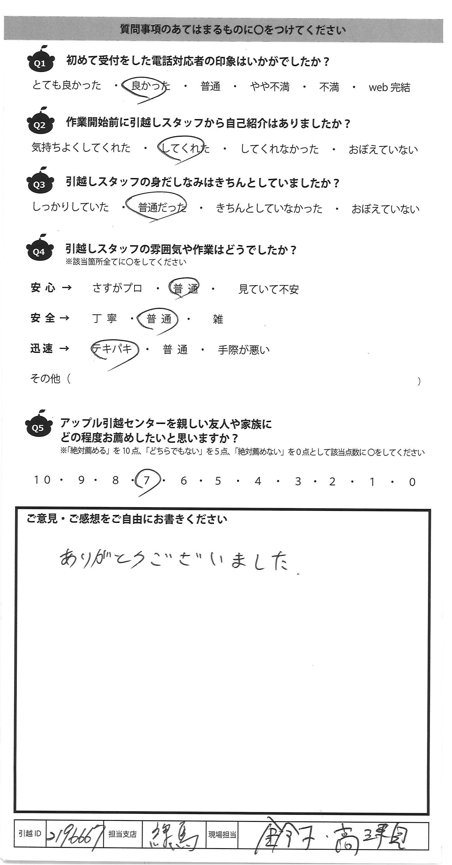 A.さすがプロ!と思うことがたくさんで、初めての引越しでしたが無事に終えることができてよかったです。どうもありがとうございました。