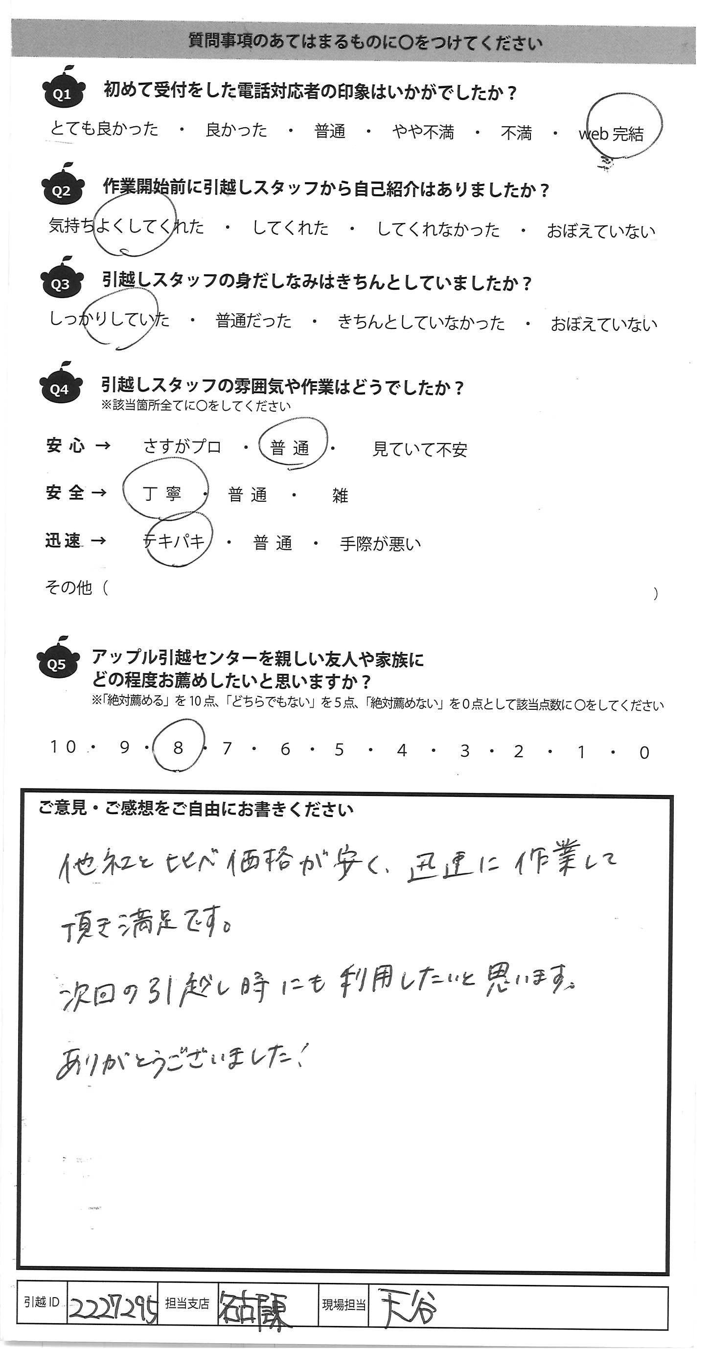 A.他社と比べ価格が安く、迅速に作業して 頂き満足です。 次回の引越し時にも利用したいと思います。 ありがとうございました!
