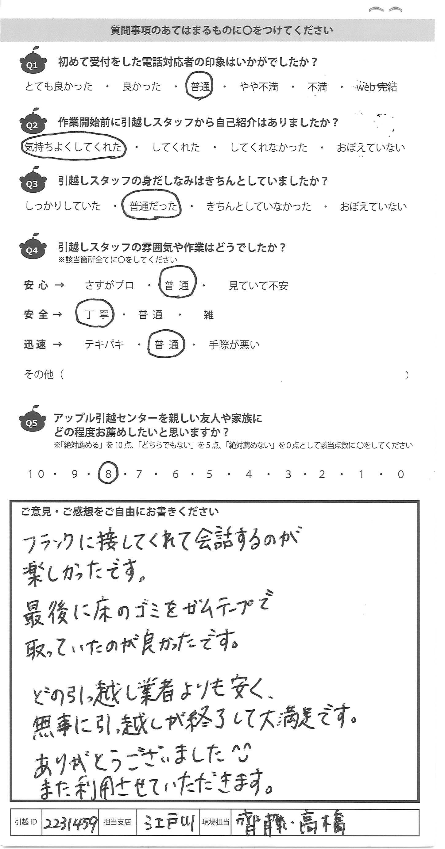 A.フランクに接してくれて会話するのが 楽しかったです。 最後に床のゴミをガムテープで 取っていたのが良かったです。 どの引っ越し業者よりも安く、 無事に引っ越しが終了して大満足です。 ありがとうございました また利用させていただきます。